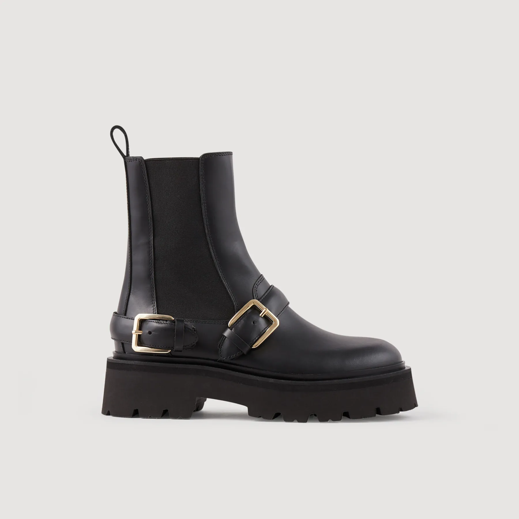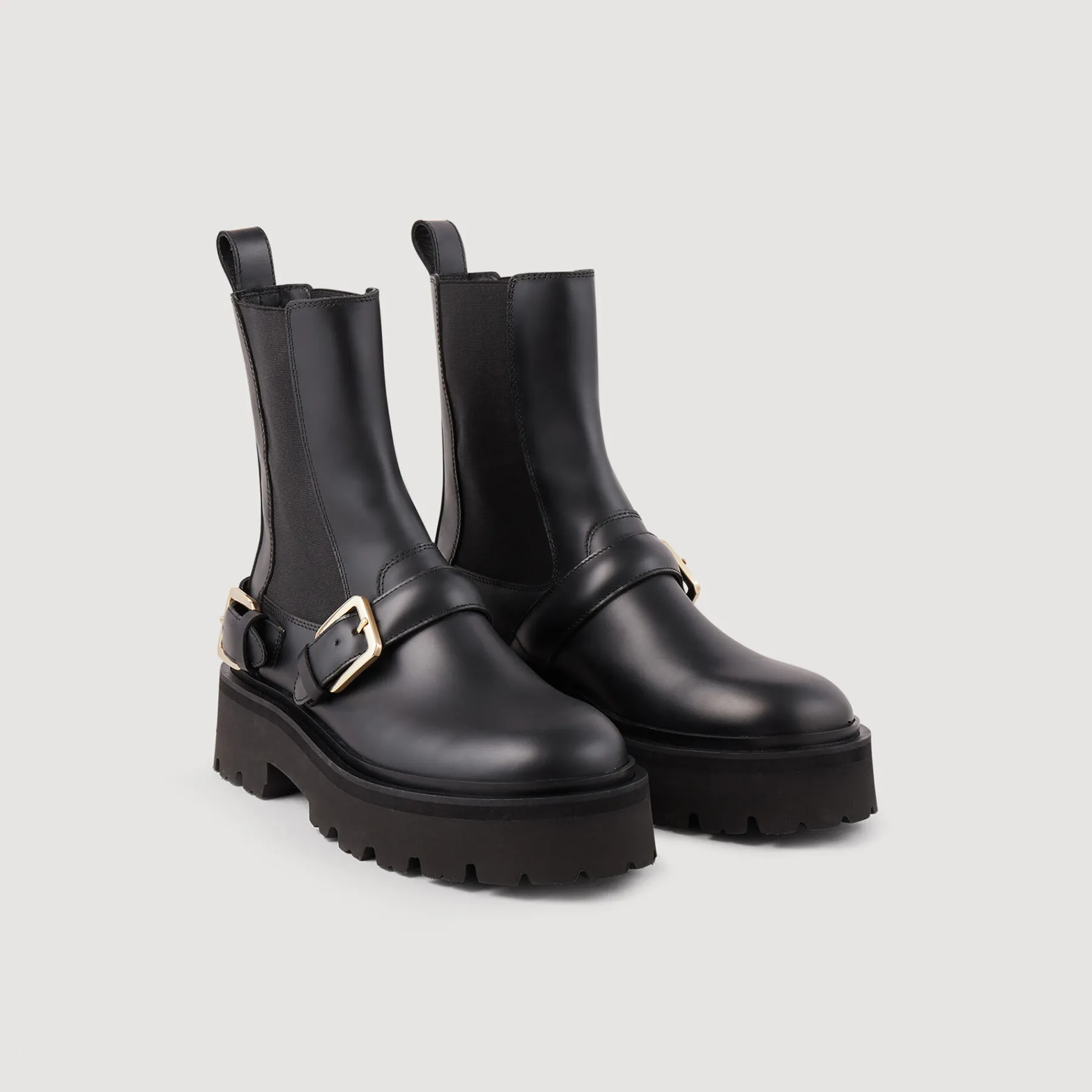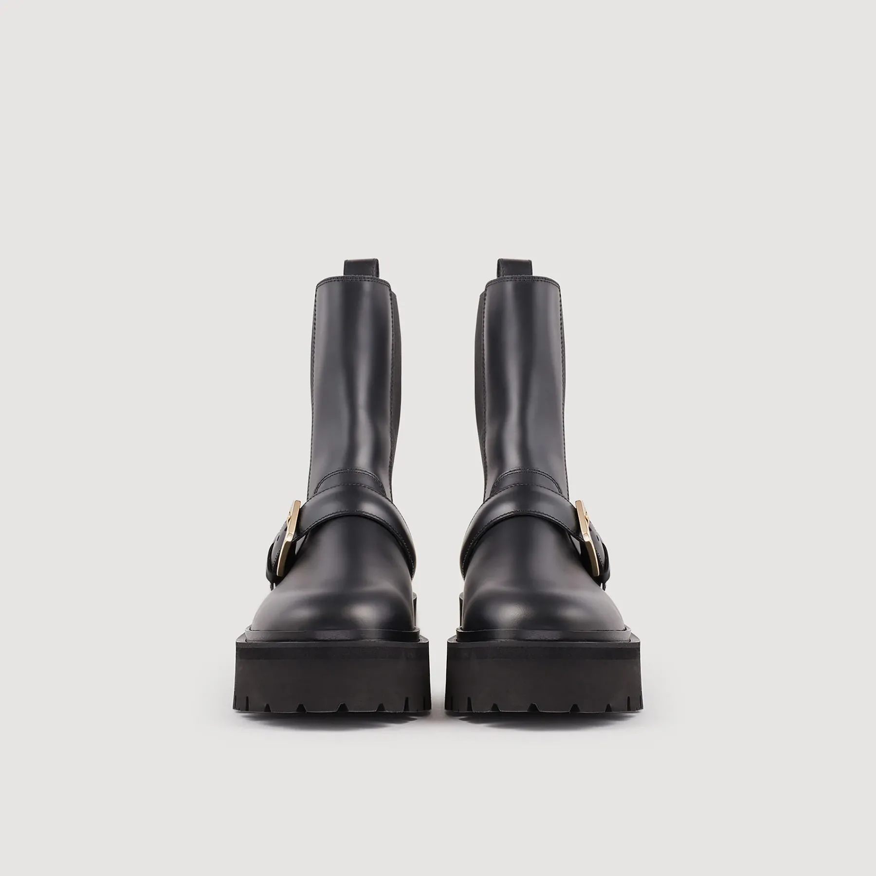 Leather, biker-style ankle boots with round toes, chunky platform soles, elasticated panels at the sides and trimmed with straps with metal buckles.