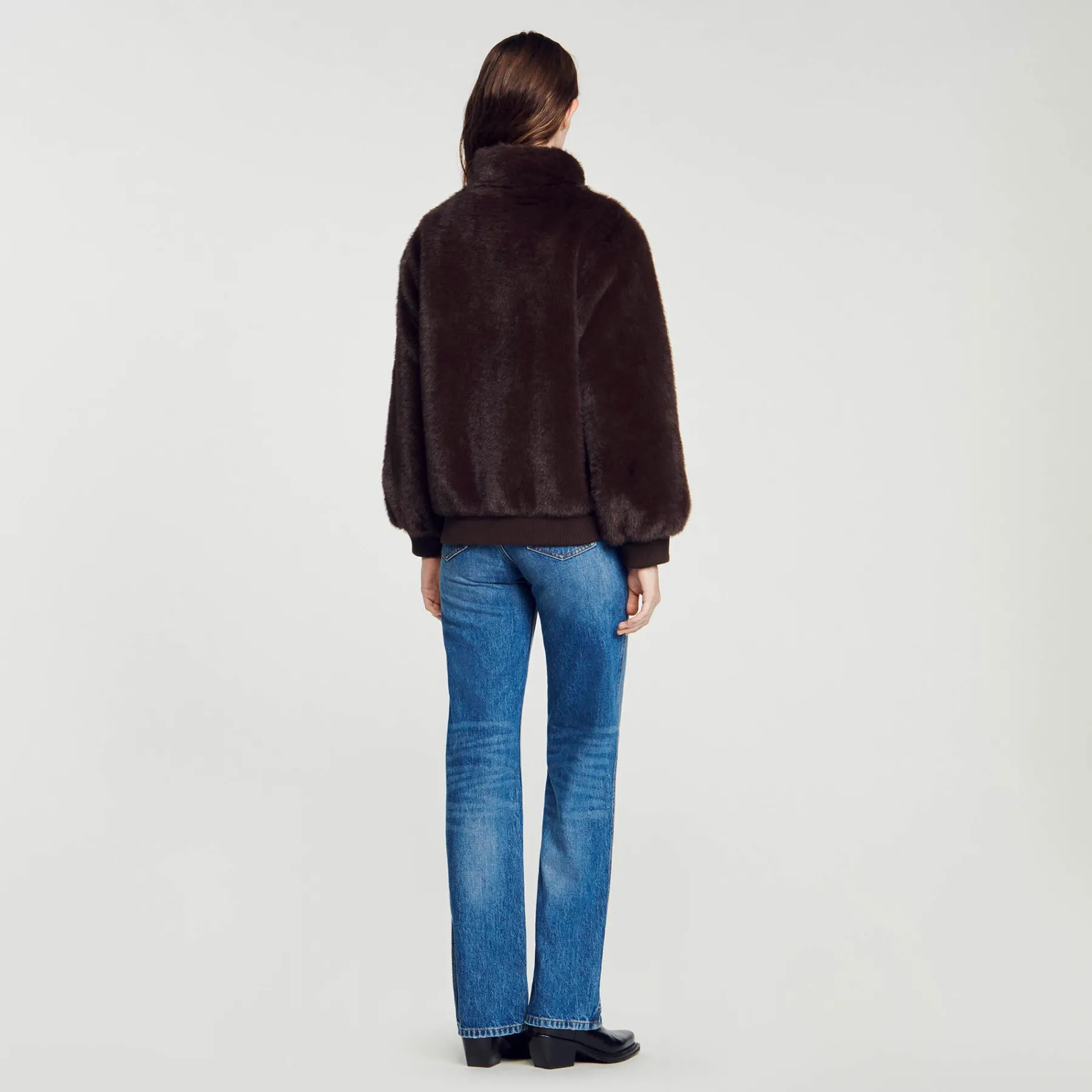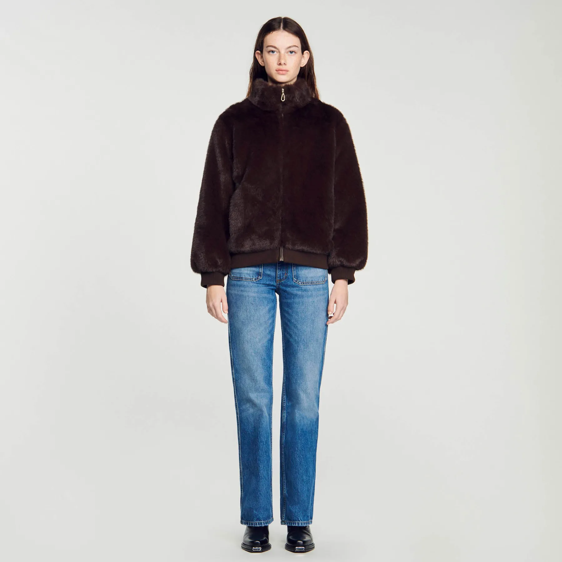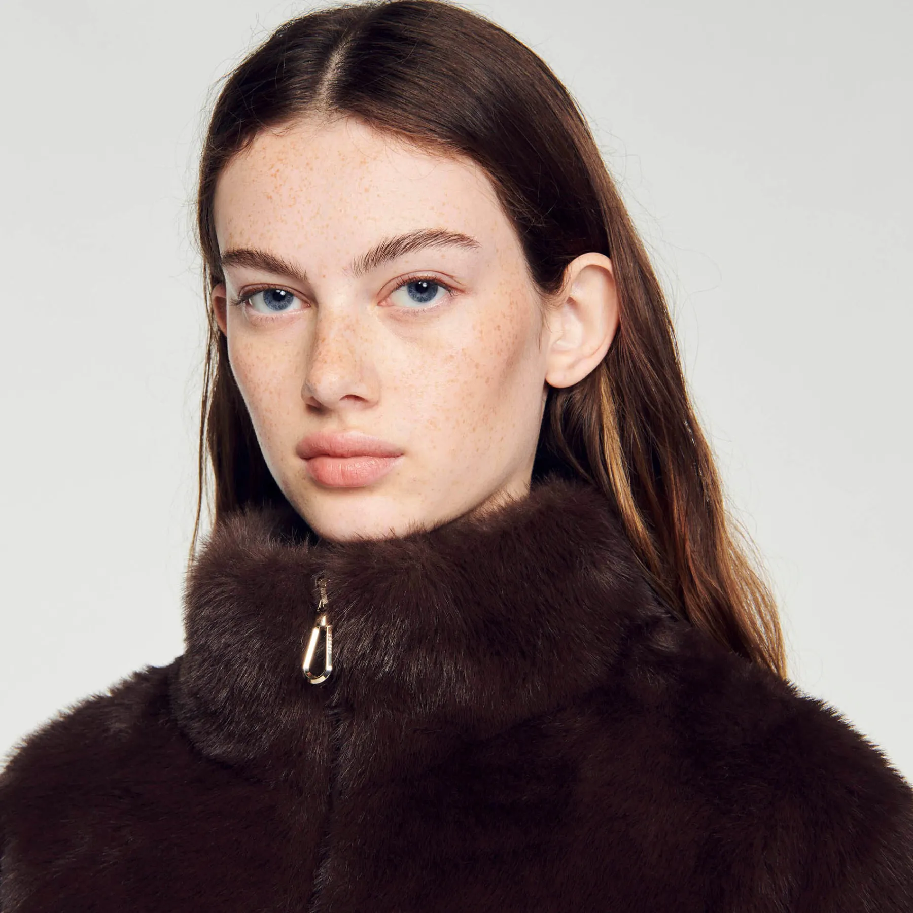 Faux fur jacket with stand-up collar, long sleeves and zip fastening.