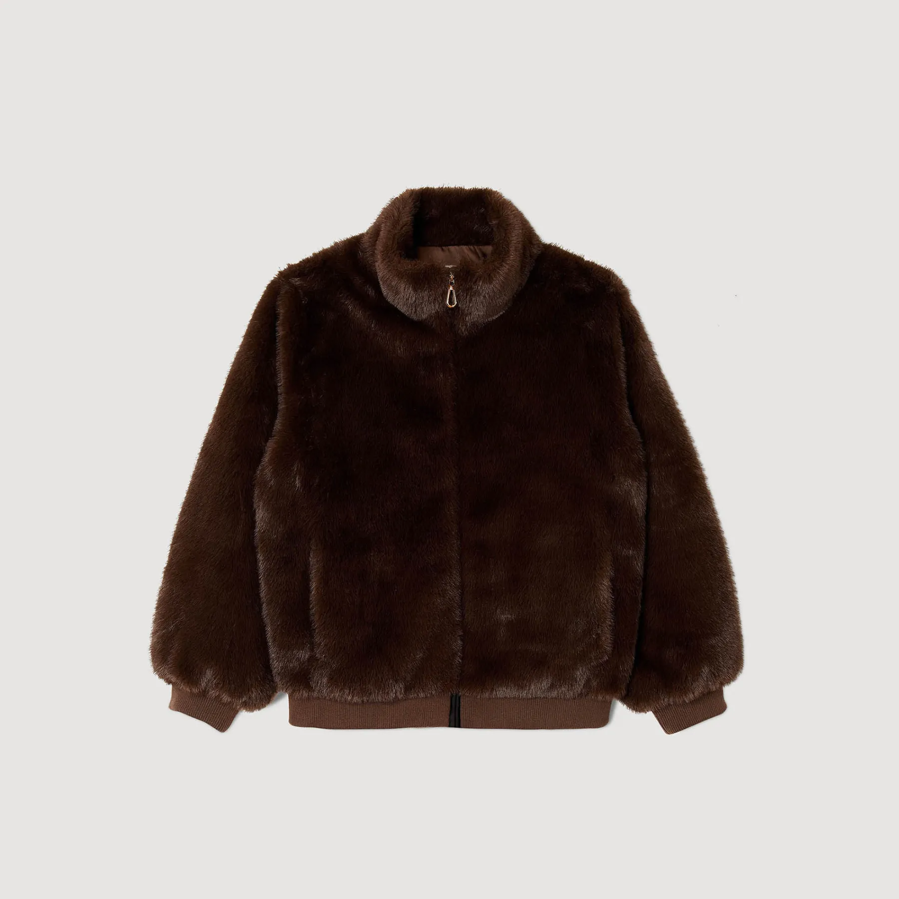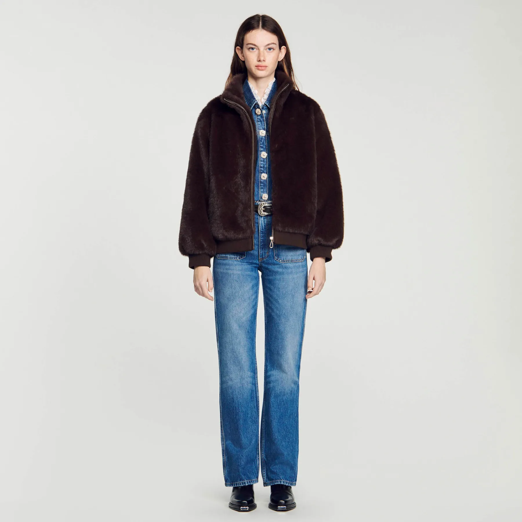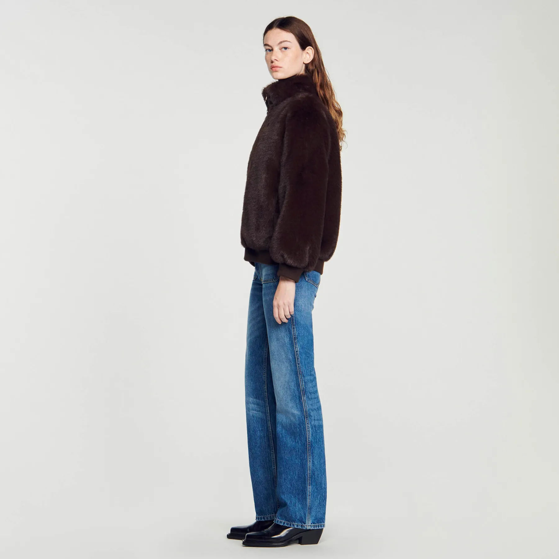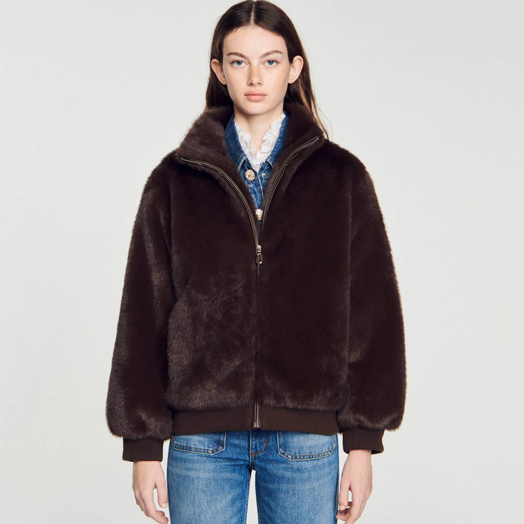 Faux fur jacket with stand-up collar, long sleeves and zip fastening.