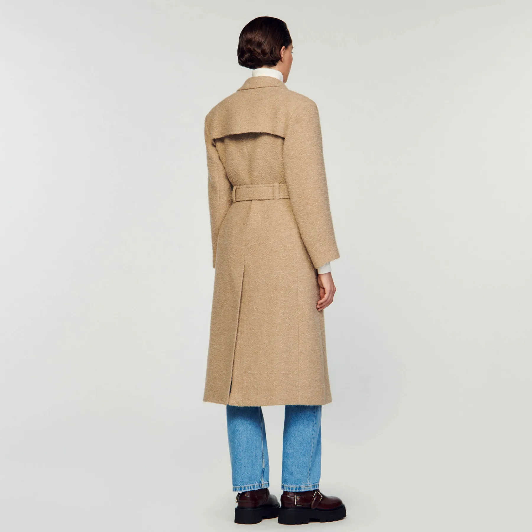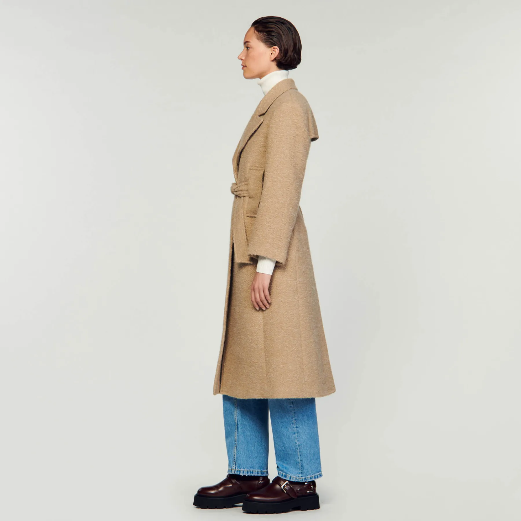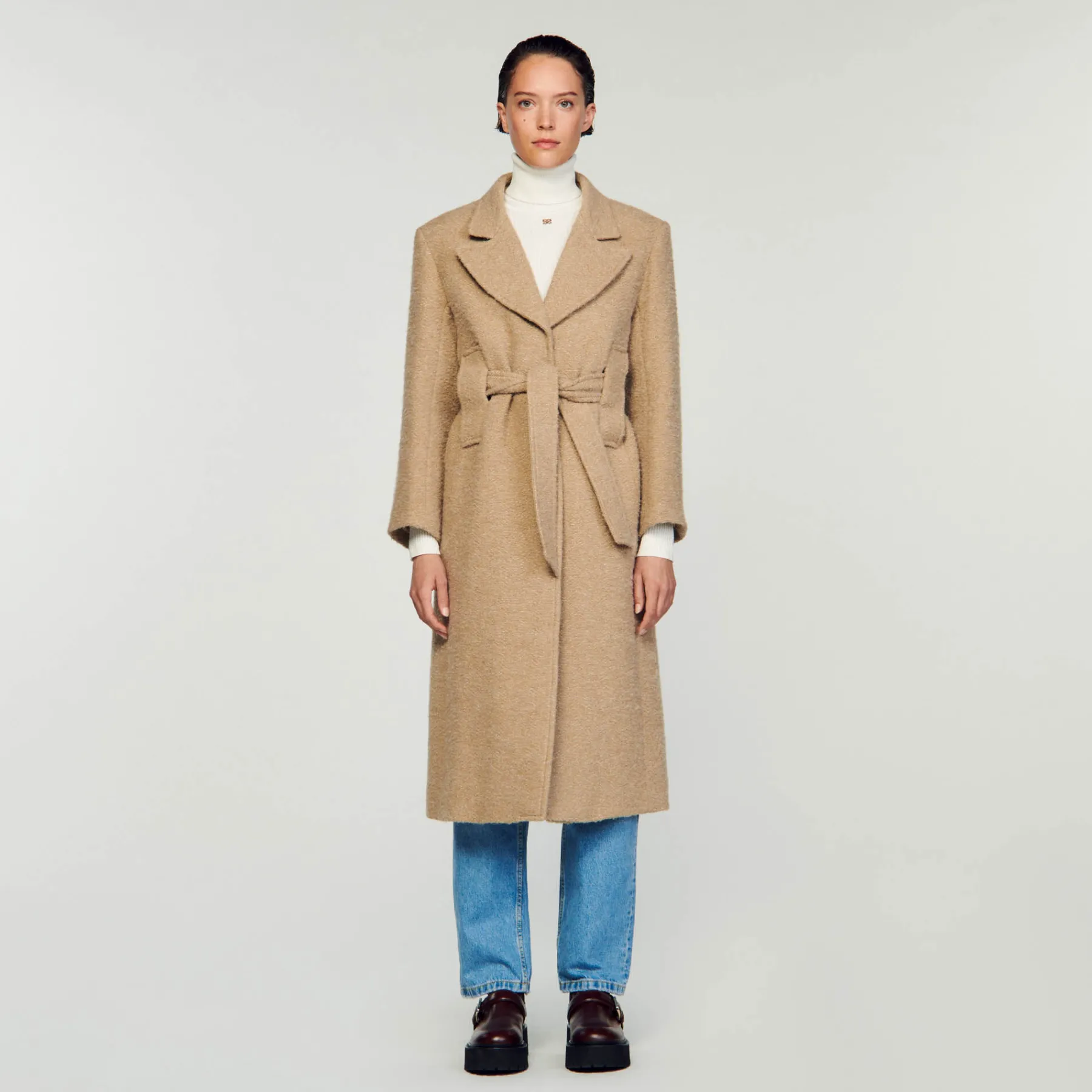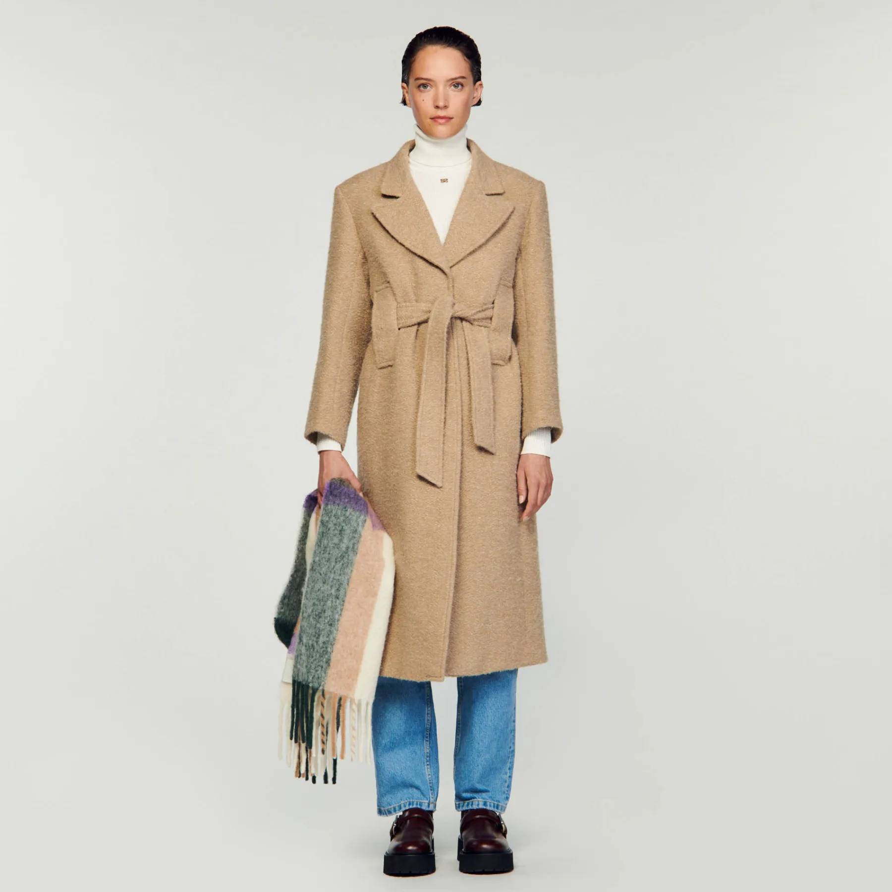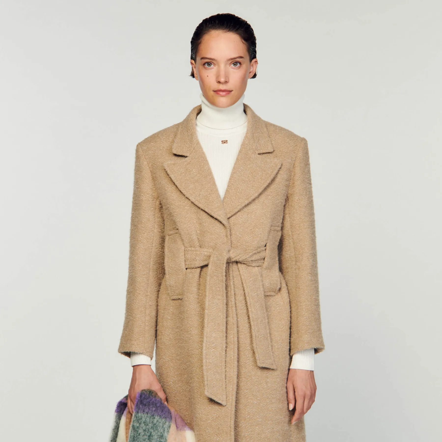 Slim-fit long coat in bouclé fabric with long sleeves featuring plackets on the cuffs, a wide turn-up lapel collar, a flap at the back and a tone-on-tone tie belt on the waist.
