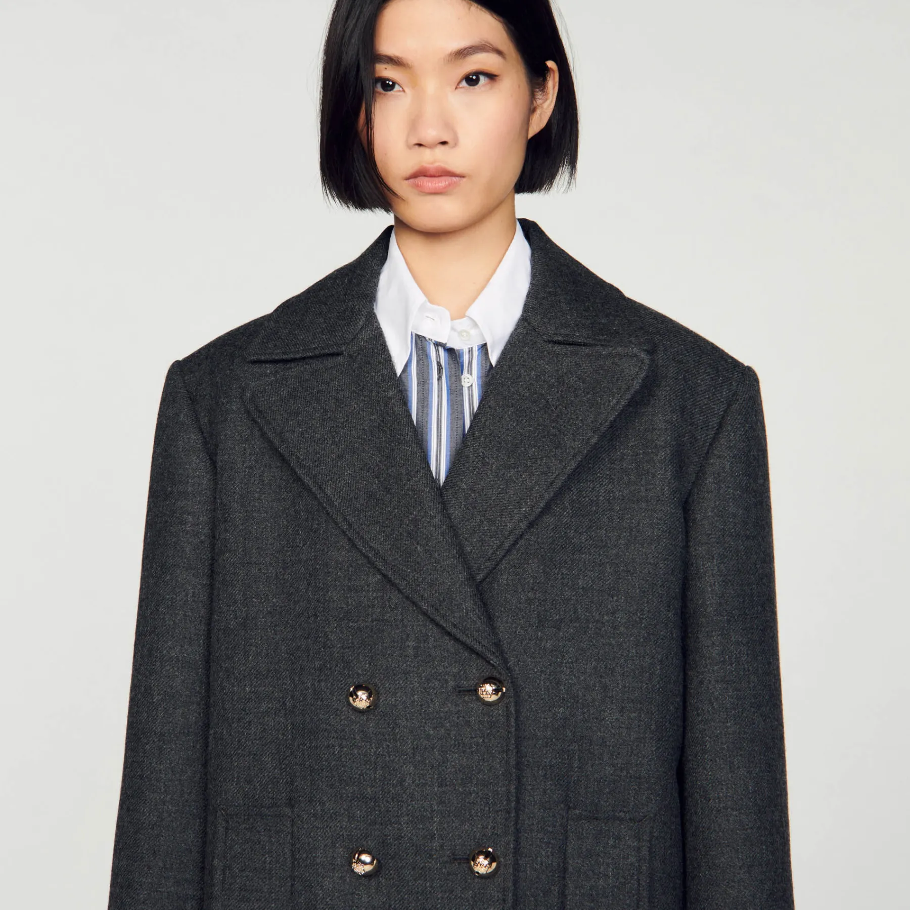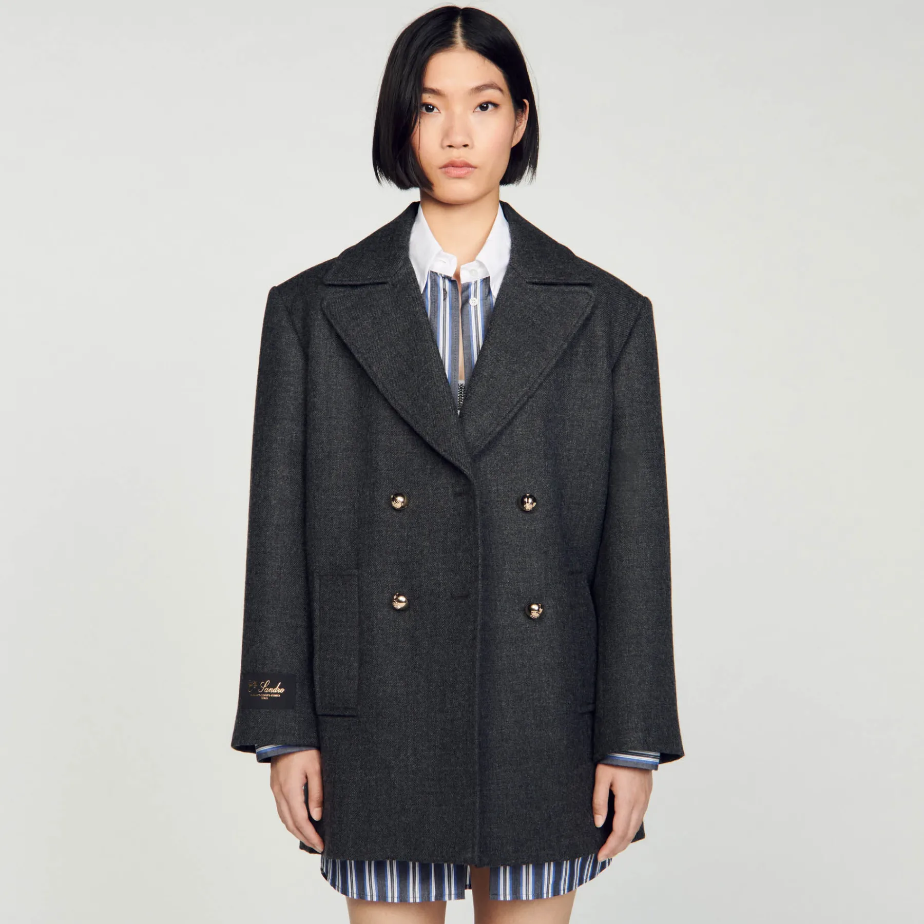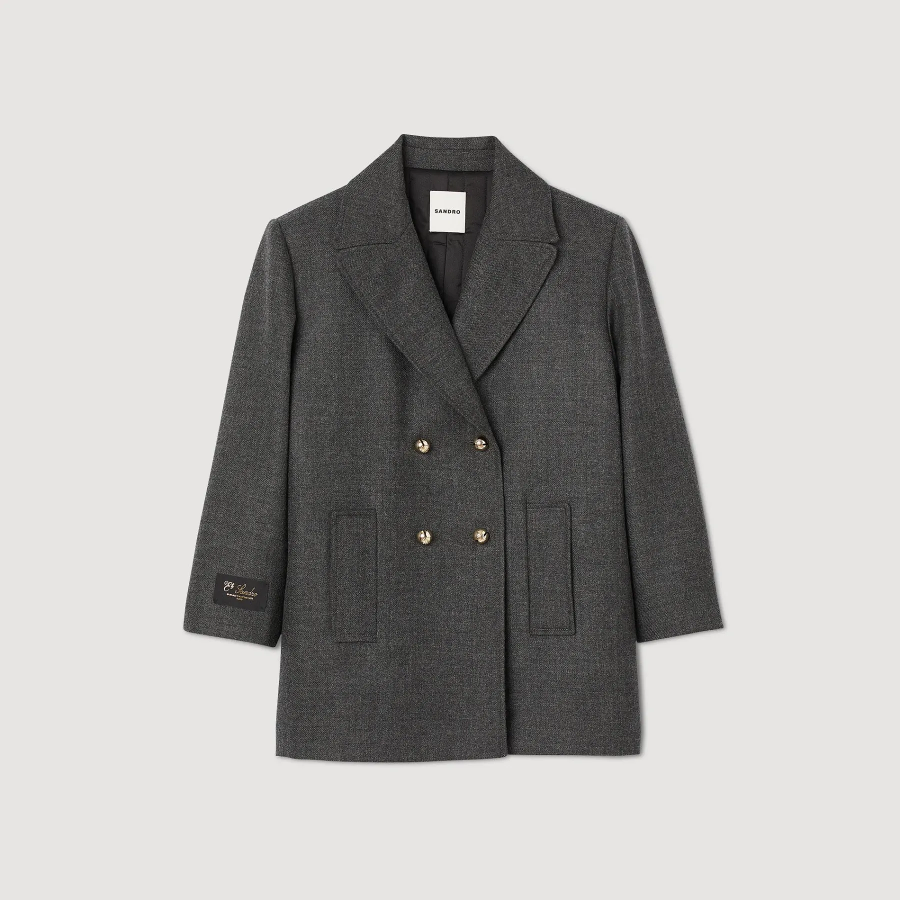 Wool double-breasted pea jacket with large topstitched collar, long sleeves and side pockets.