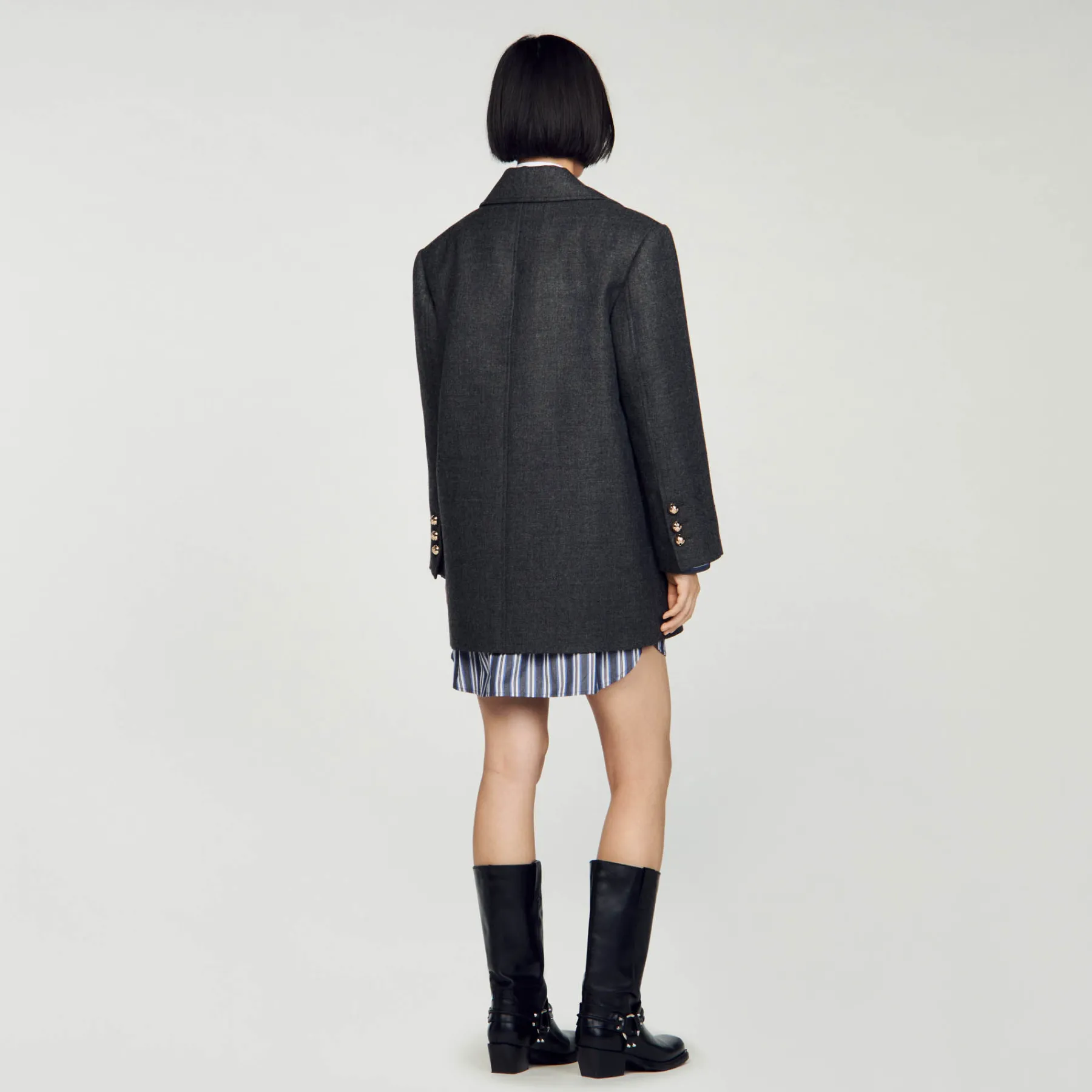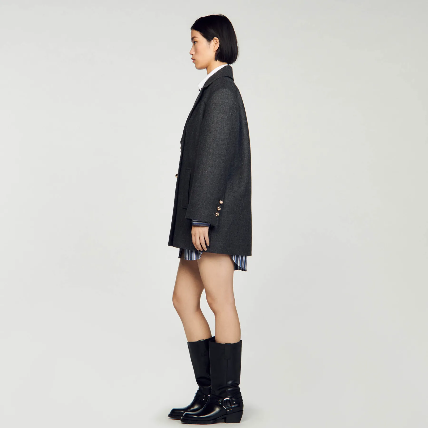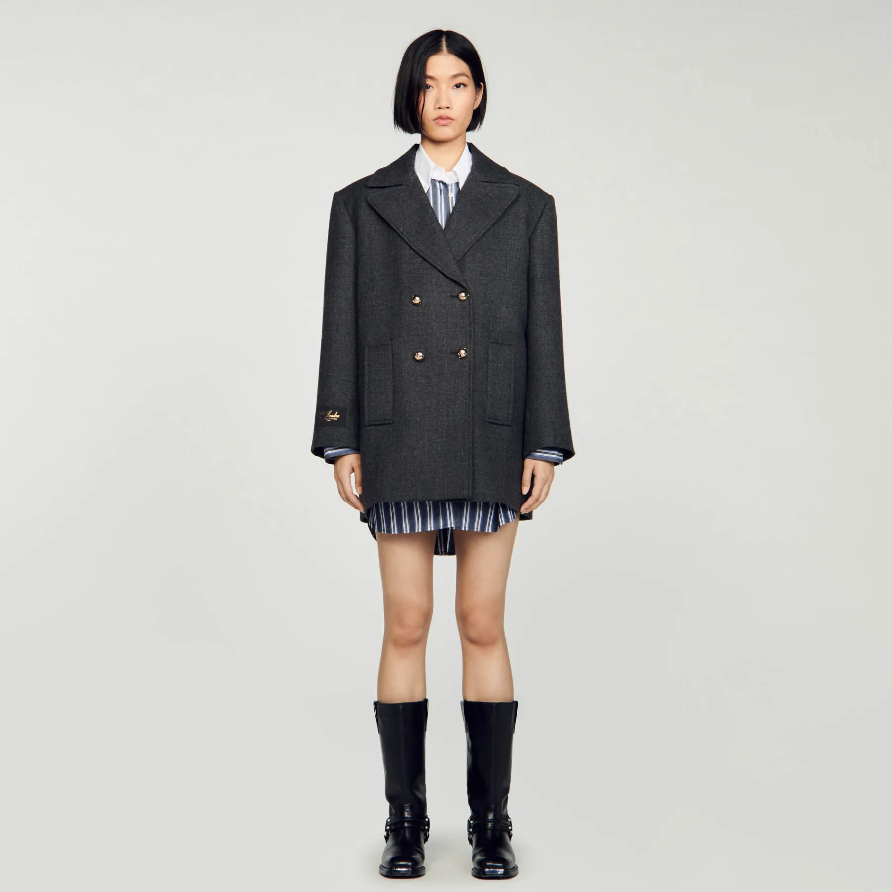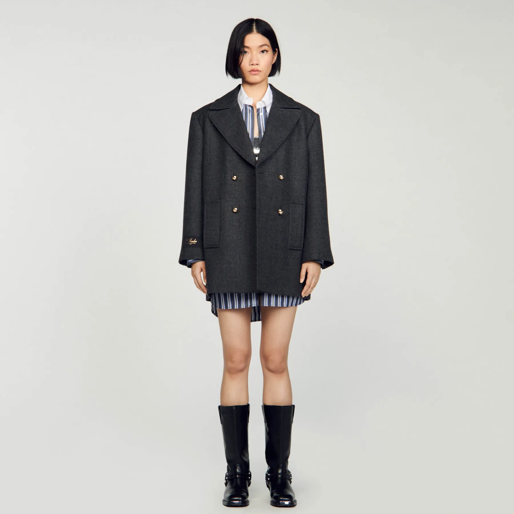 Wool double-breasted pea jacket with large topstitched collar, long sleeves and side pockets.