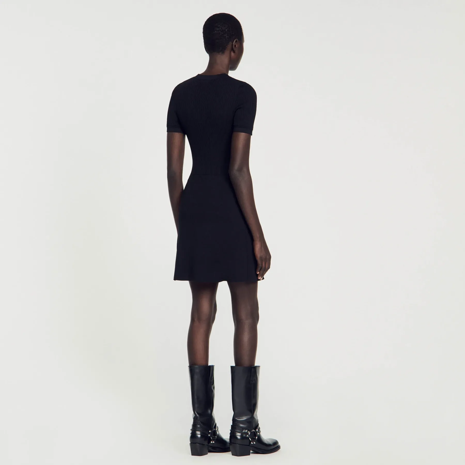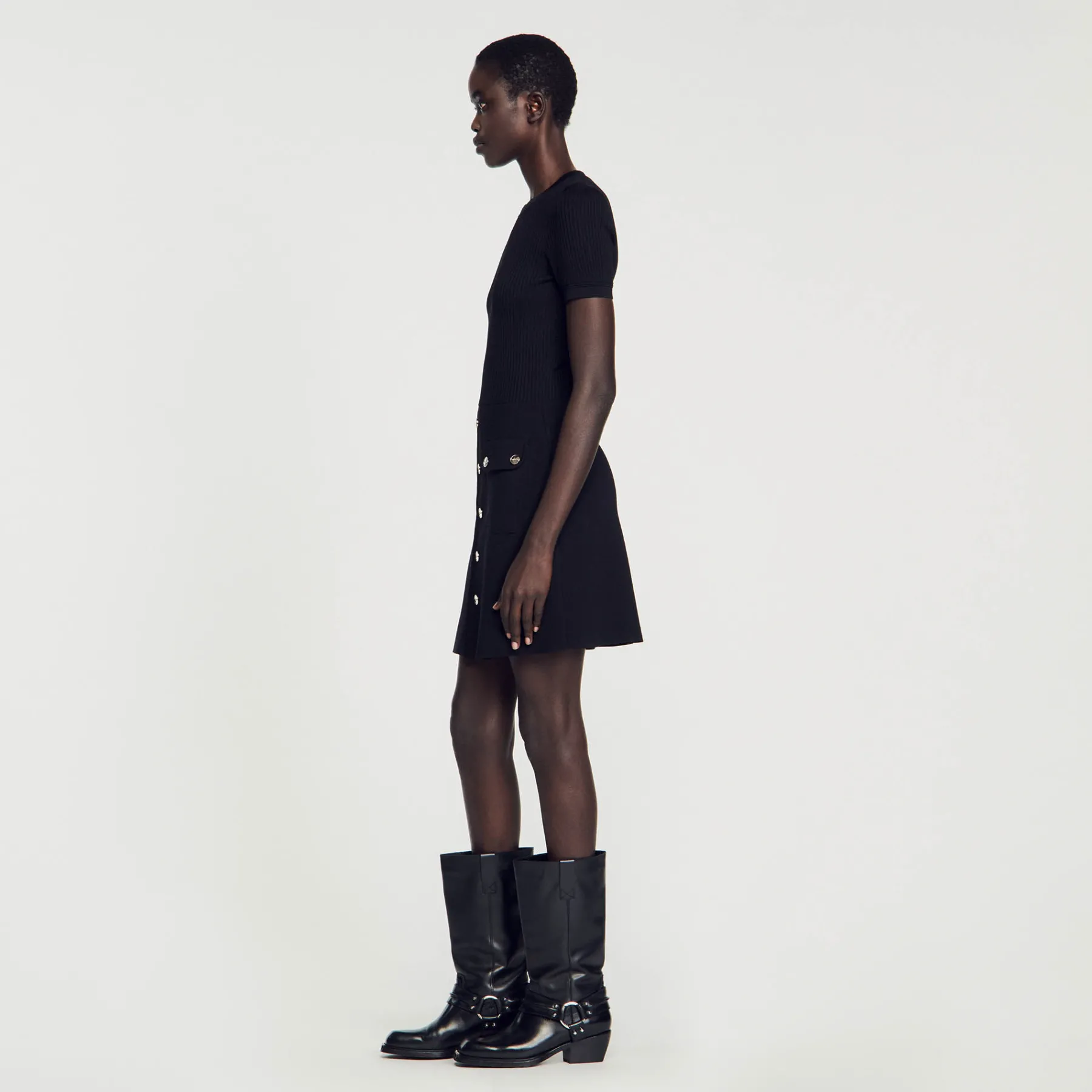 Cropped sleeveless knit dress with a flared skirt and flap patch pockets.
