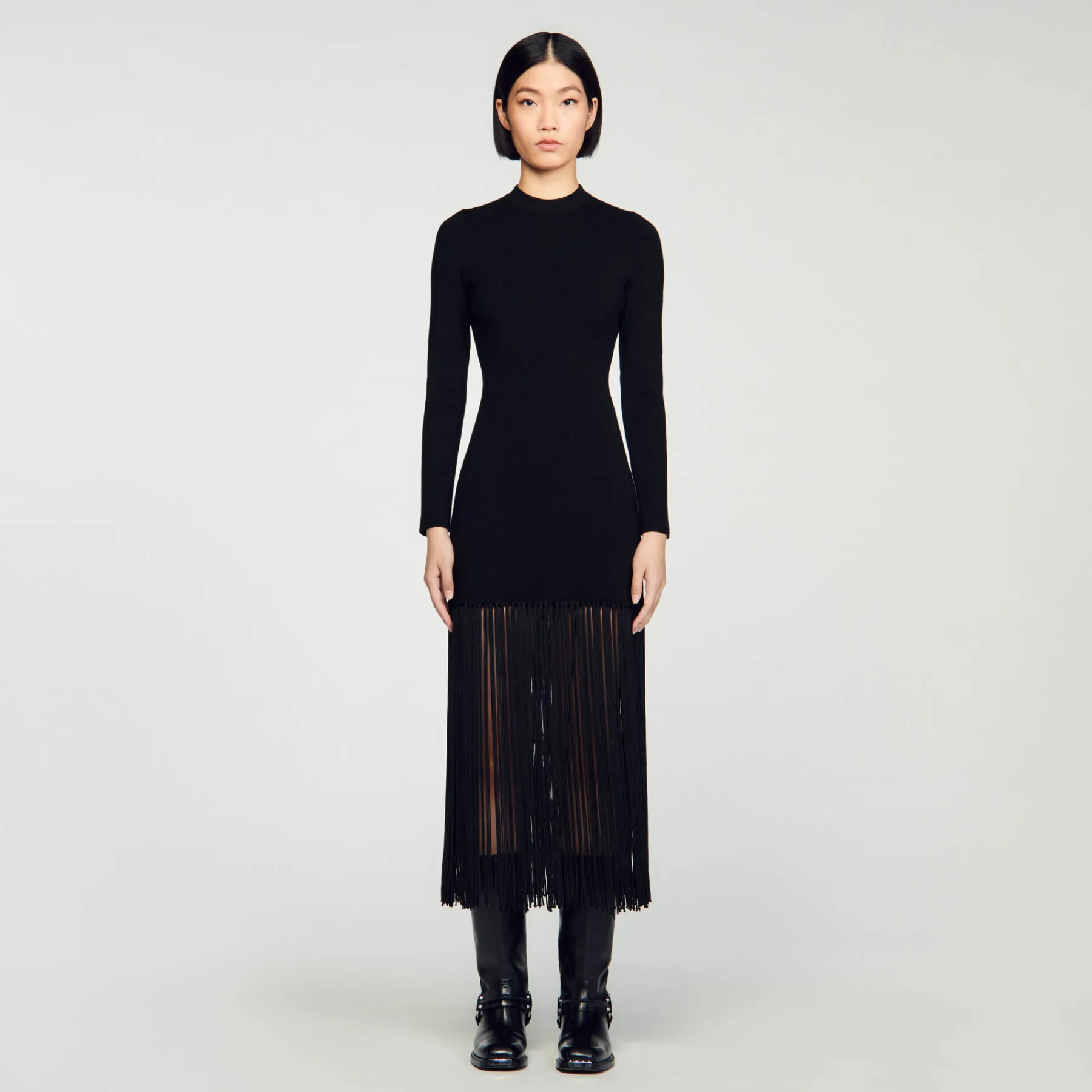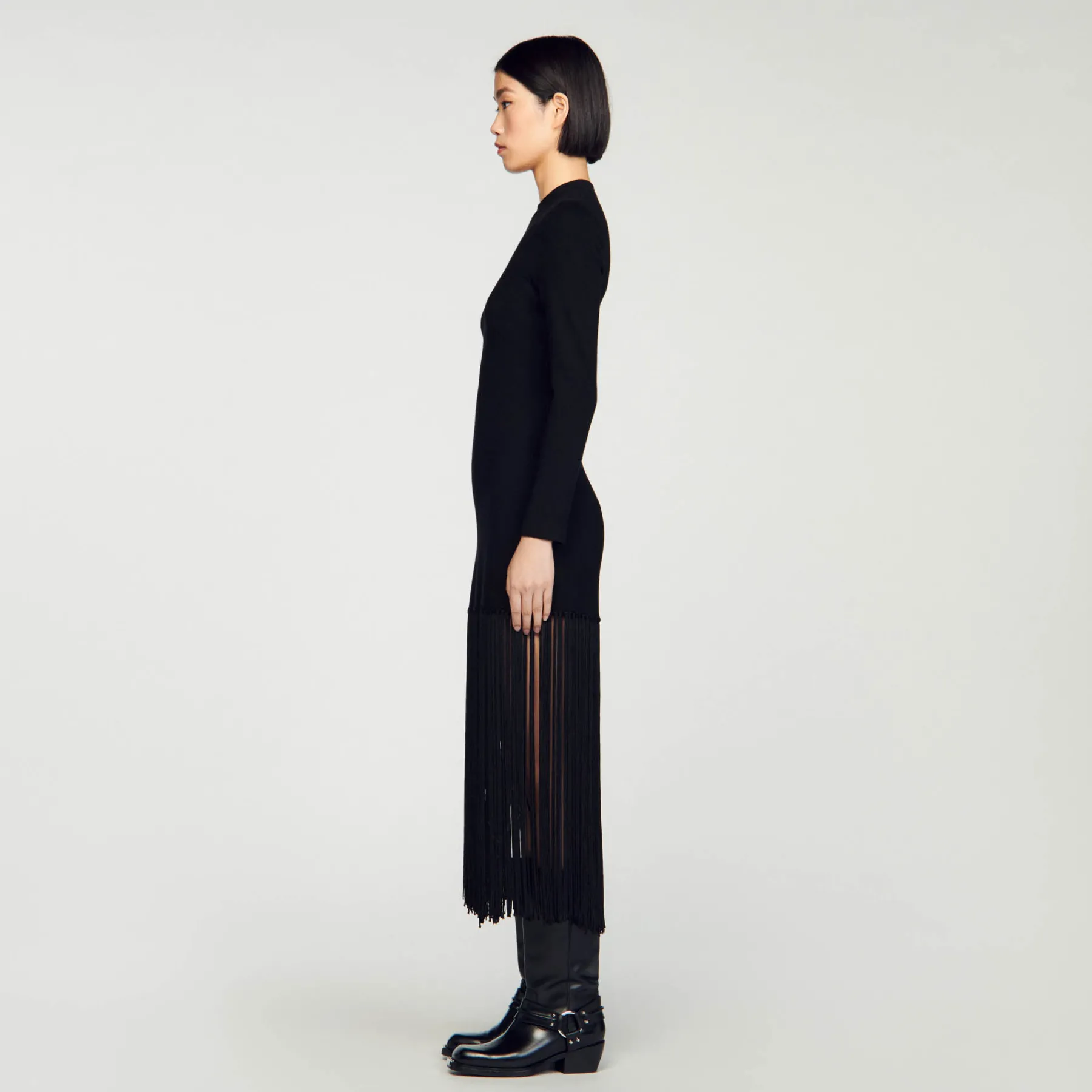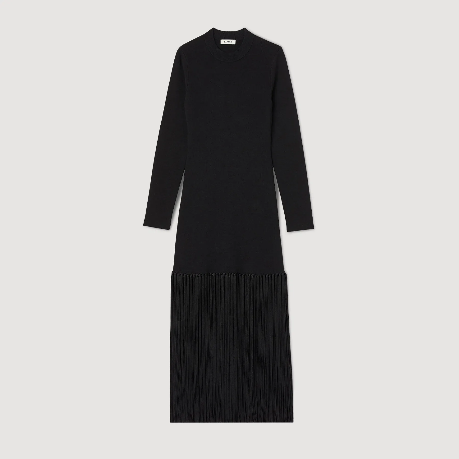 Knitted maxi dress with round neck and long sleeves, embellished with fringes at the bottom.