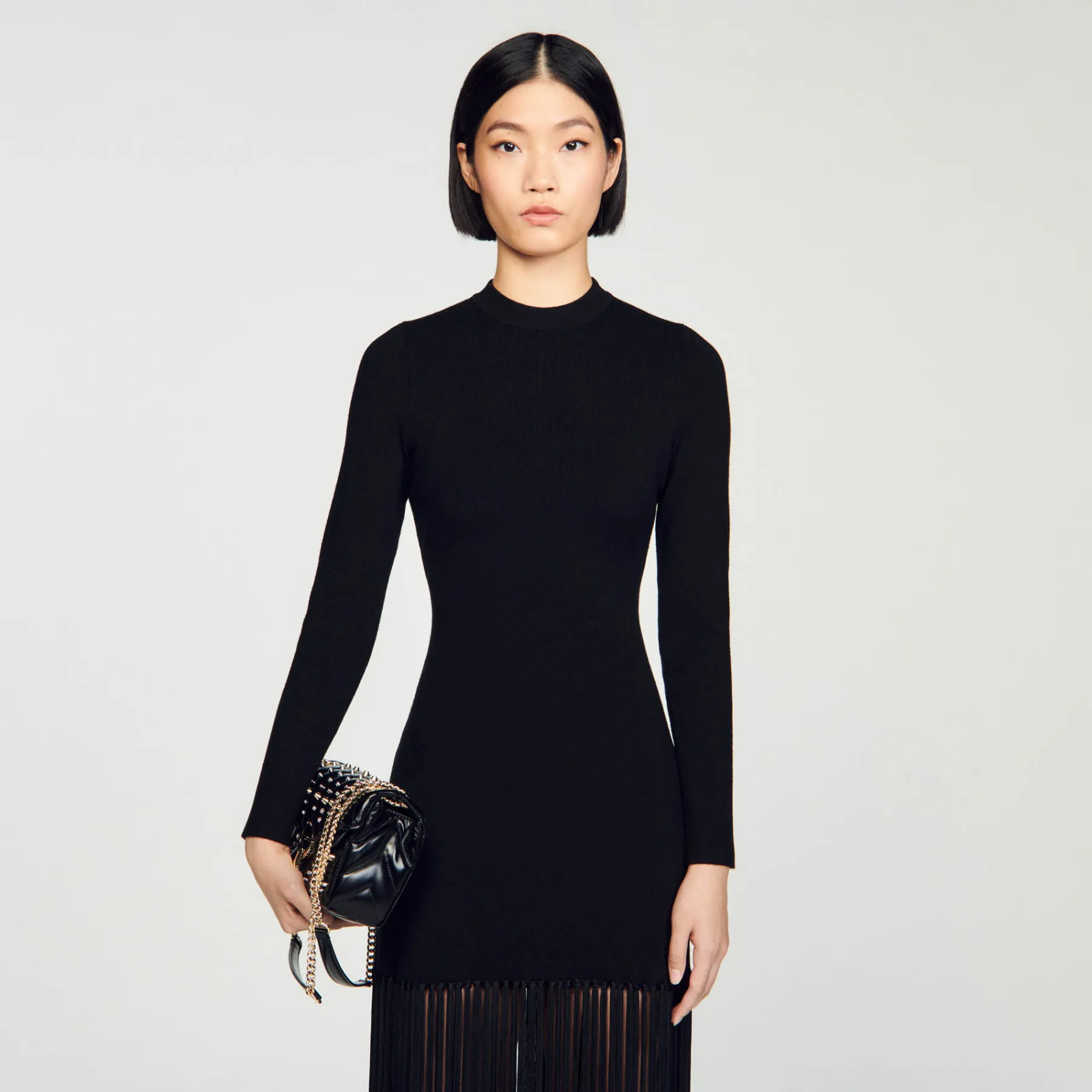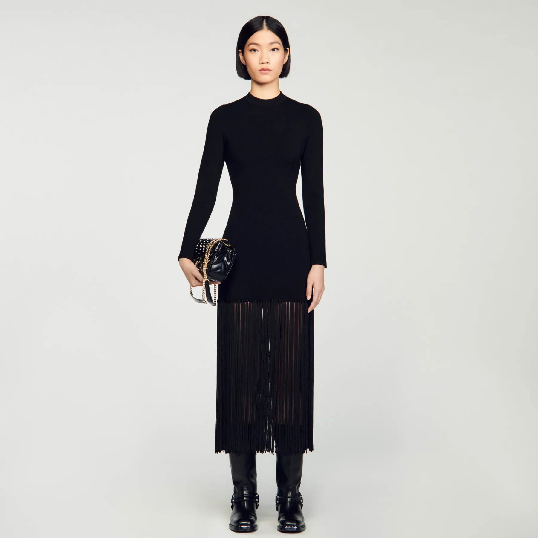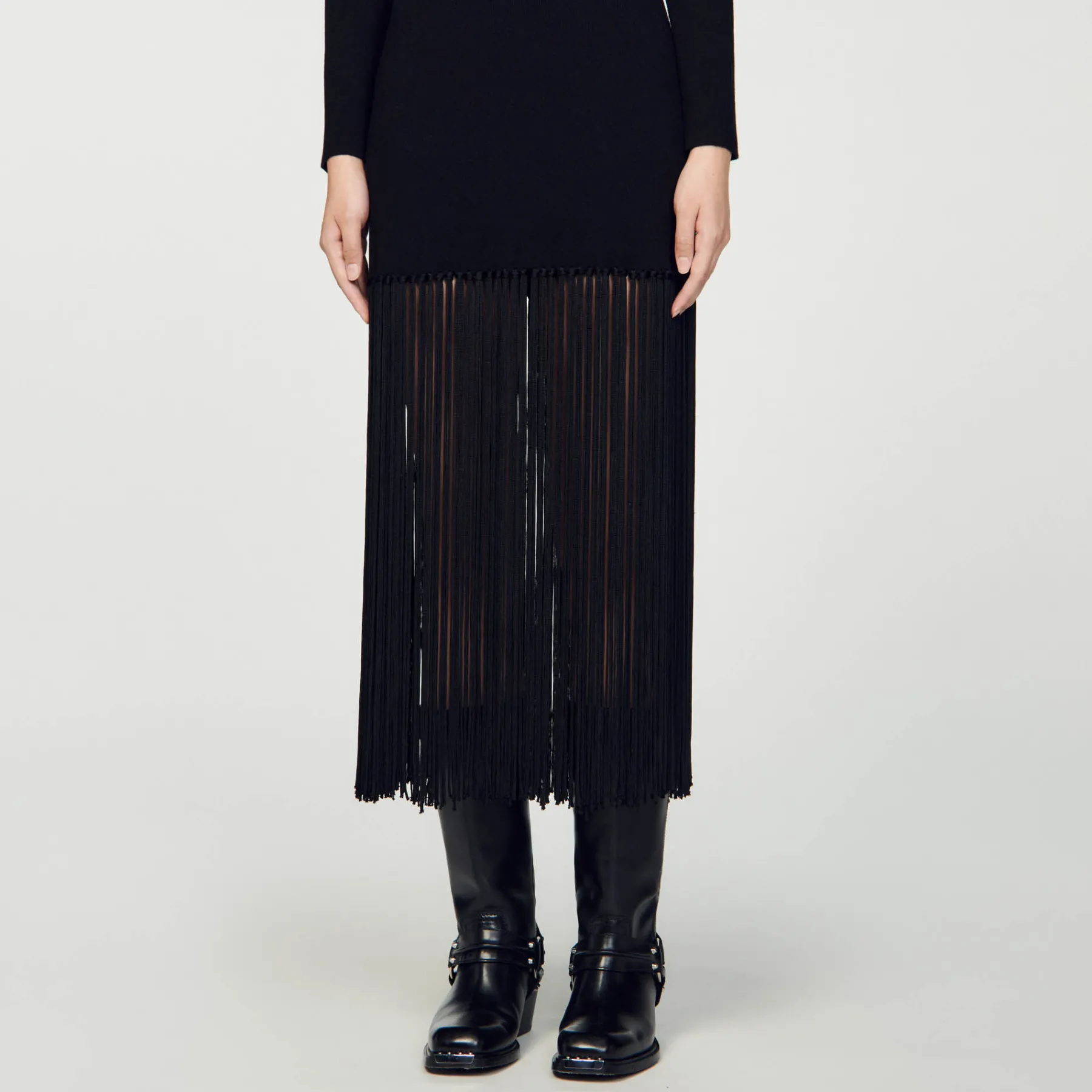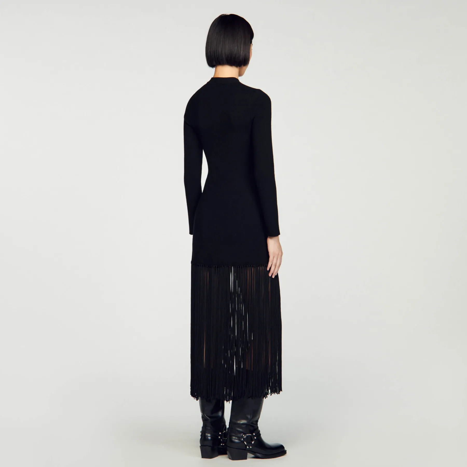 Knitted maxi dress with round neck and long sleeves, embellished with fringes at the bottom.