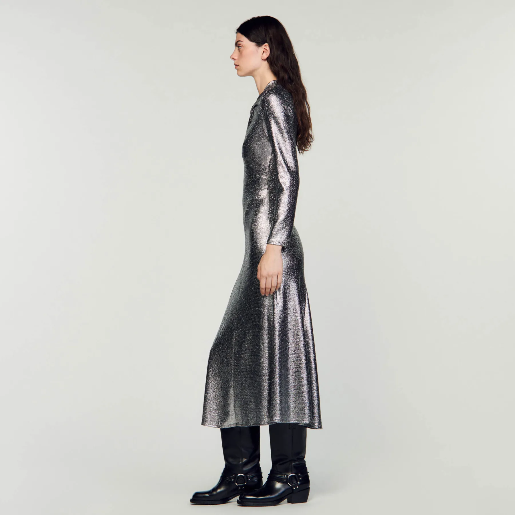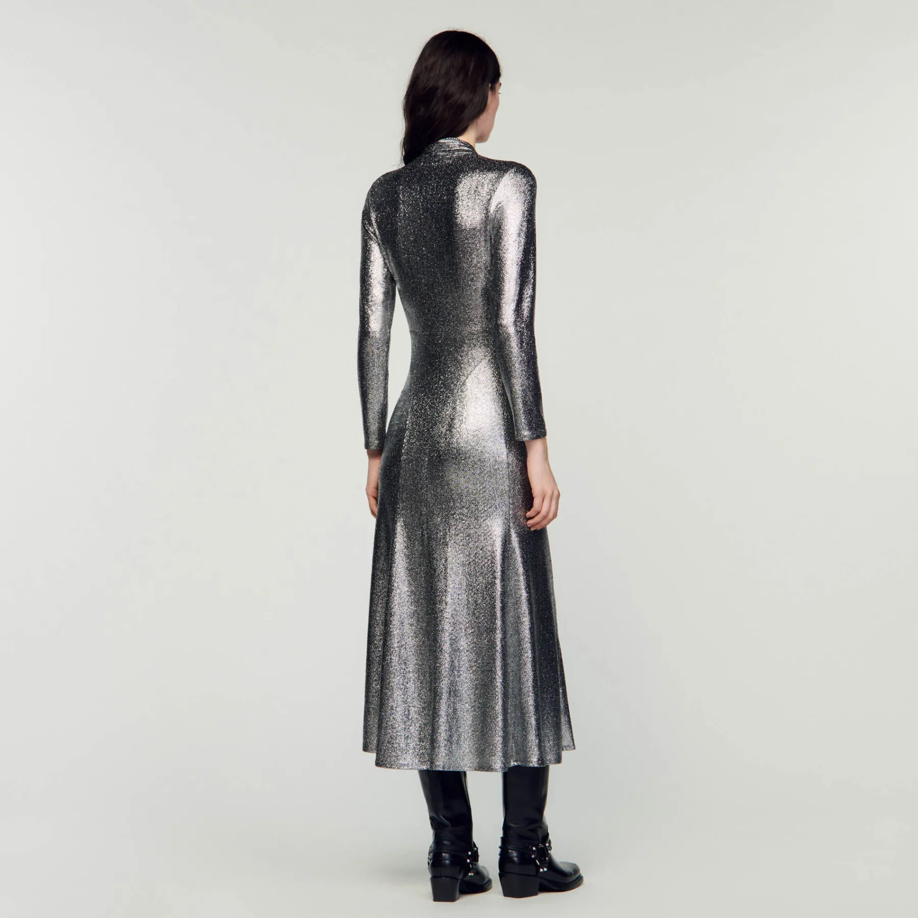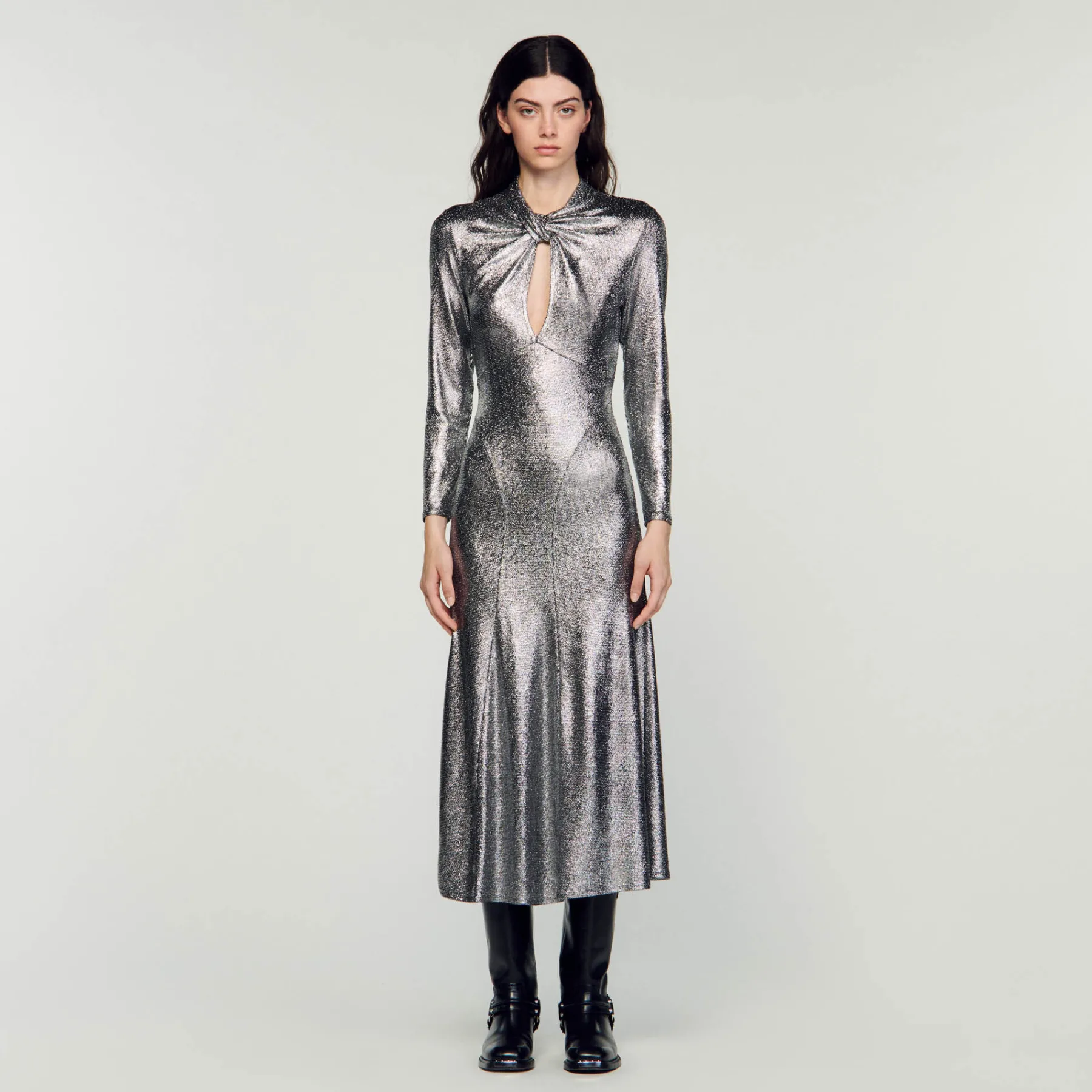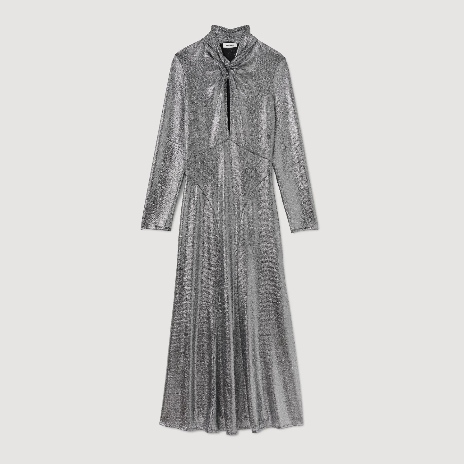 Metallic maxi dress featuring an openwork twist-effect high neck, long sleeves and a delicately flared skirt at the bottom.