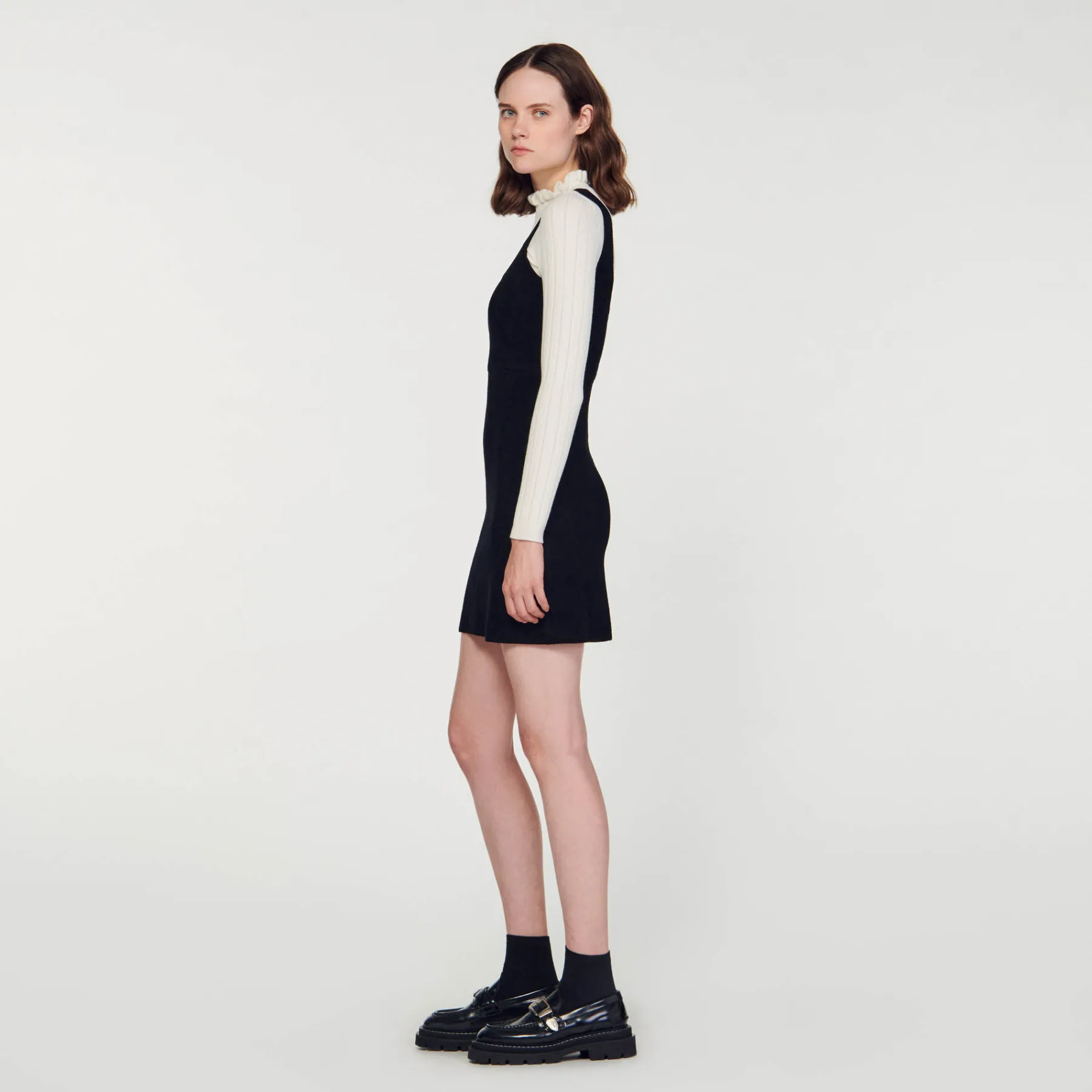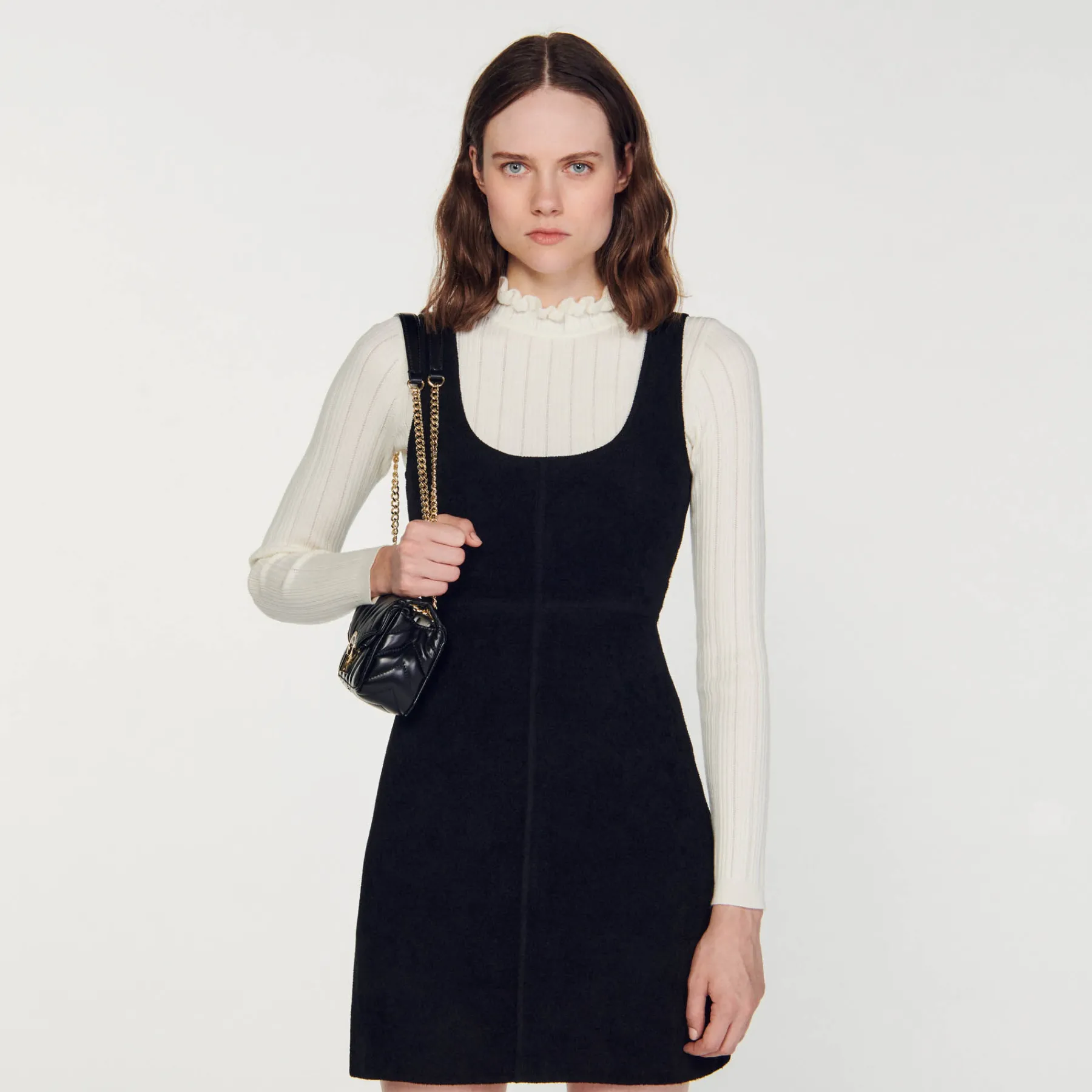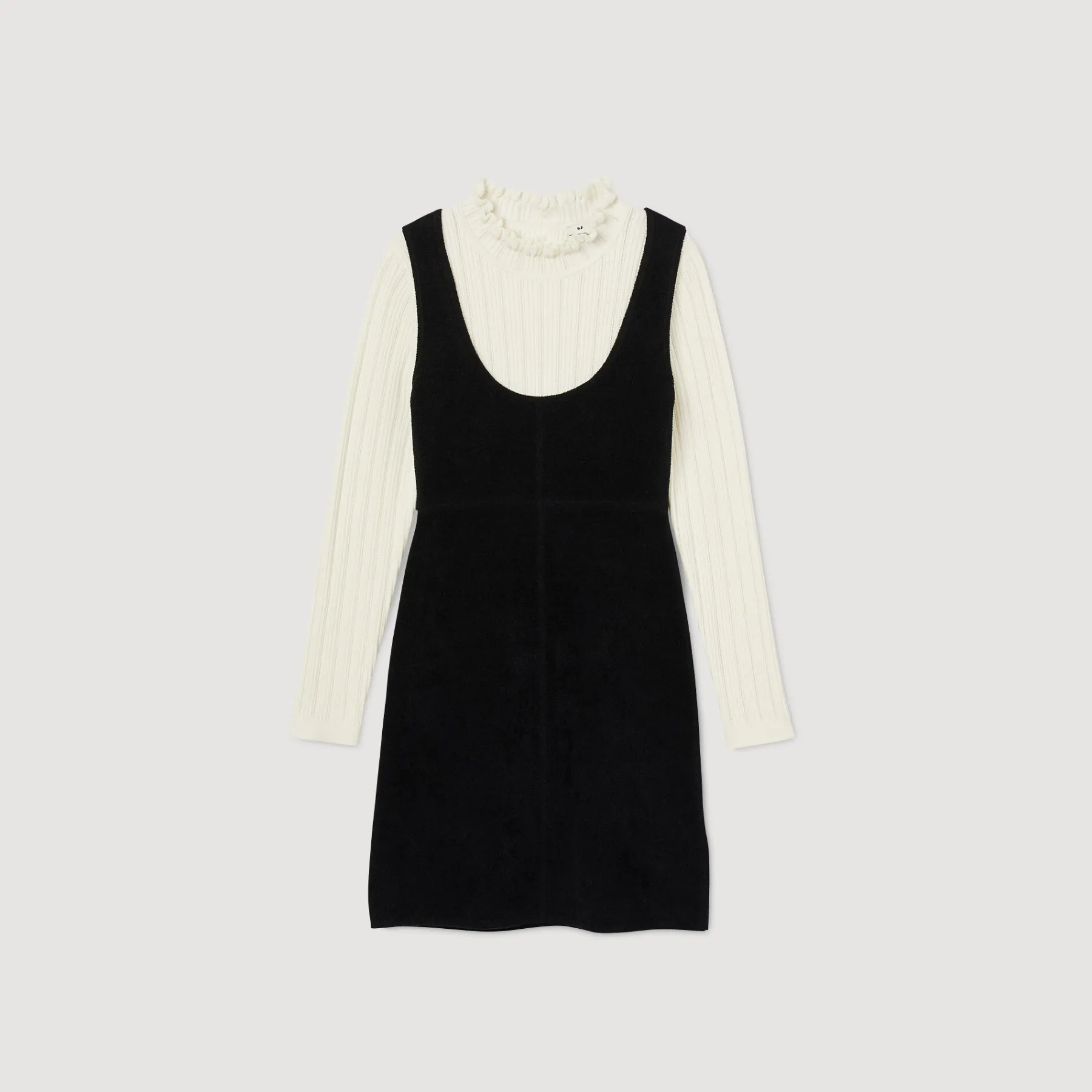 2-in-1 effect pinafore dress in two-tone knit featuring a tight-fitting top with ruffled high neck and long sleeves and a layered velvet dress on top with flat straps and scoop neck.
