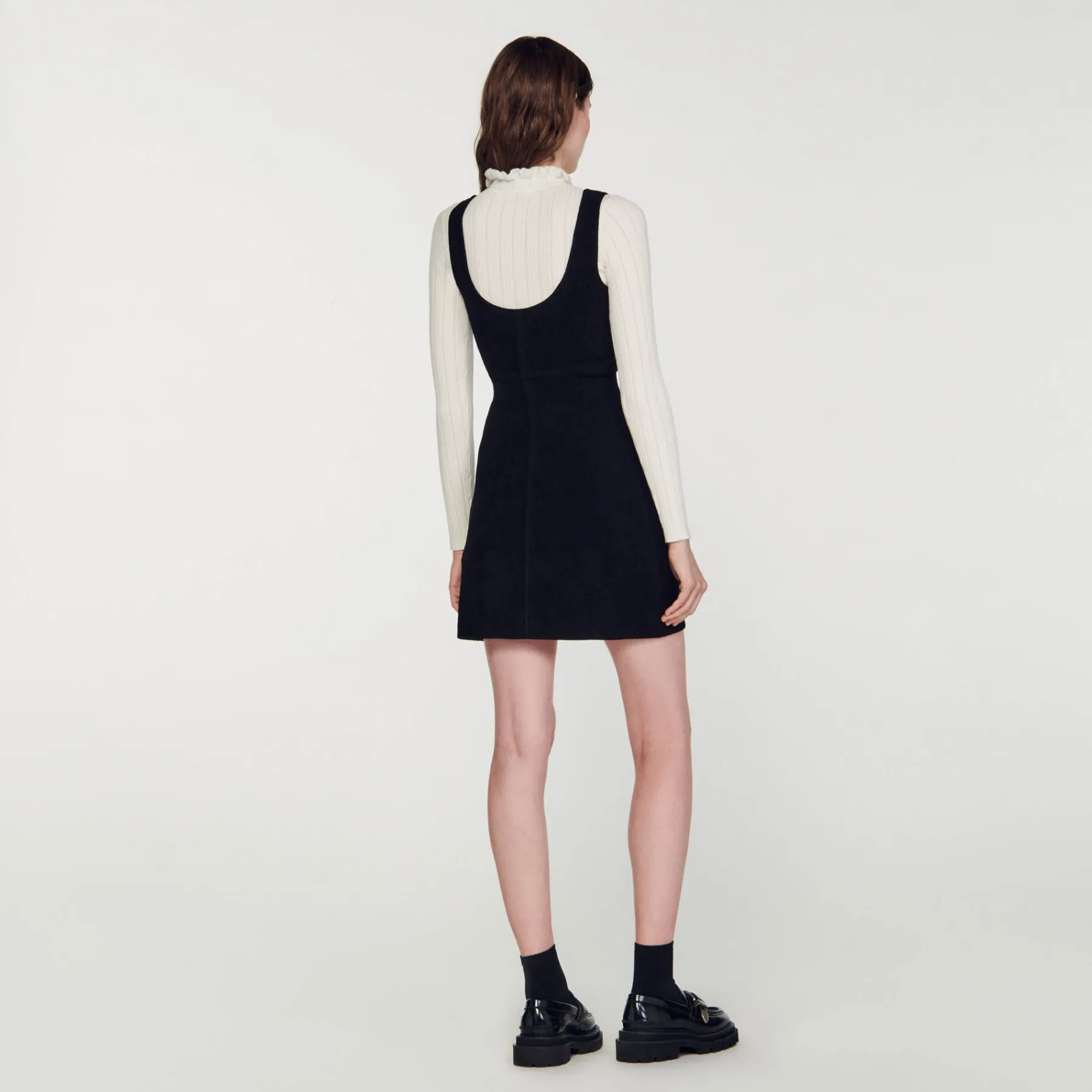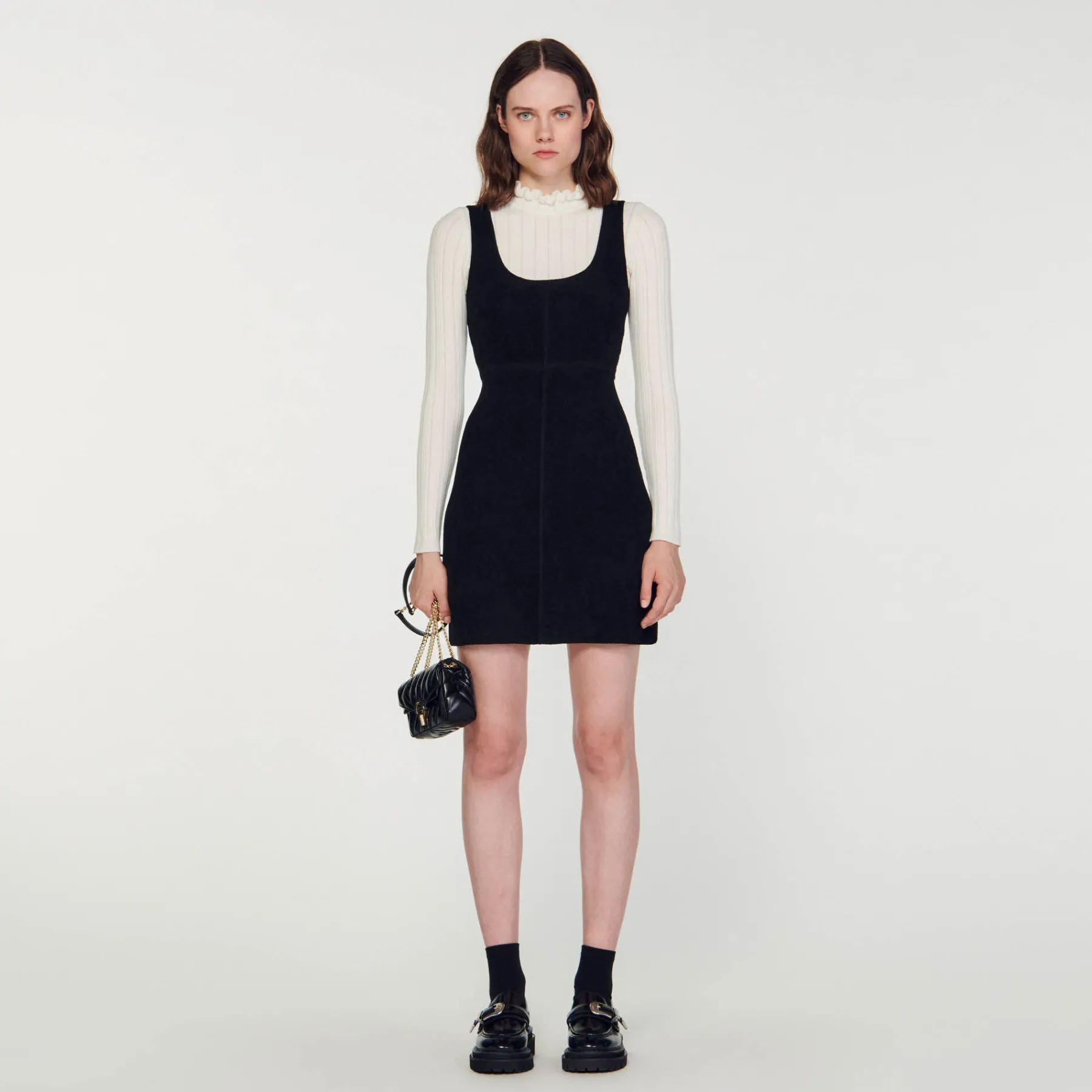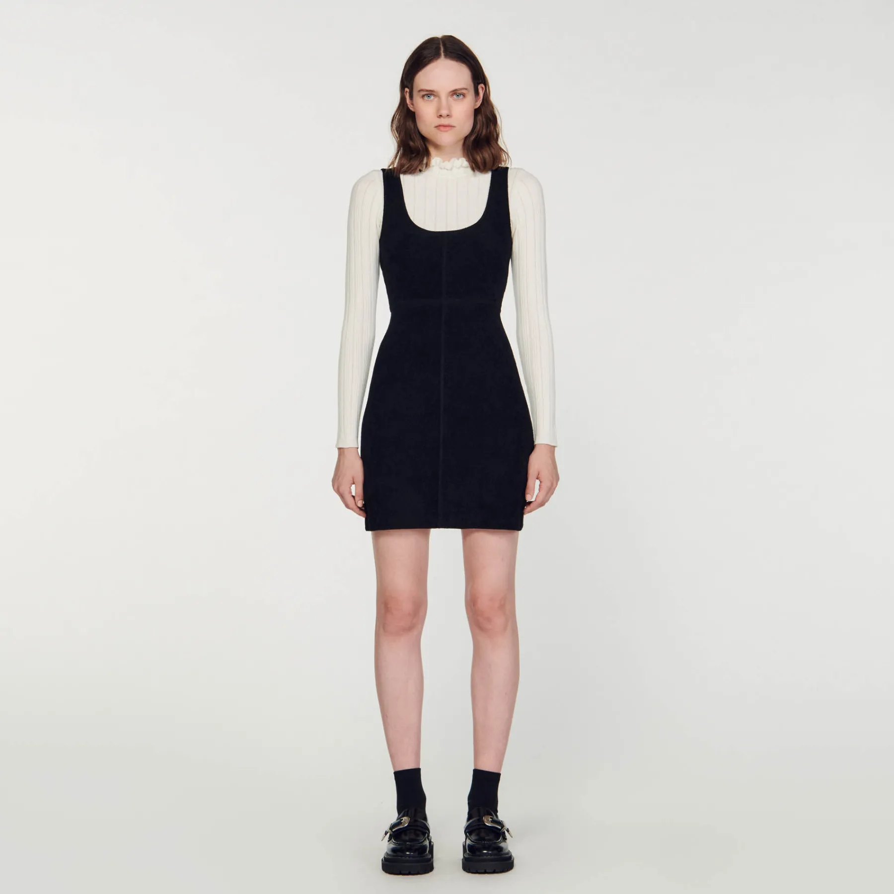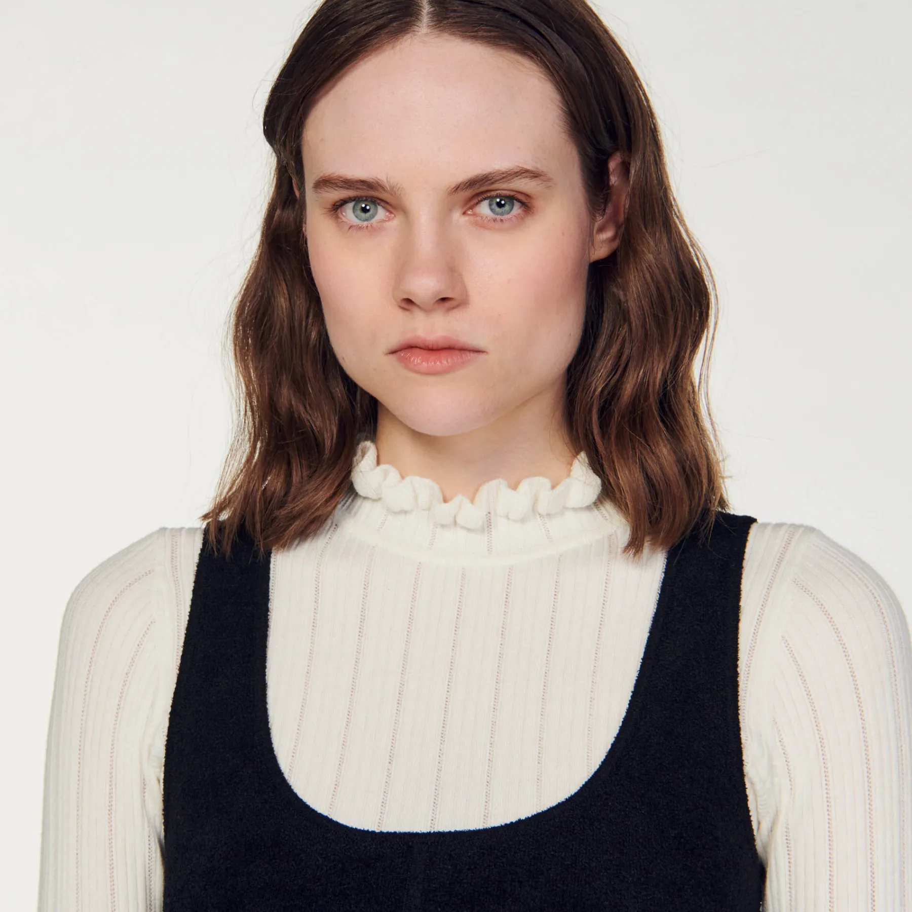 2-in-1 effect pinafore dress in two-tone knit featuring a tight-fitting top with ruffled high neck and long sleeves and a layered velvet dress on top with flat straps and scoop neck.