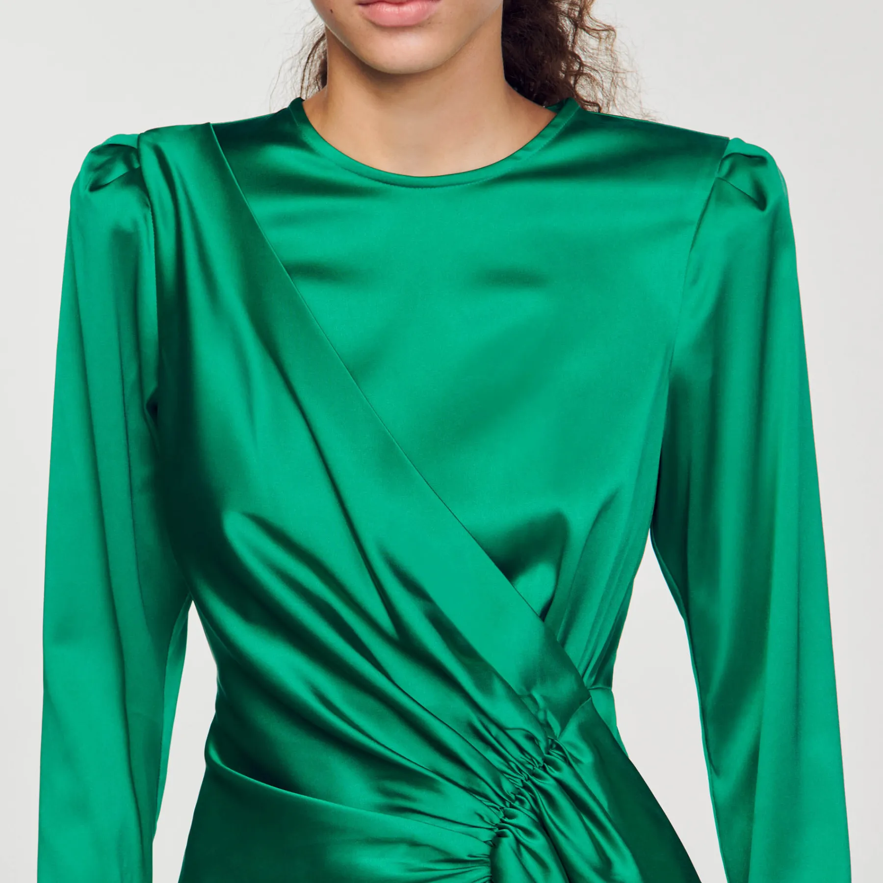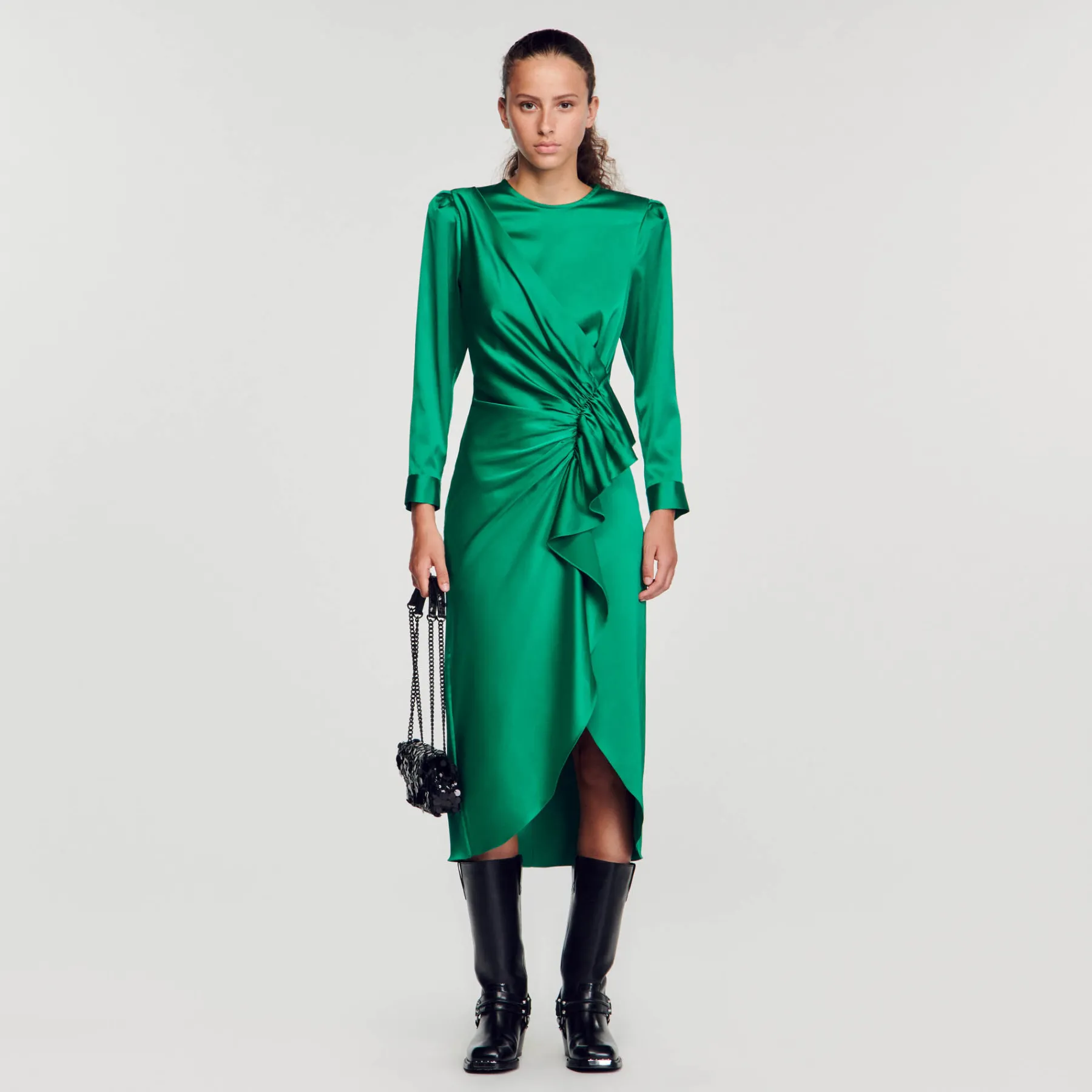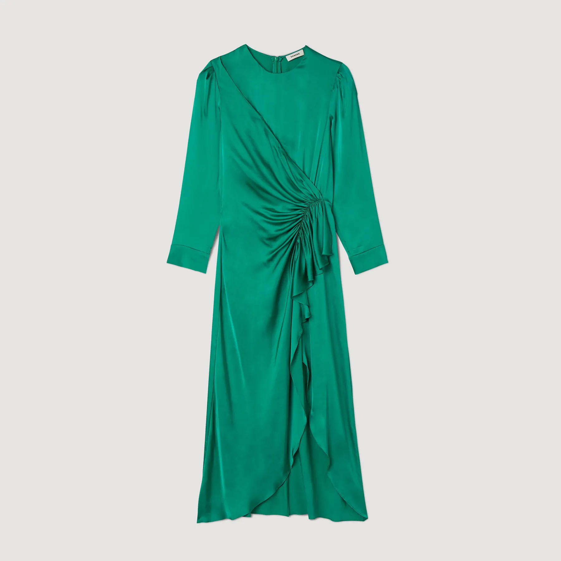 Satin-effect wrap dress with long sleeves, round neckline and embellished with gathers and ruffle details on the side.