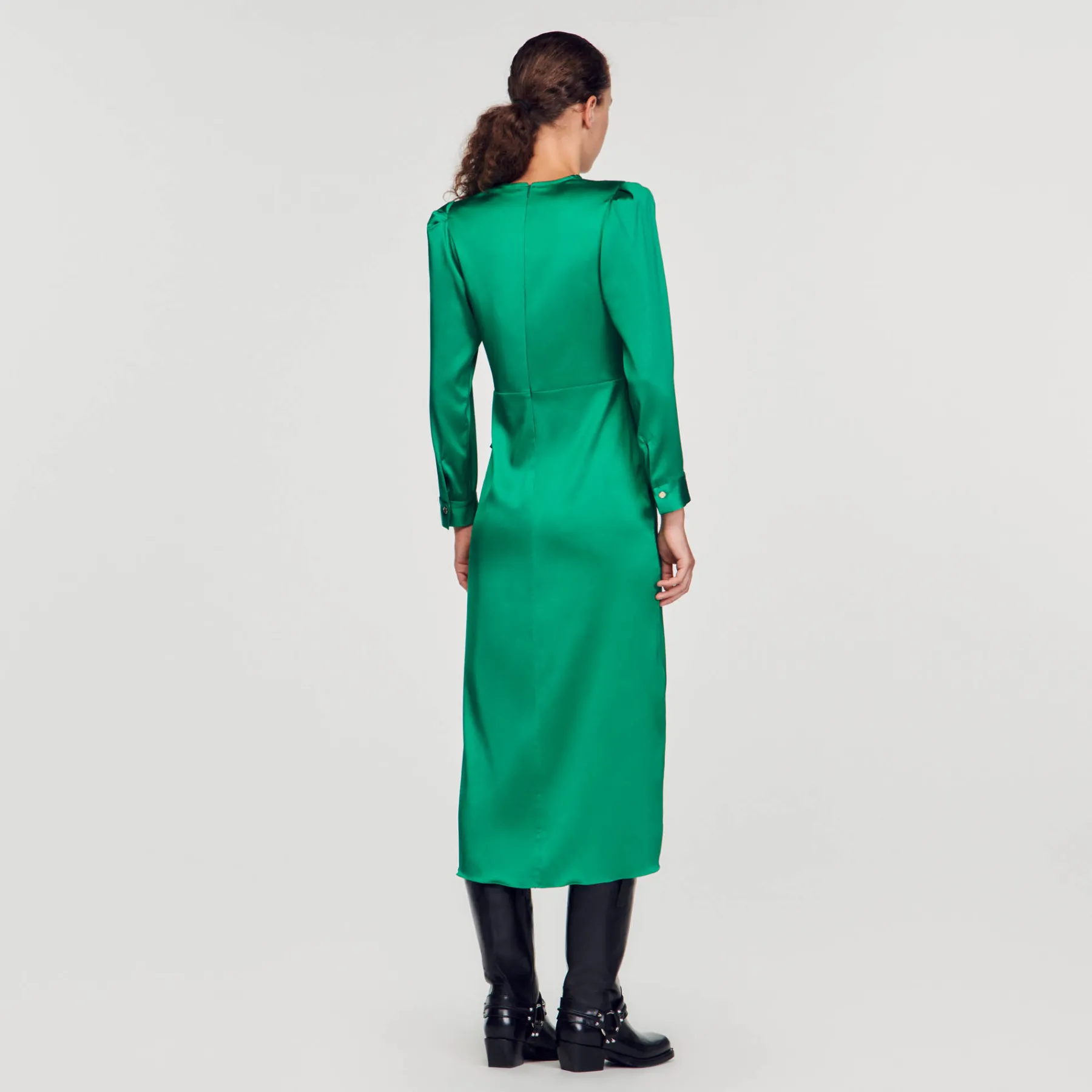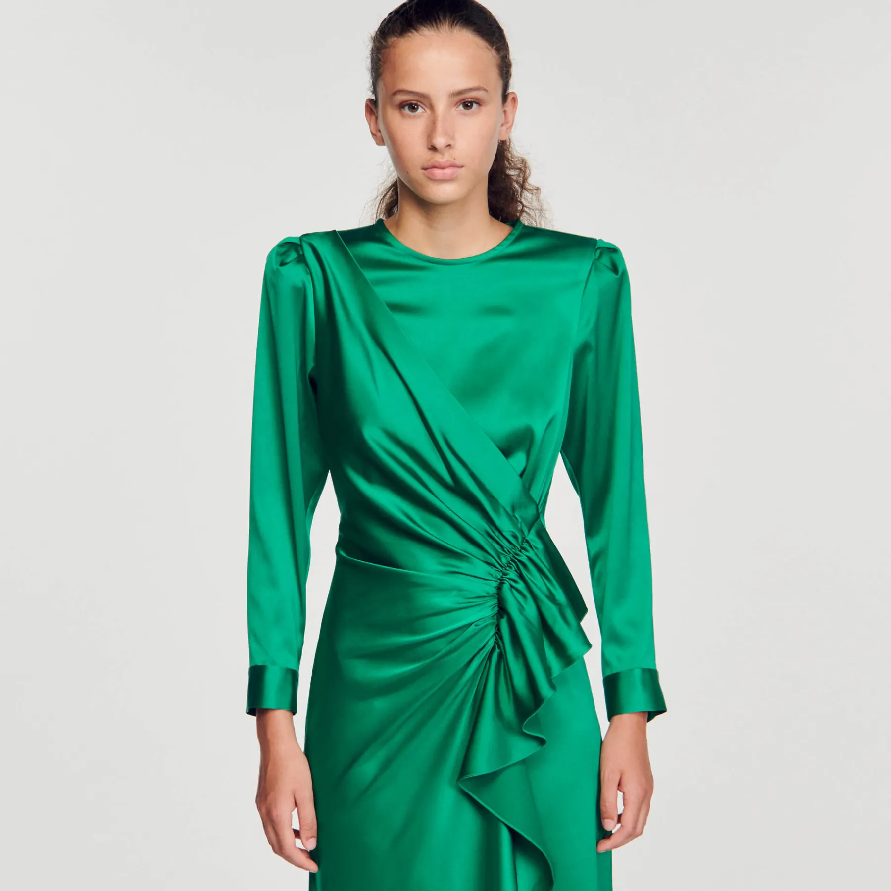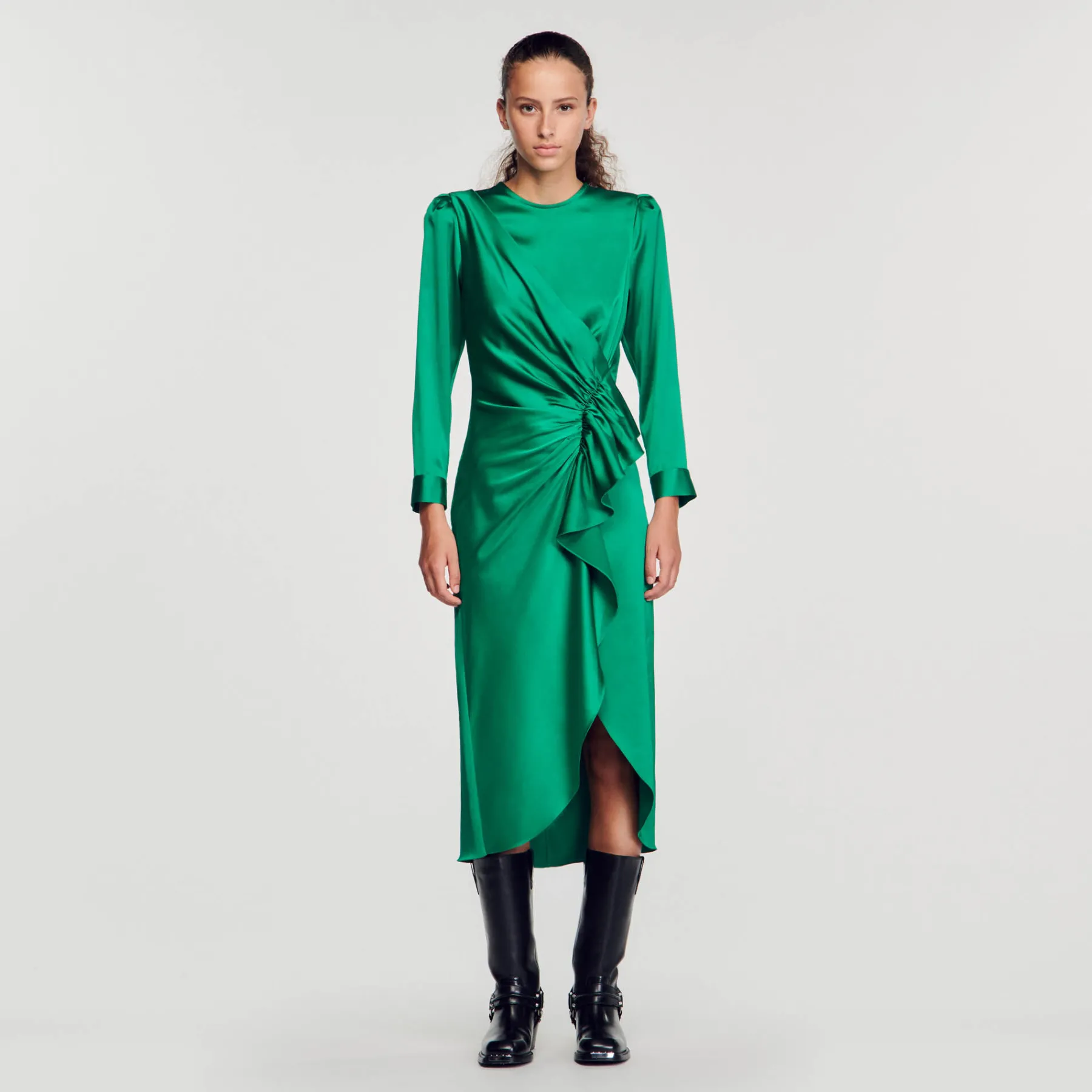 Satin-effect wrap dress with long sleeves, round neckline and embellished with gathers and ruffle details on the side.