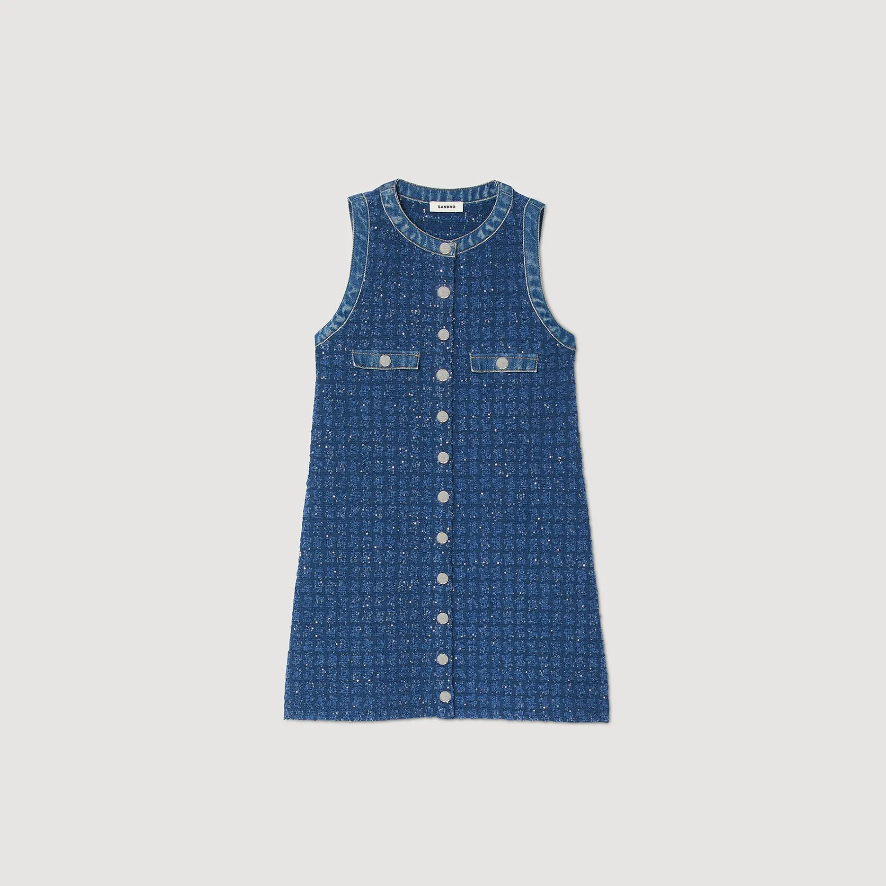 Sleeveless short trapeze dress in glittering tweed-effect decorative knit featuring a round neck, button fastening and welt pockets on the chest.