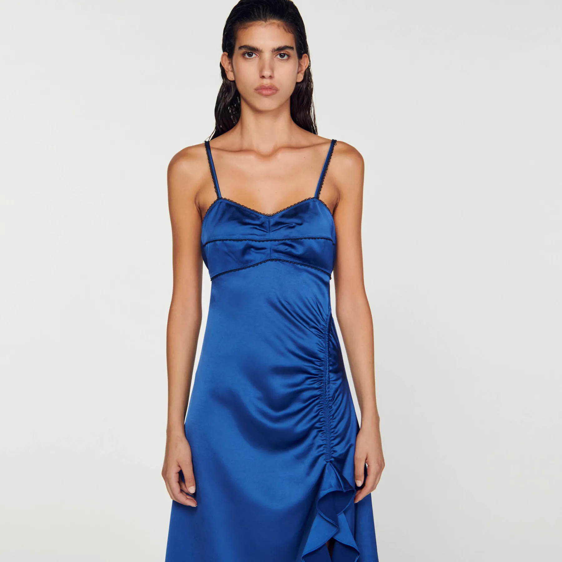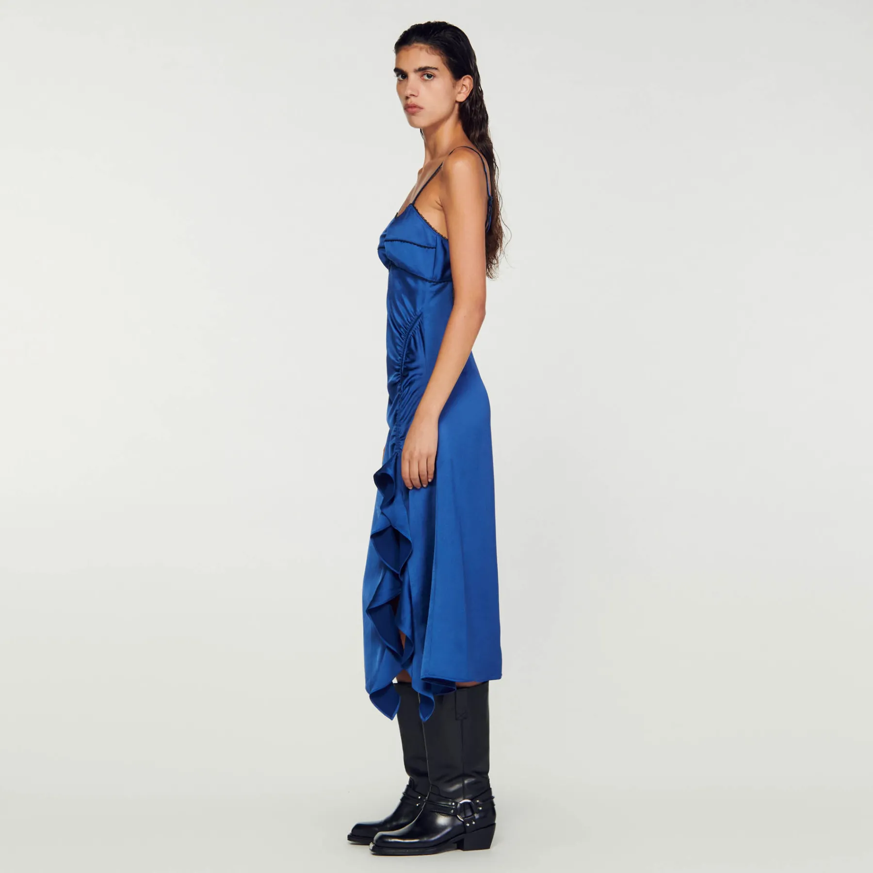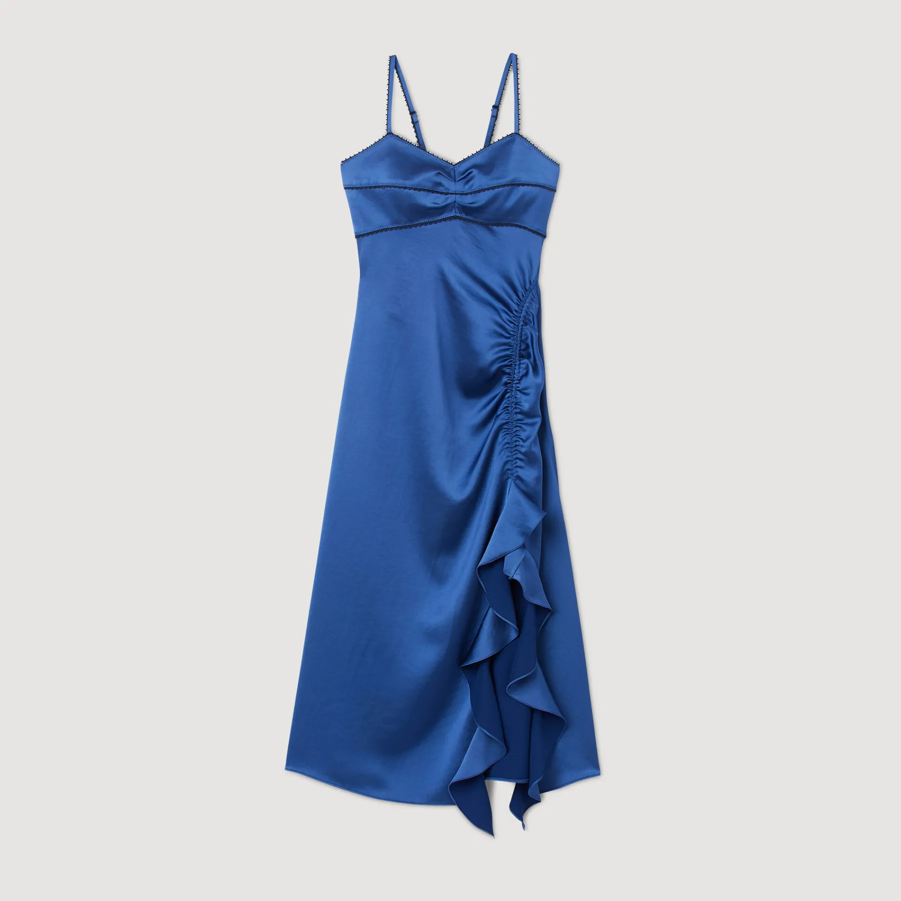 Floaty, satin-effect dress with lingerie-style spaghetti straps, featuring a corset-style neckline, hook-and-eye fastenings at the back, and an asymmetrical skirt gathered and ruffled at the front with drawstrings.