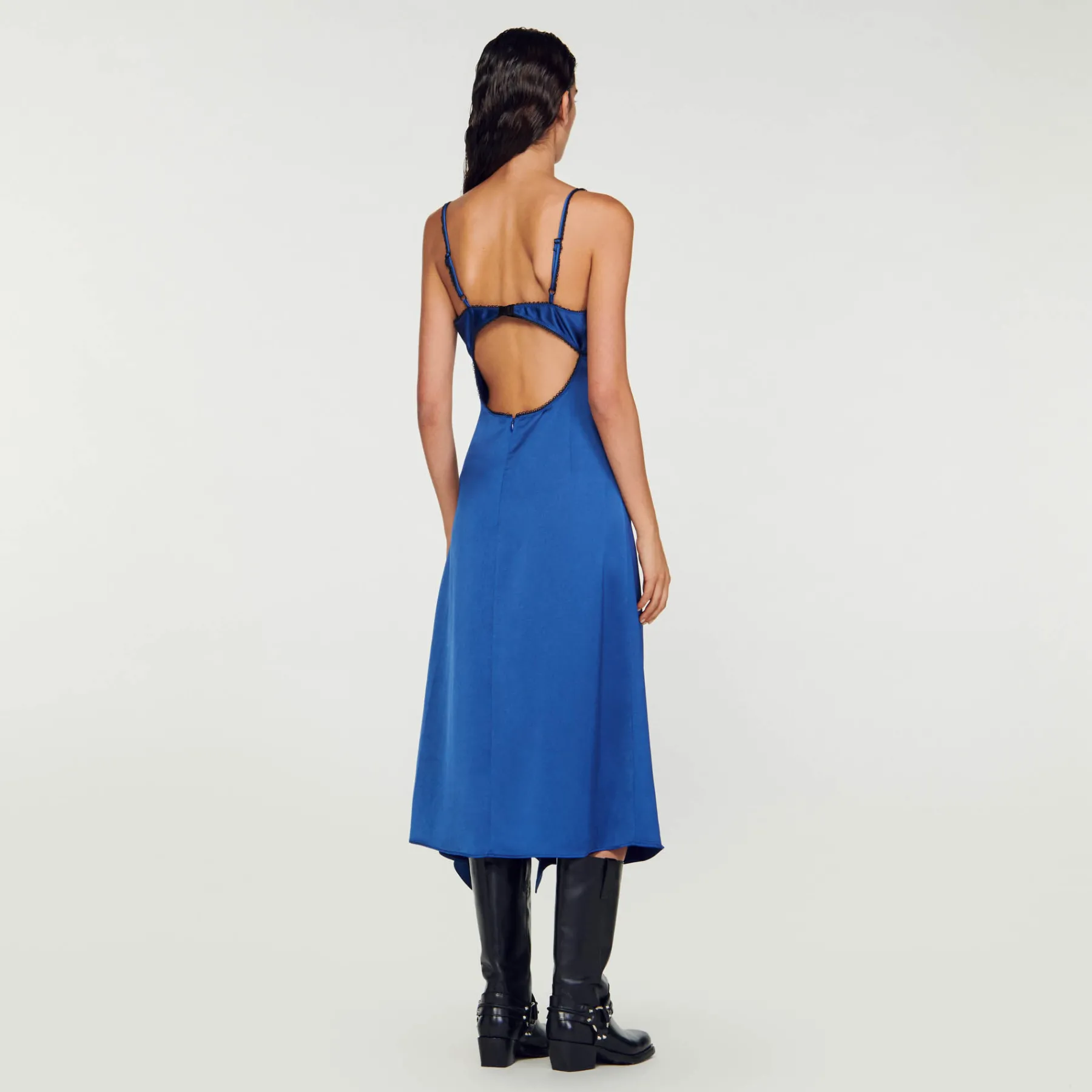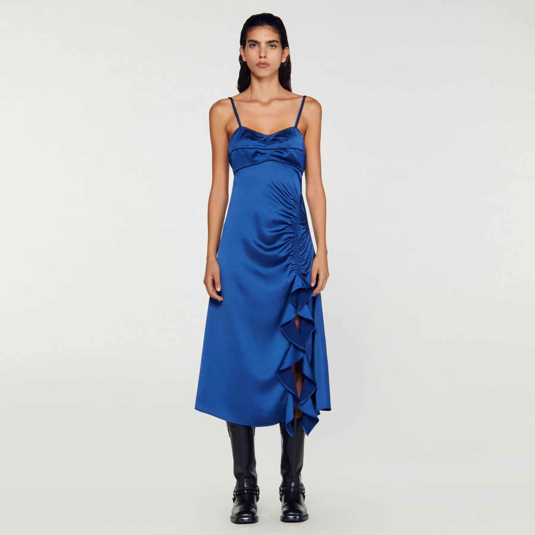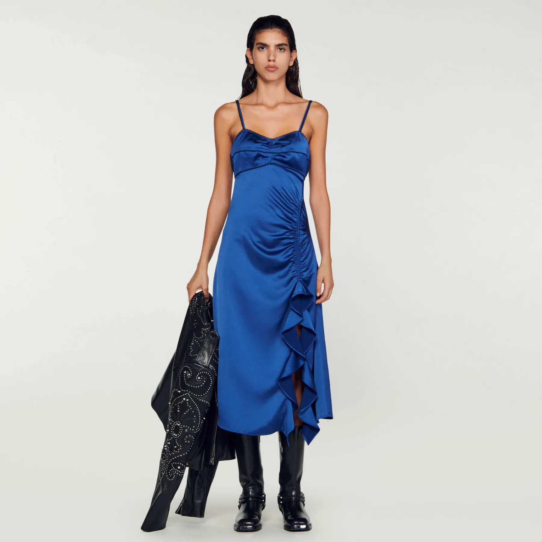 Floaty, satin-effect dress with lingerie-style spaghetti straps, featuring a corset-style neckline, hook-and-eye fastenings at the back, and an asymmetrical skirt gathered and ruffled at the front with drawstrings.