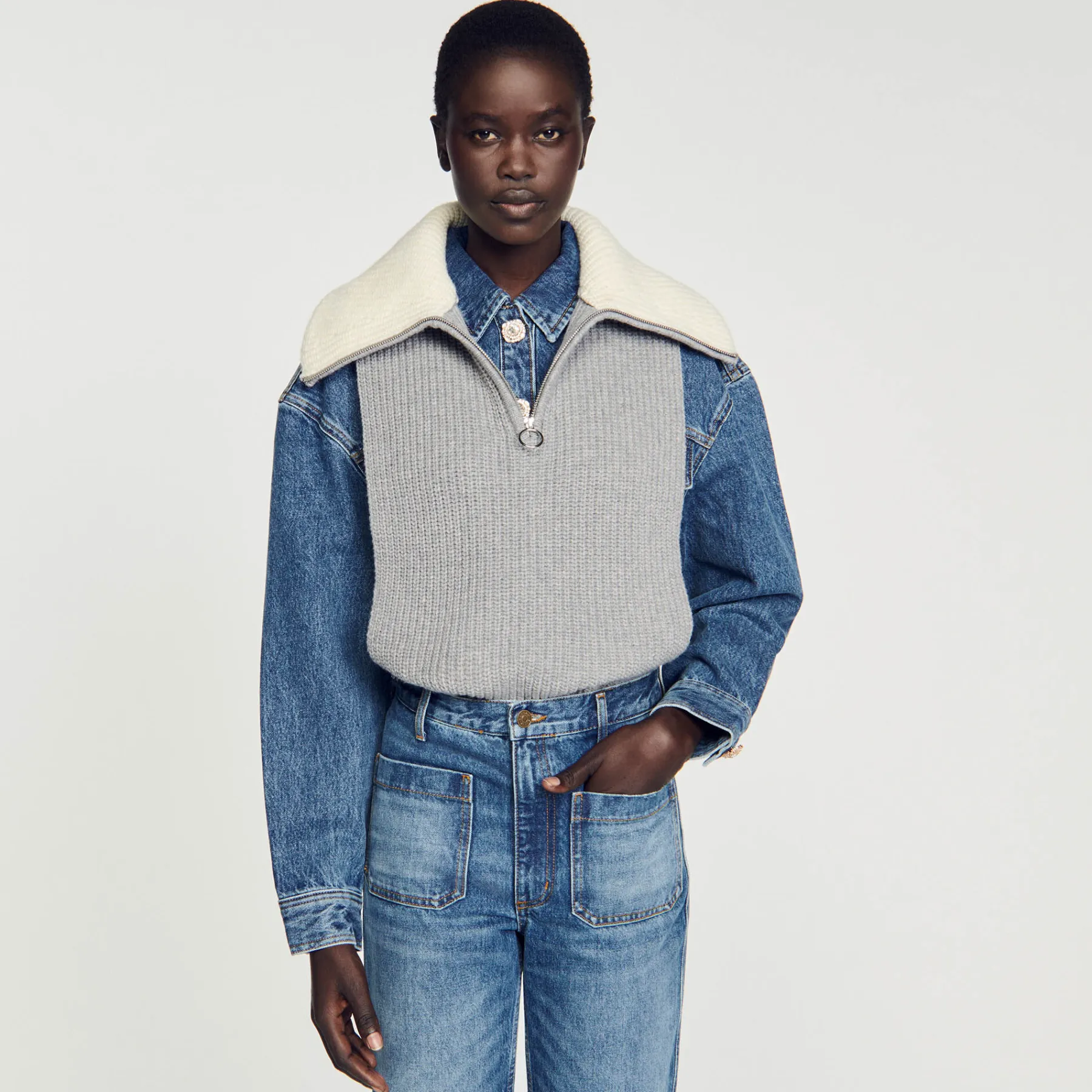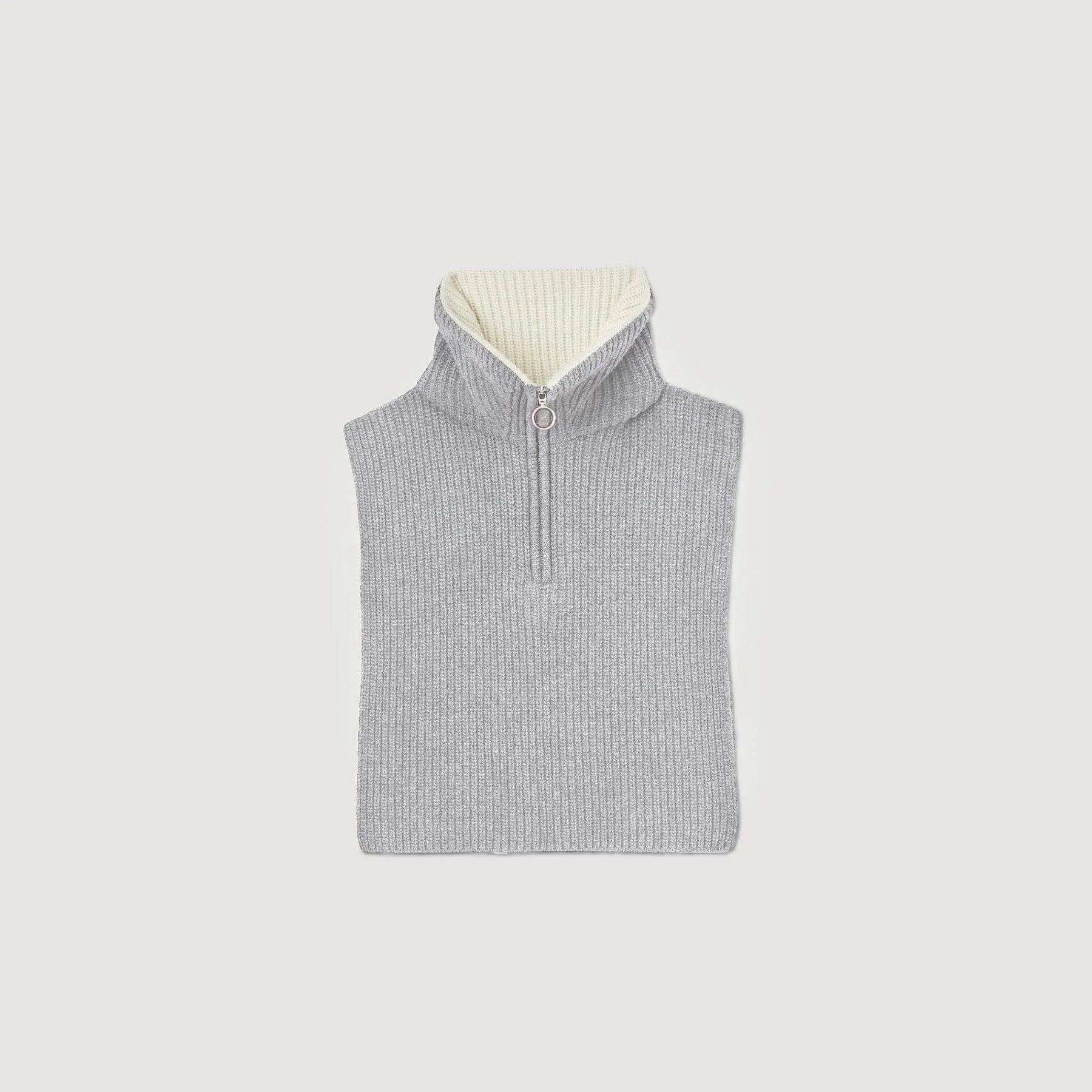 High-neck rib-knit scarf with half-zip and contrasting lapels.