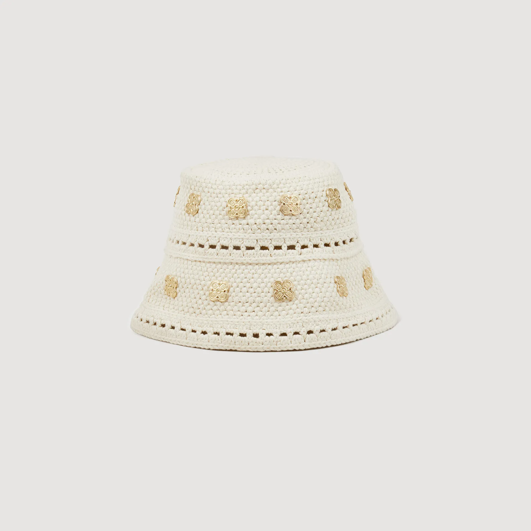 Crochet hat decorated with gold flower sequins.