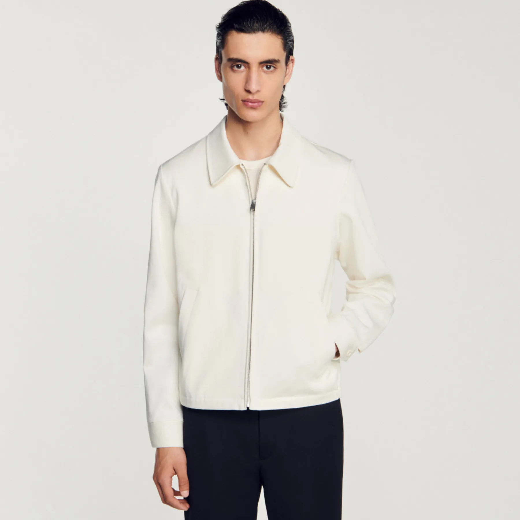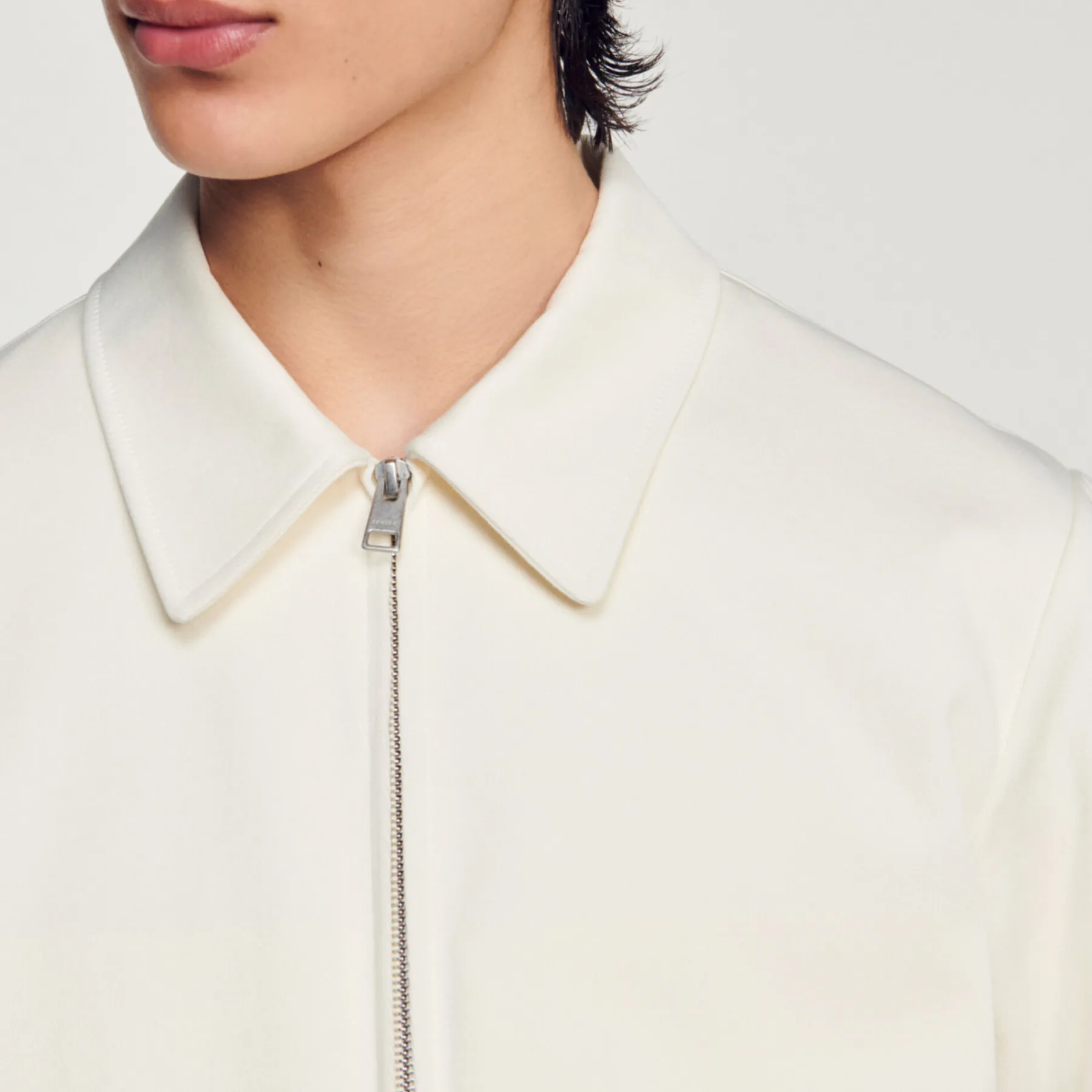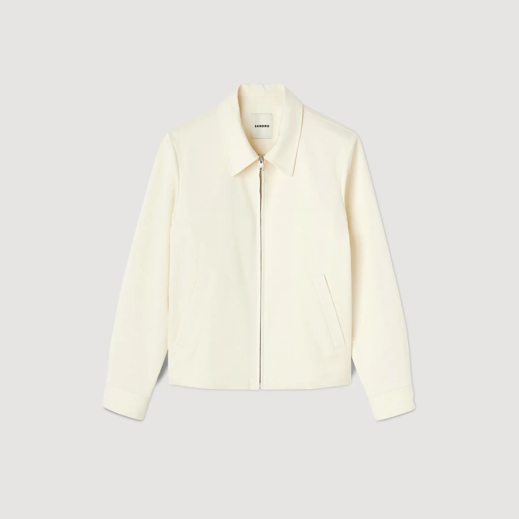 Cotton jacket with a collar, a zipper, long sleeves, buttoned cuffs, and piped pockets.