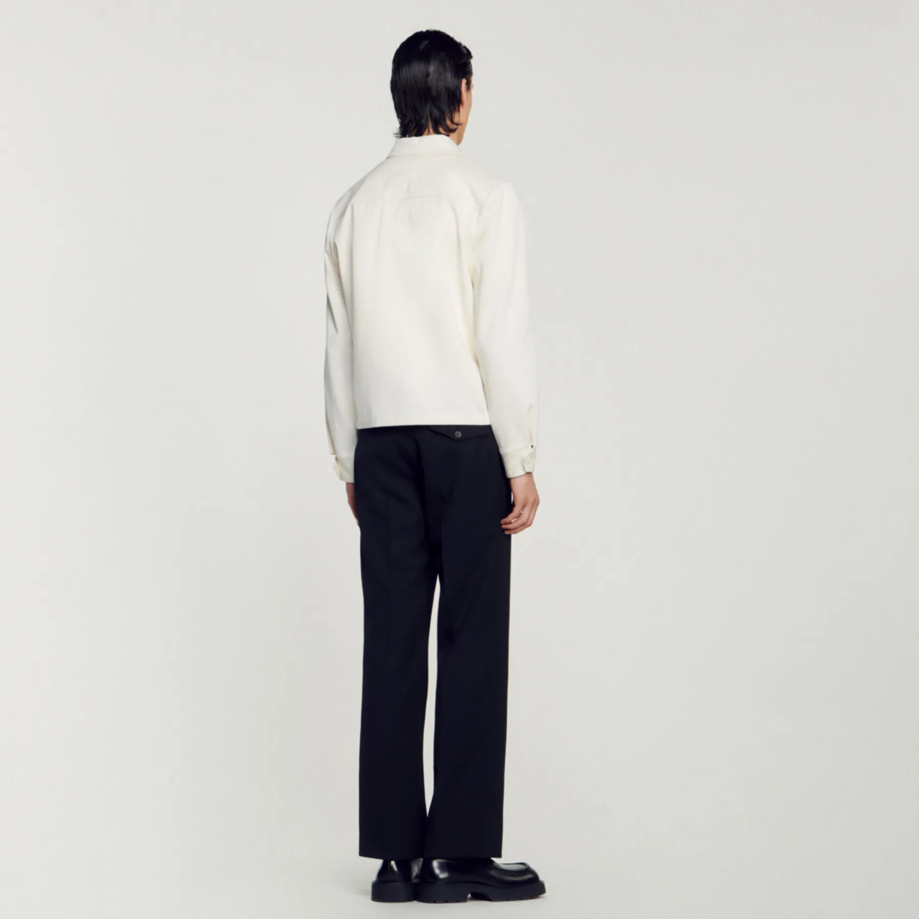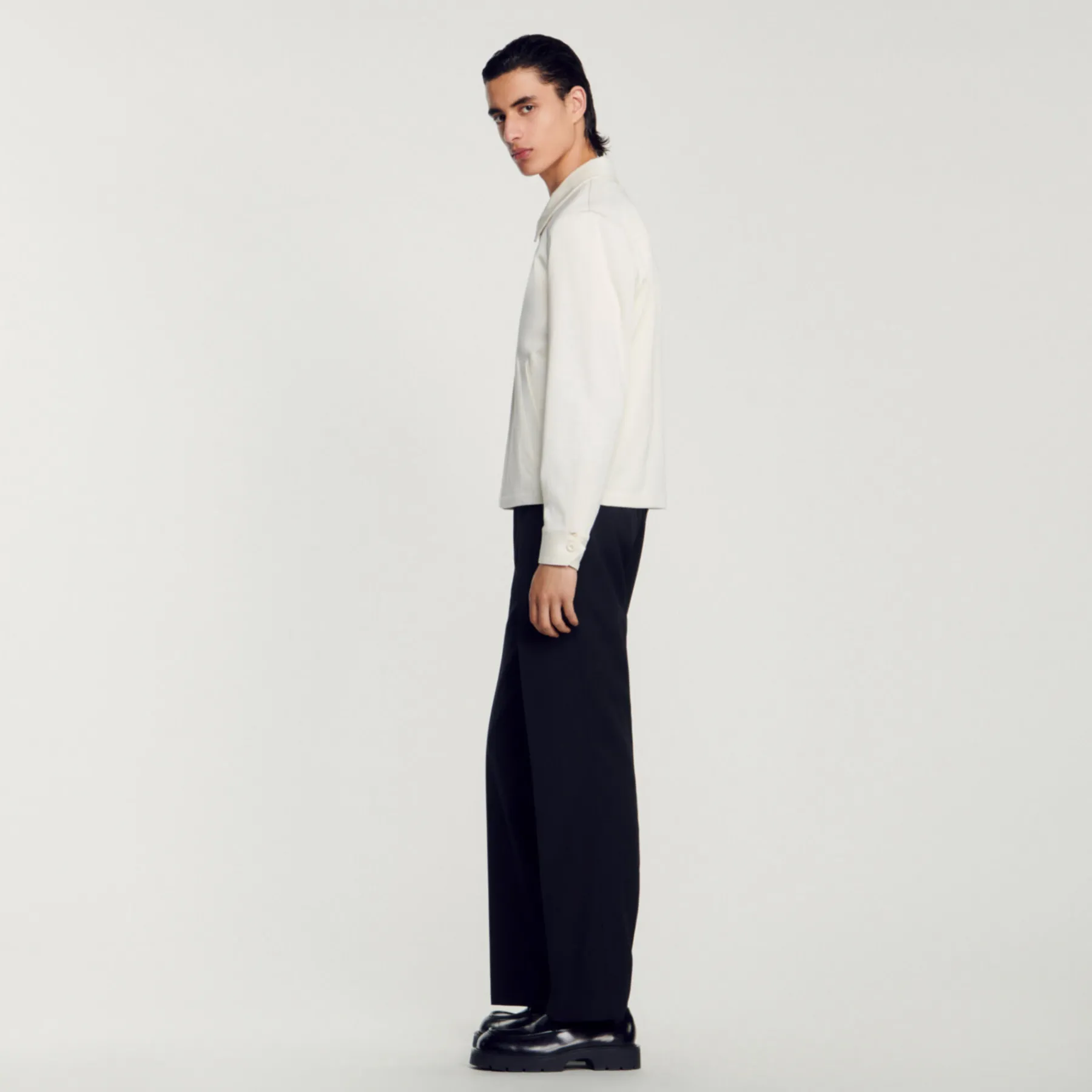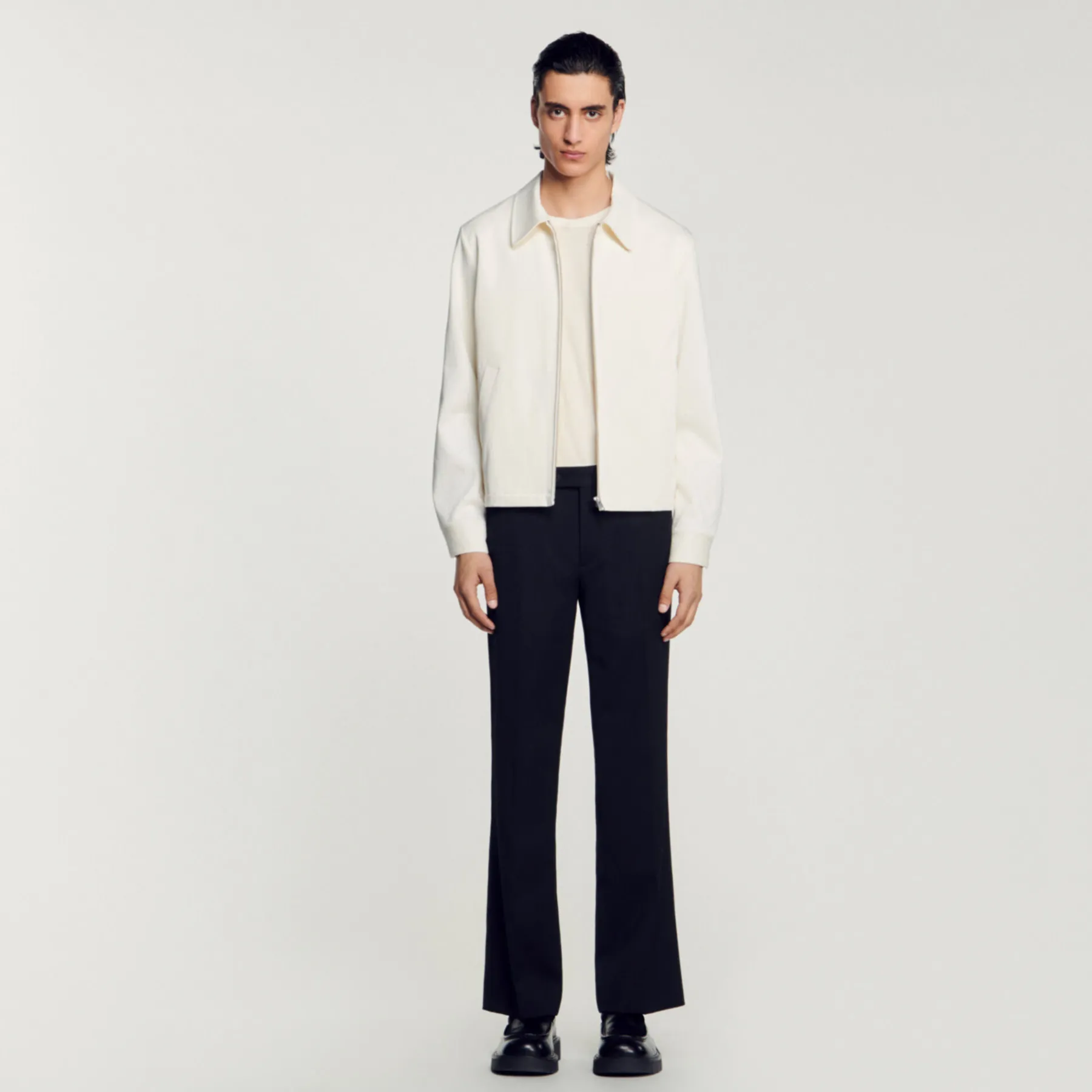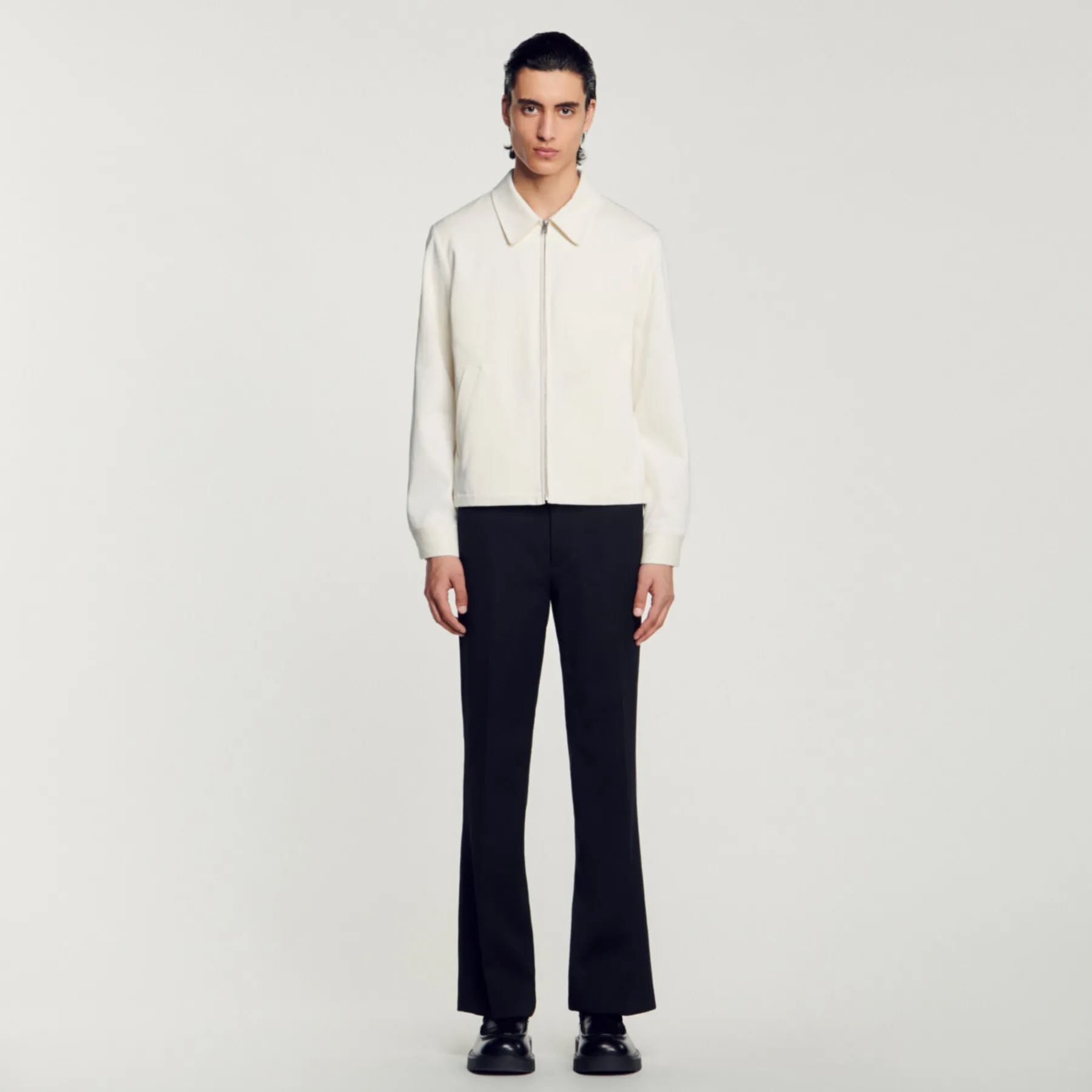 Cotton jacket with a collar, a zipper, long sleeves, buttoned cuffs, and piped pockets.