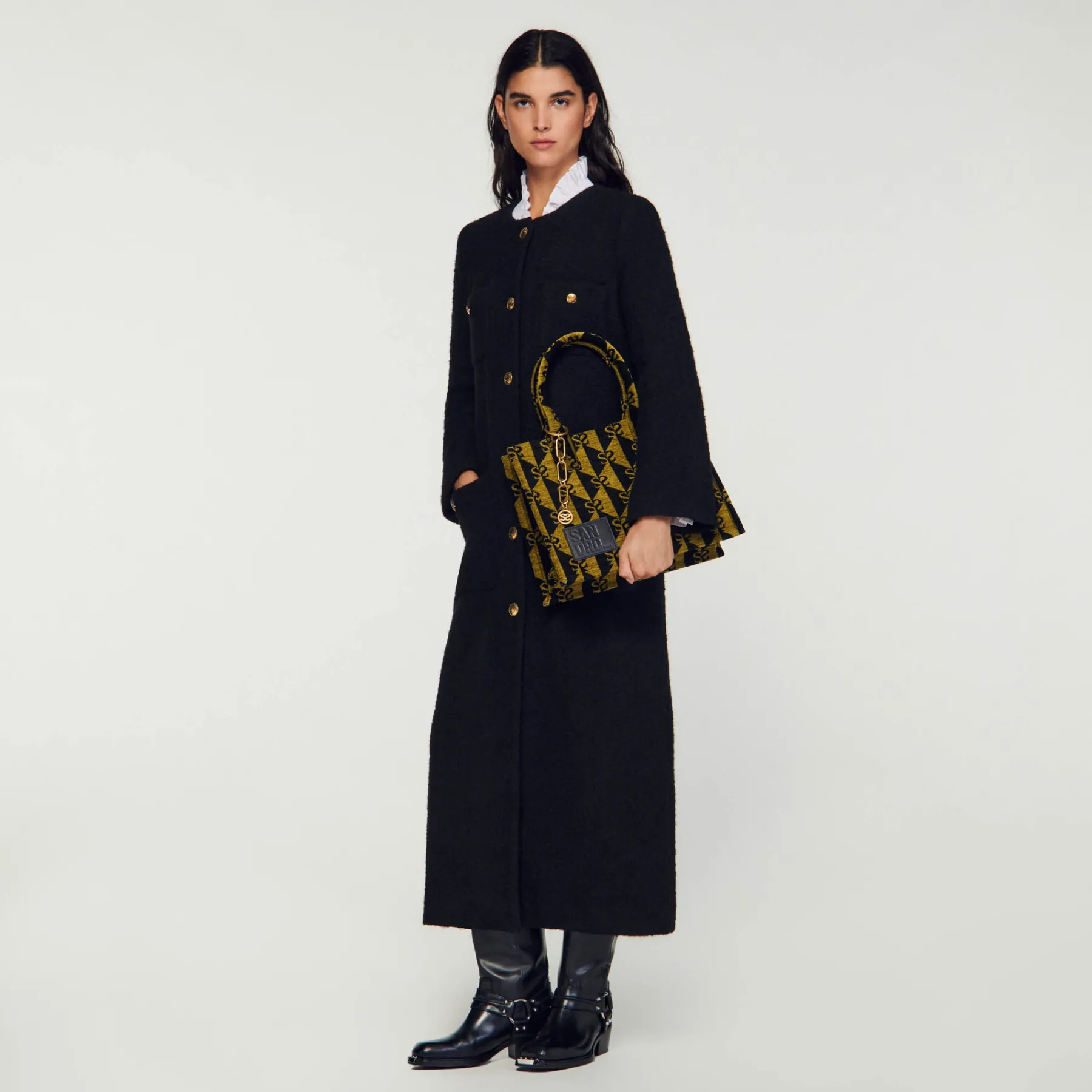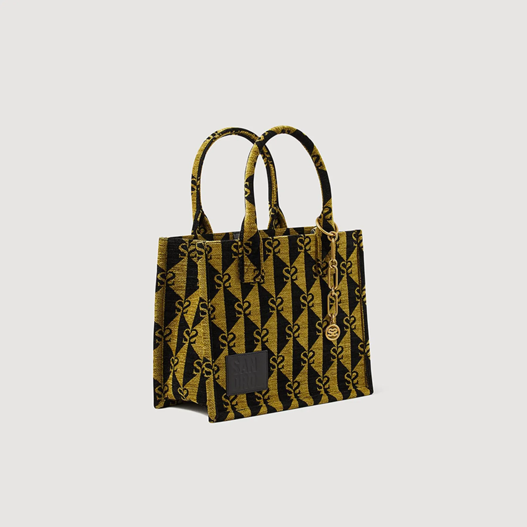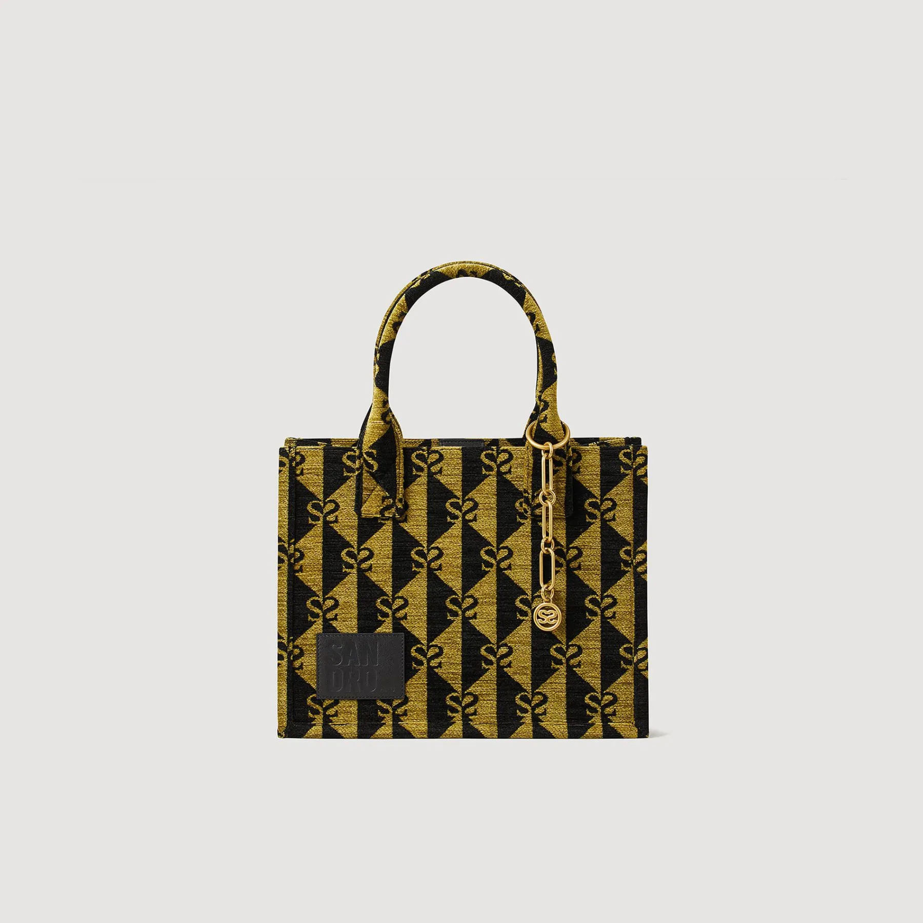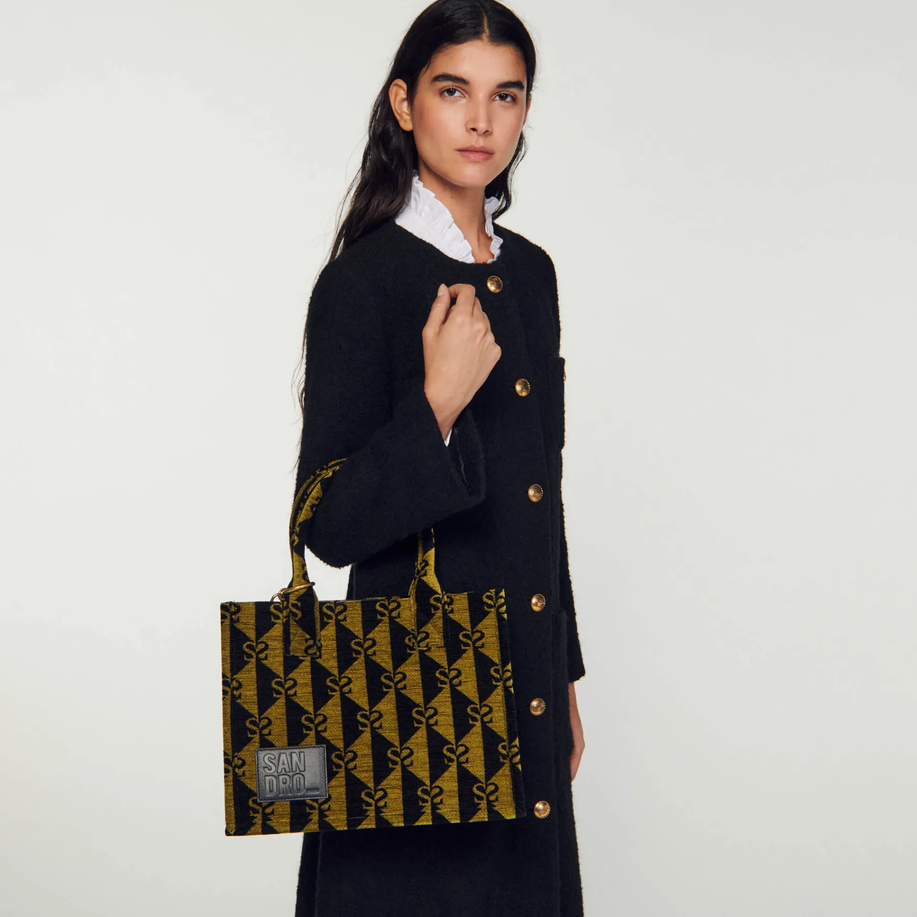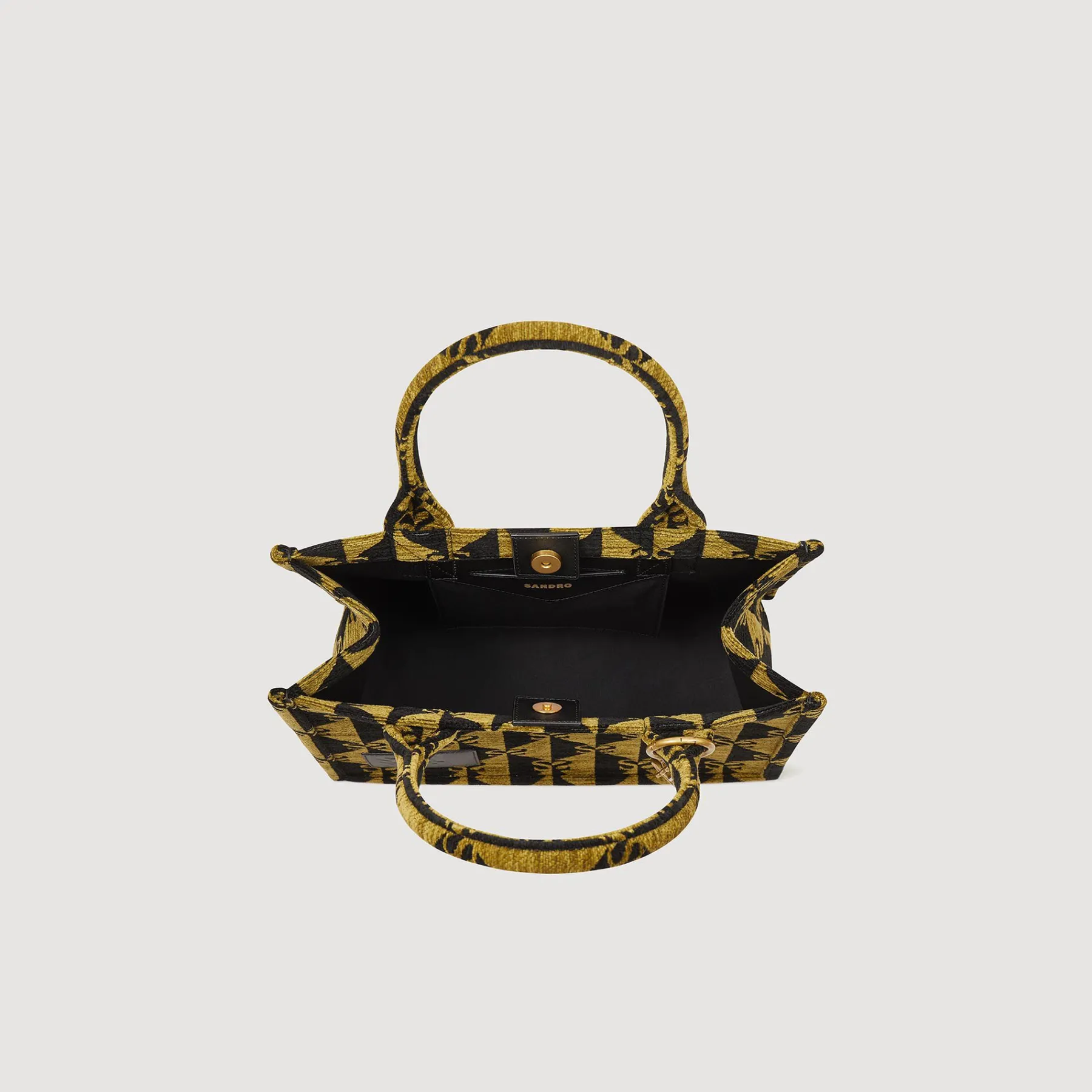 Plain tweed tote bag with geometric pattern, handles, magnetic fastening and removable jewellery chain.