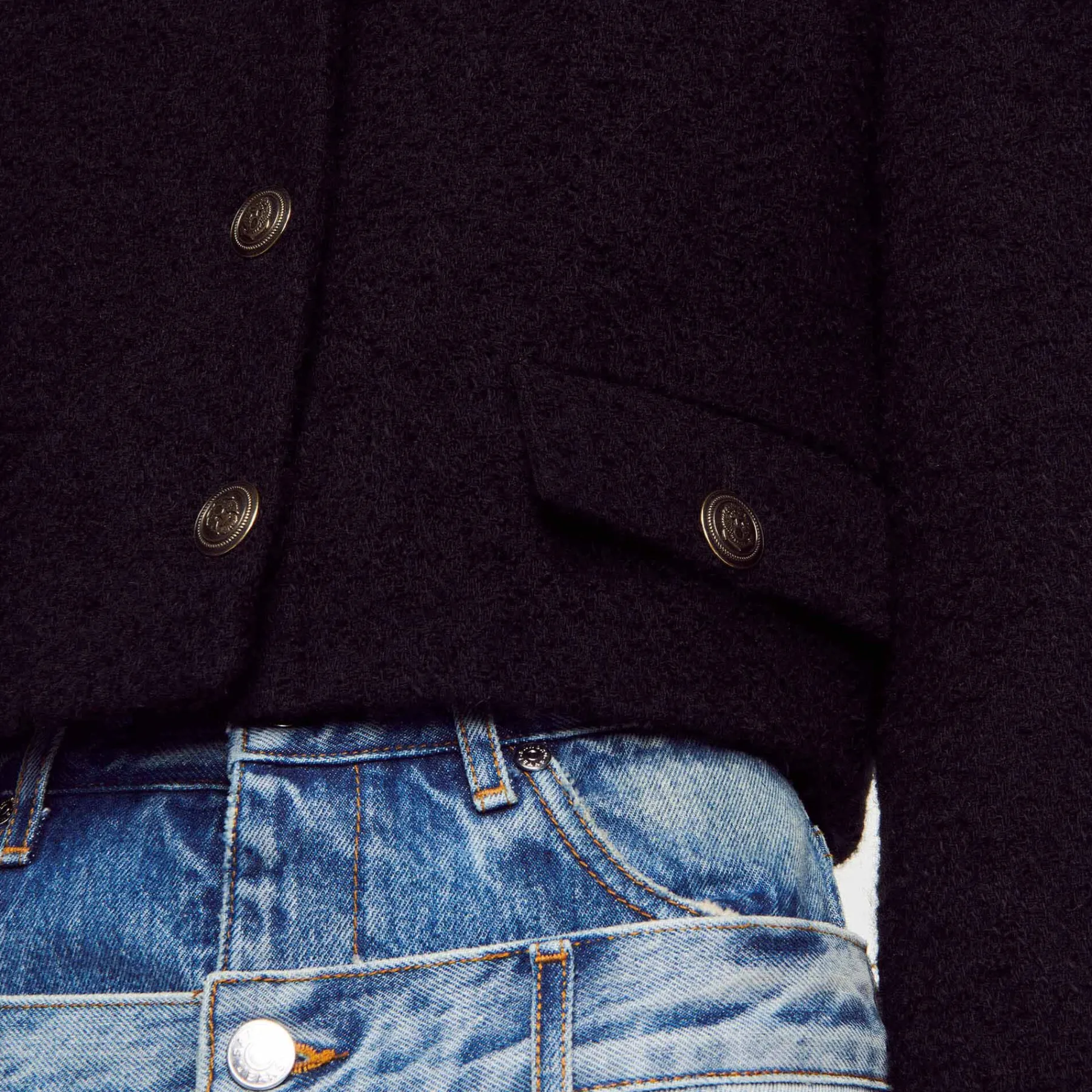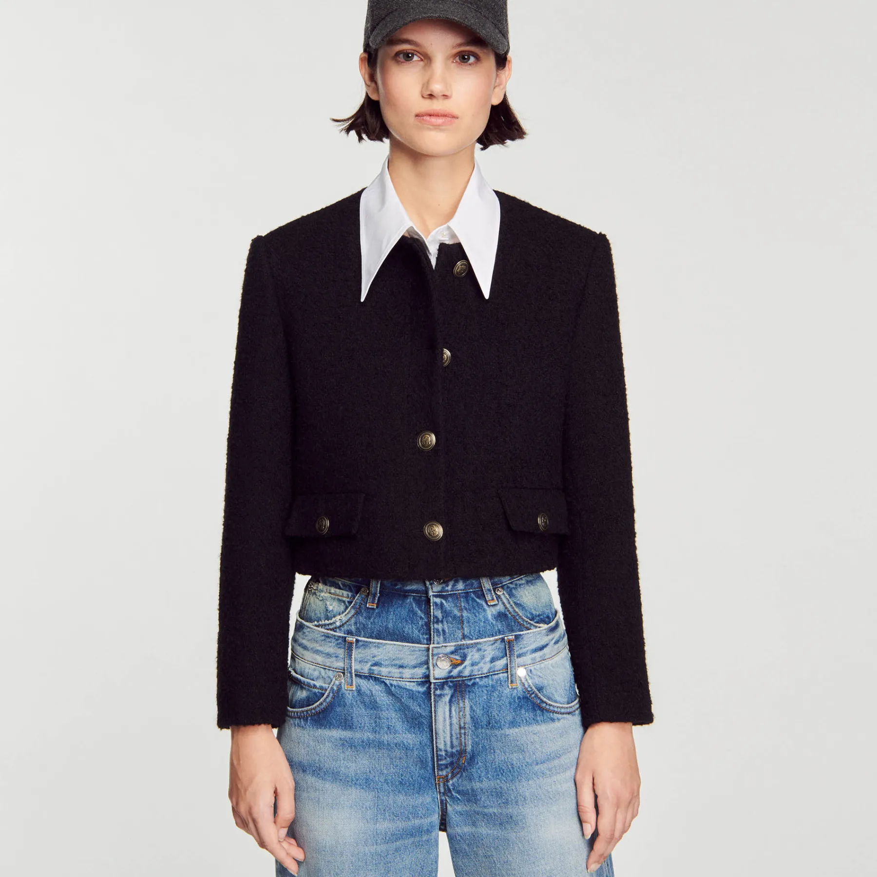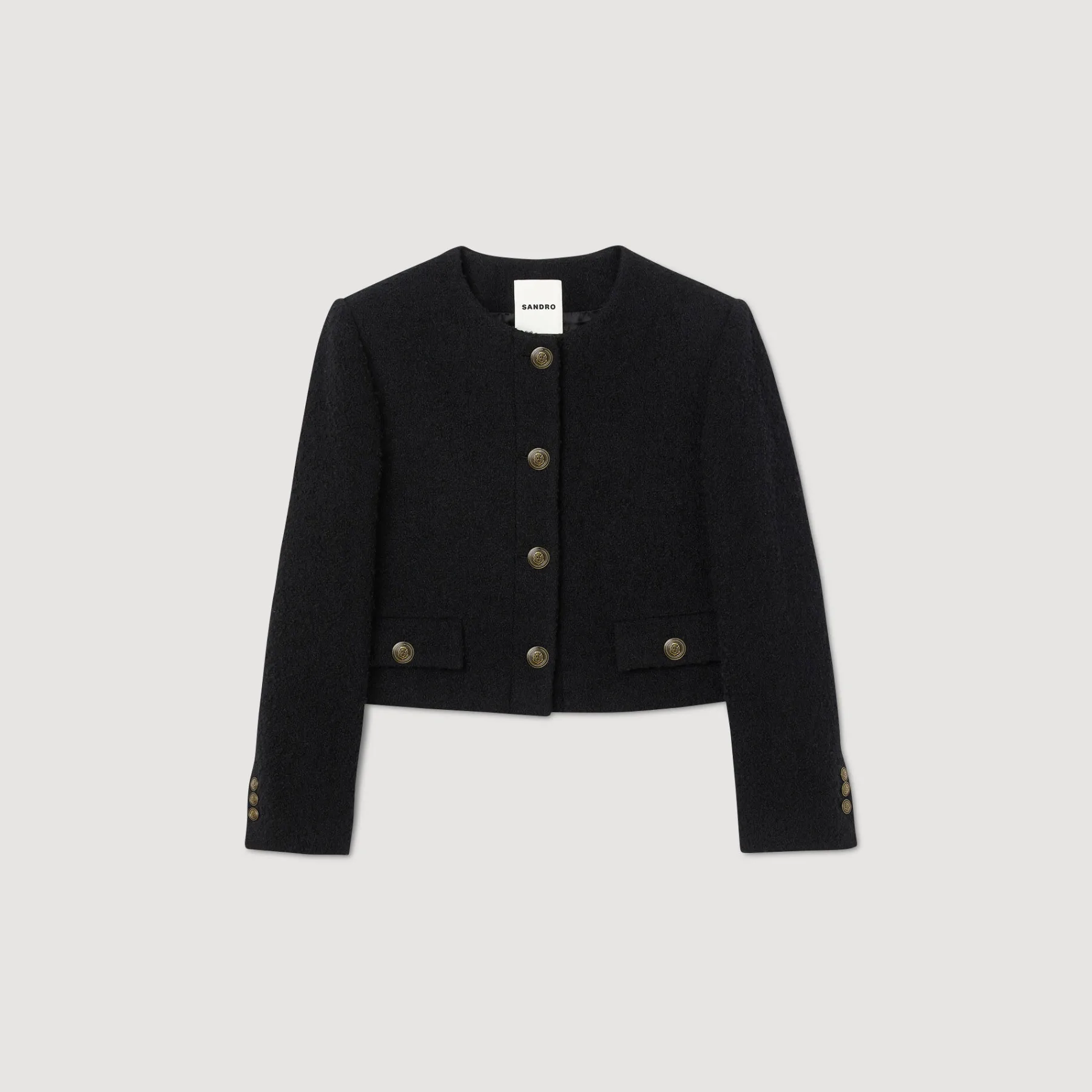 Short, bouclé wool-effect jacket with round collar, long sleeves and decorative button fastening.