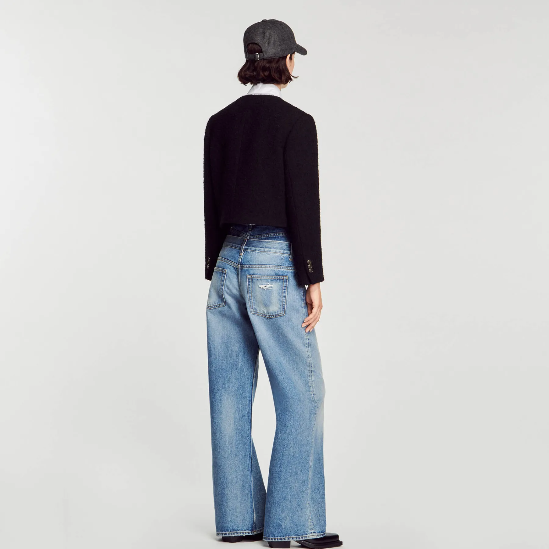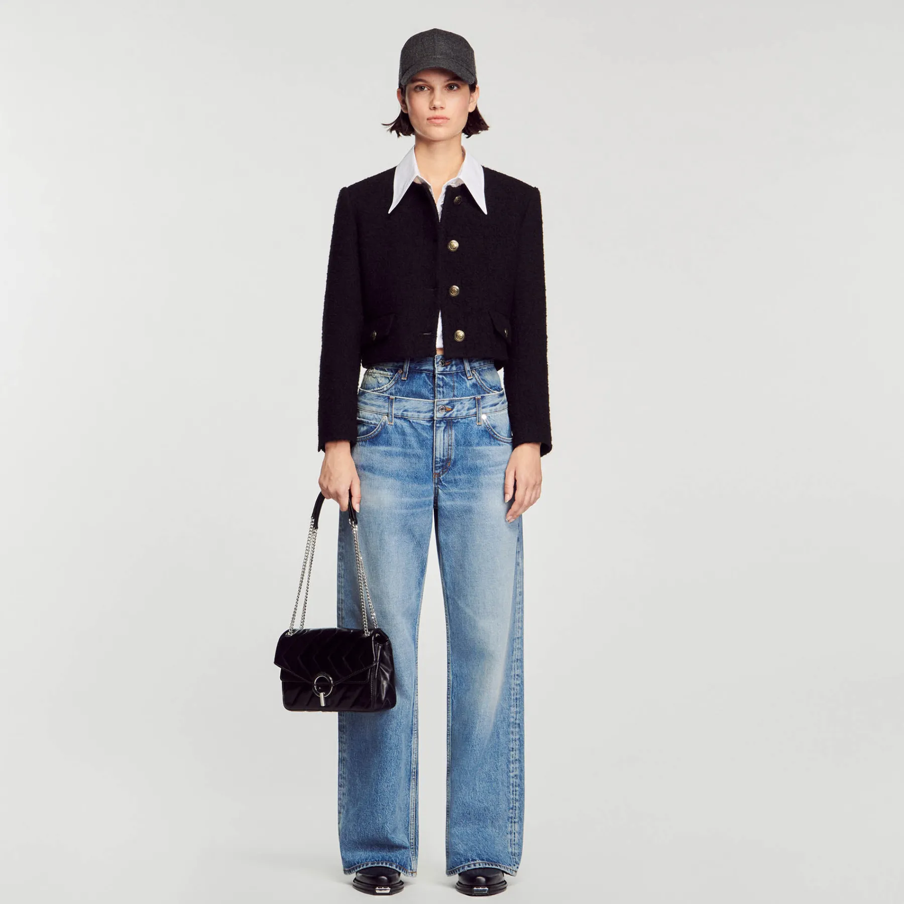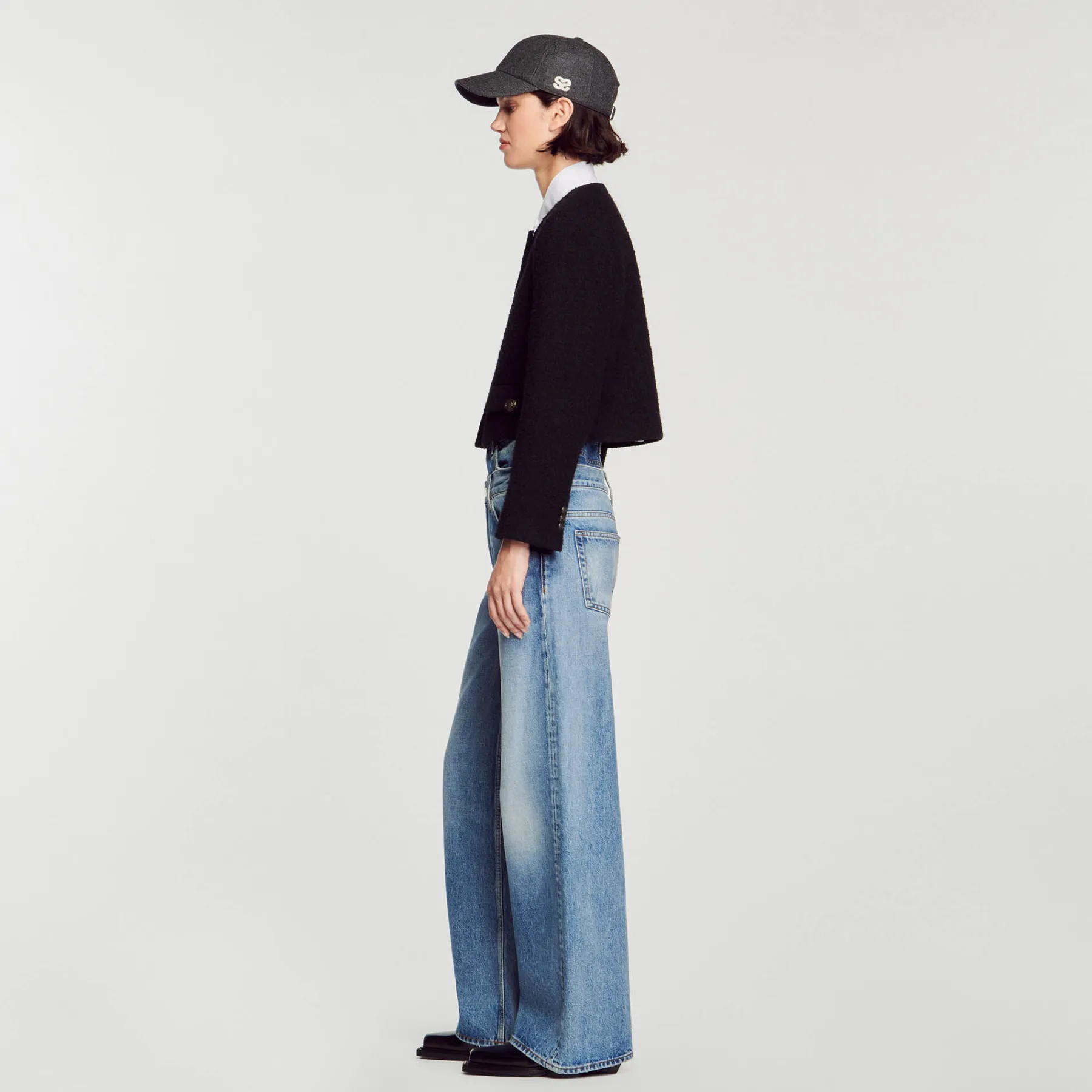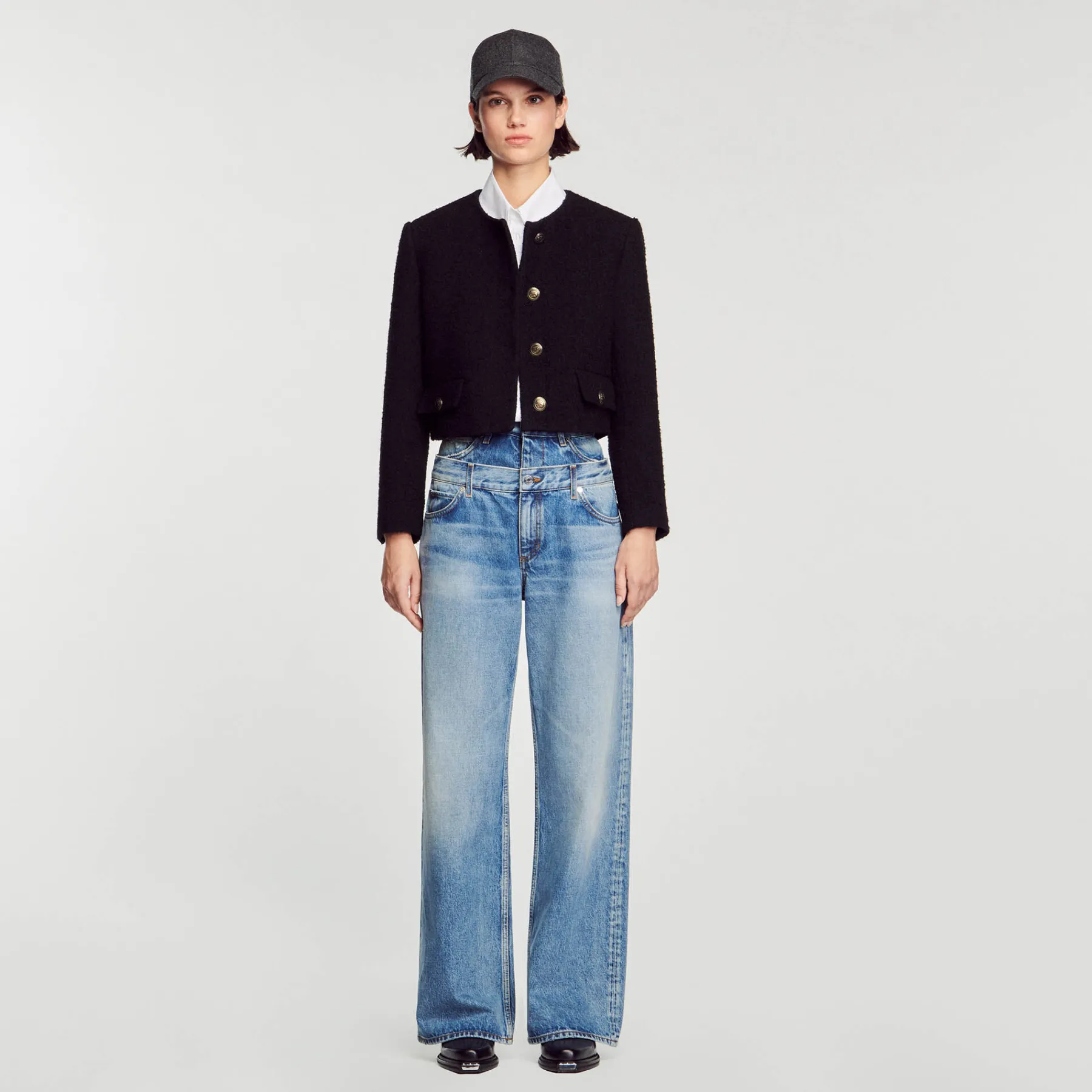 Short, bouclé wool-effect jacket with round collar, long sleeves and decorative button fastening.