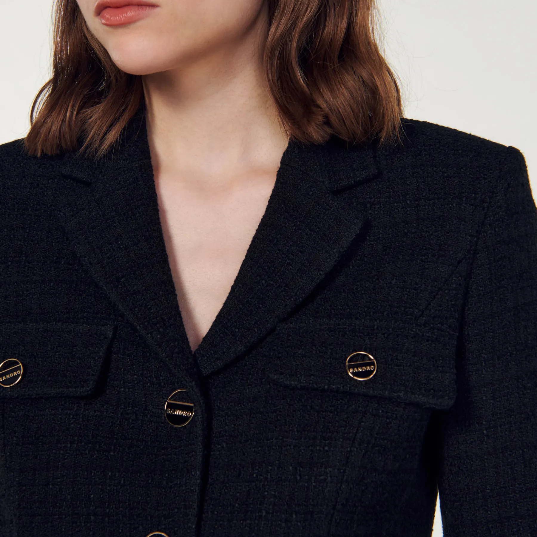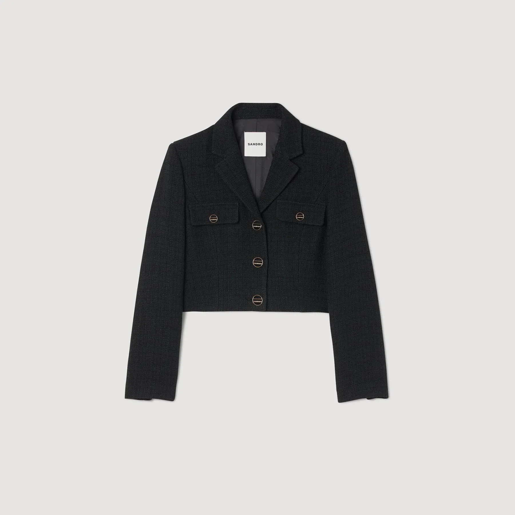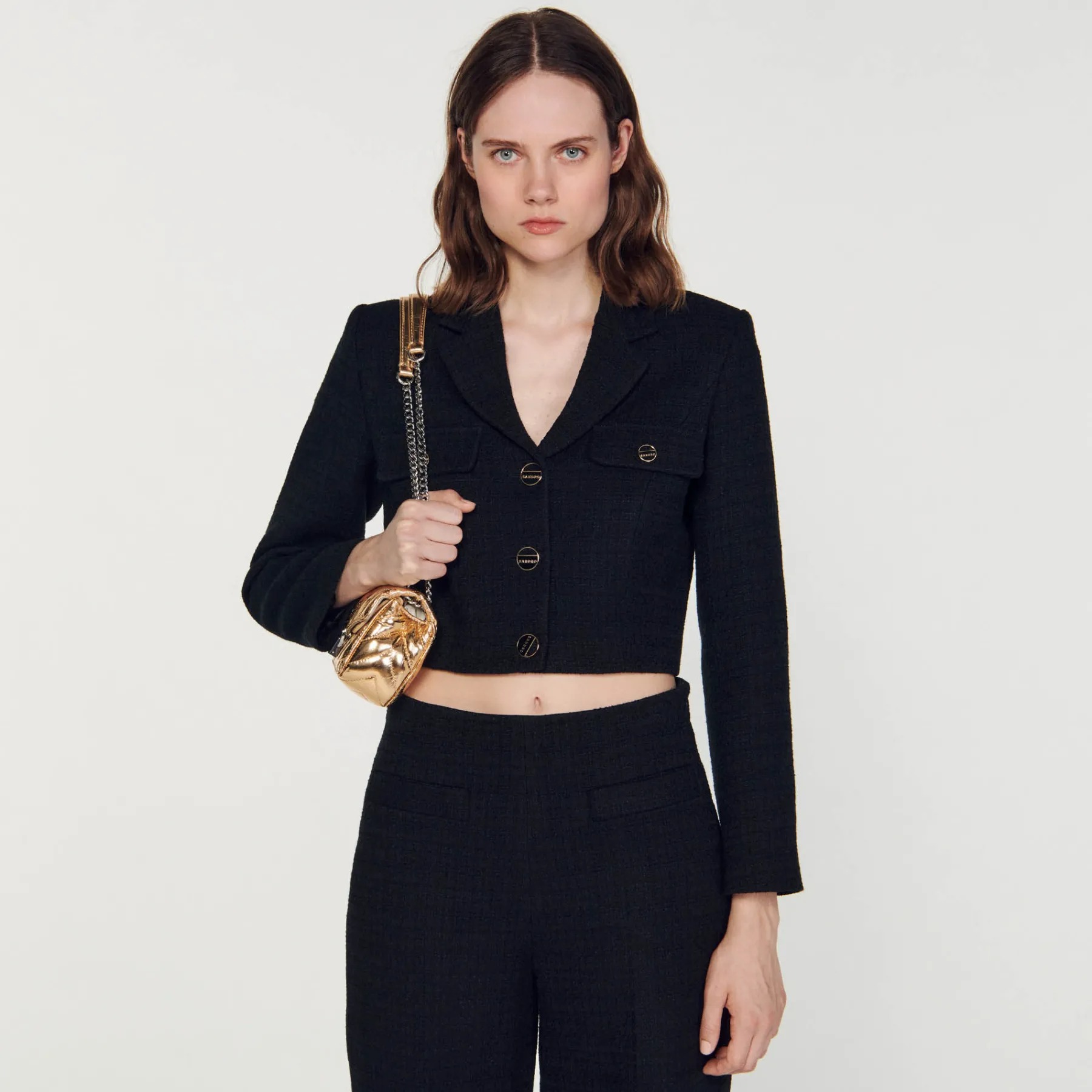 Cropped tweed jacket with a tailore+P34d collar, long sleeves and a textured-button fastening.