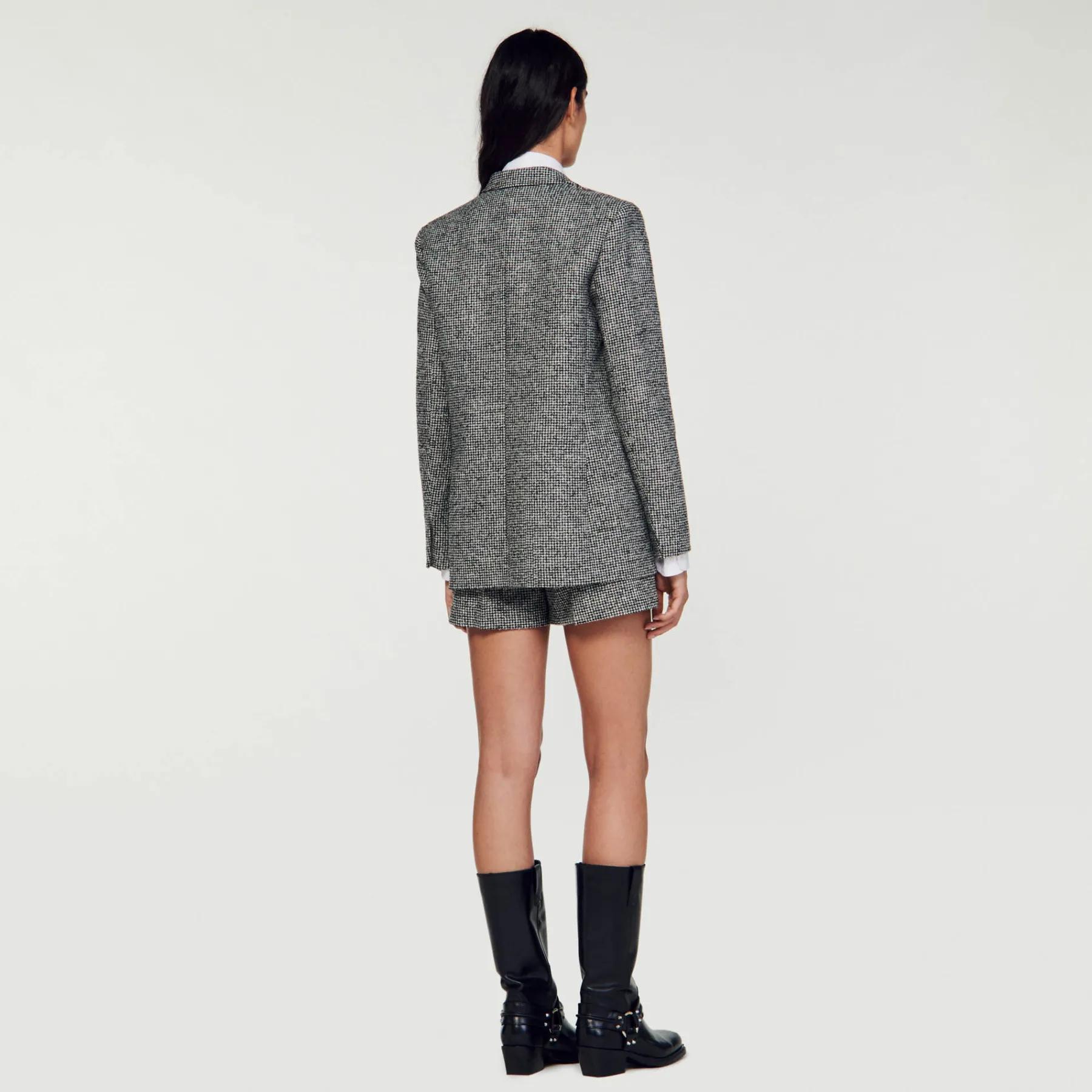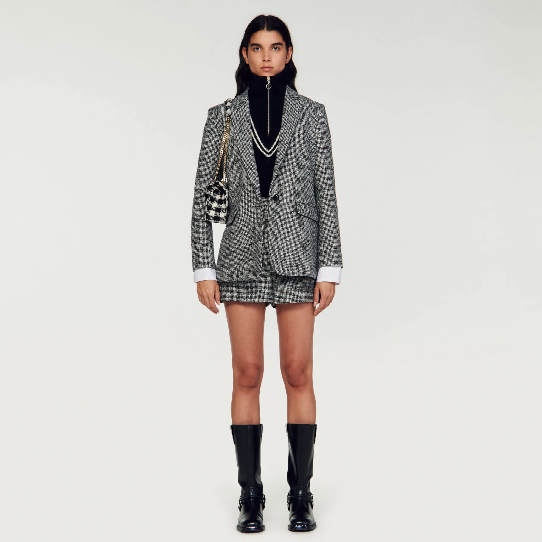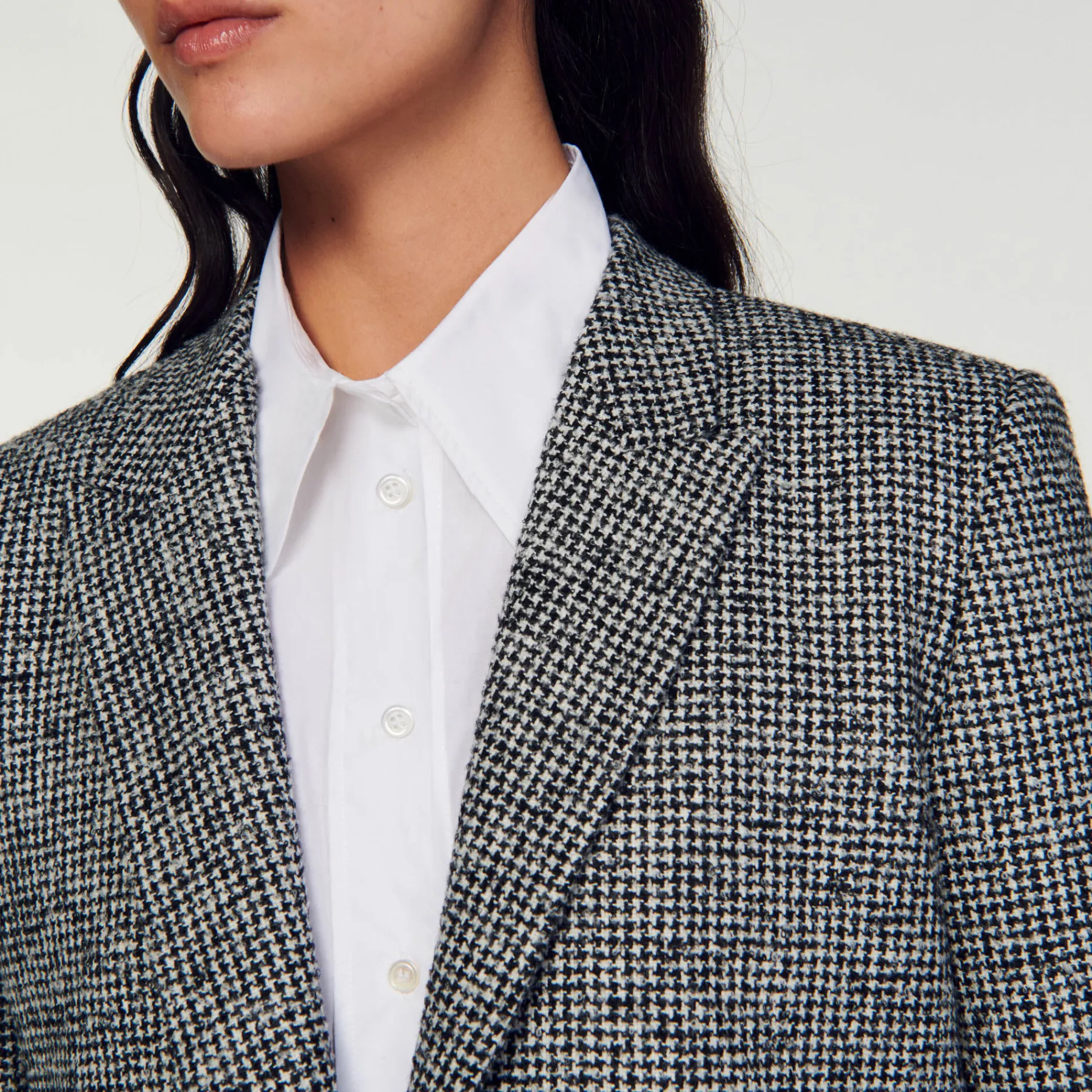 Houndstooth wool-blend blazer with stand-up turn-up collar, long sleeves and welt pockets at the waist.