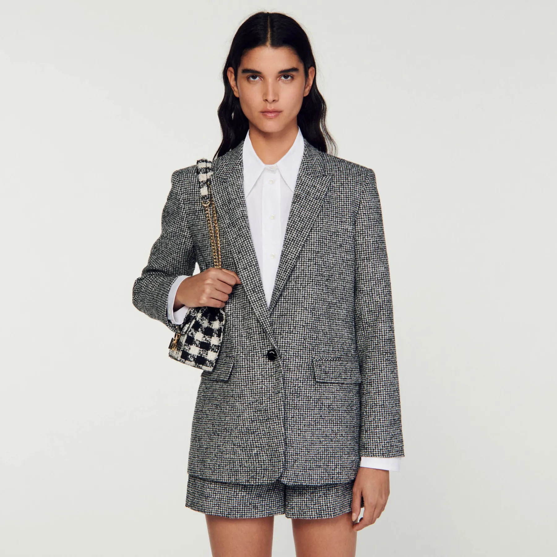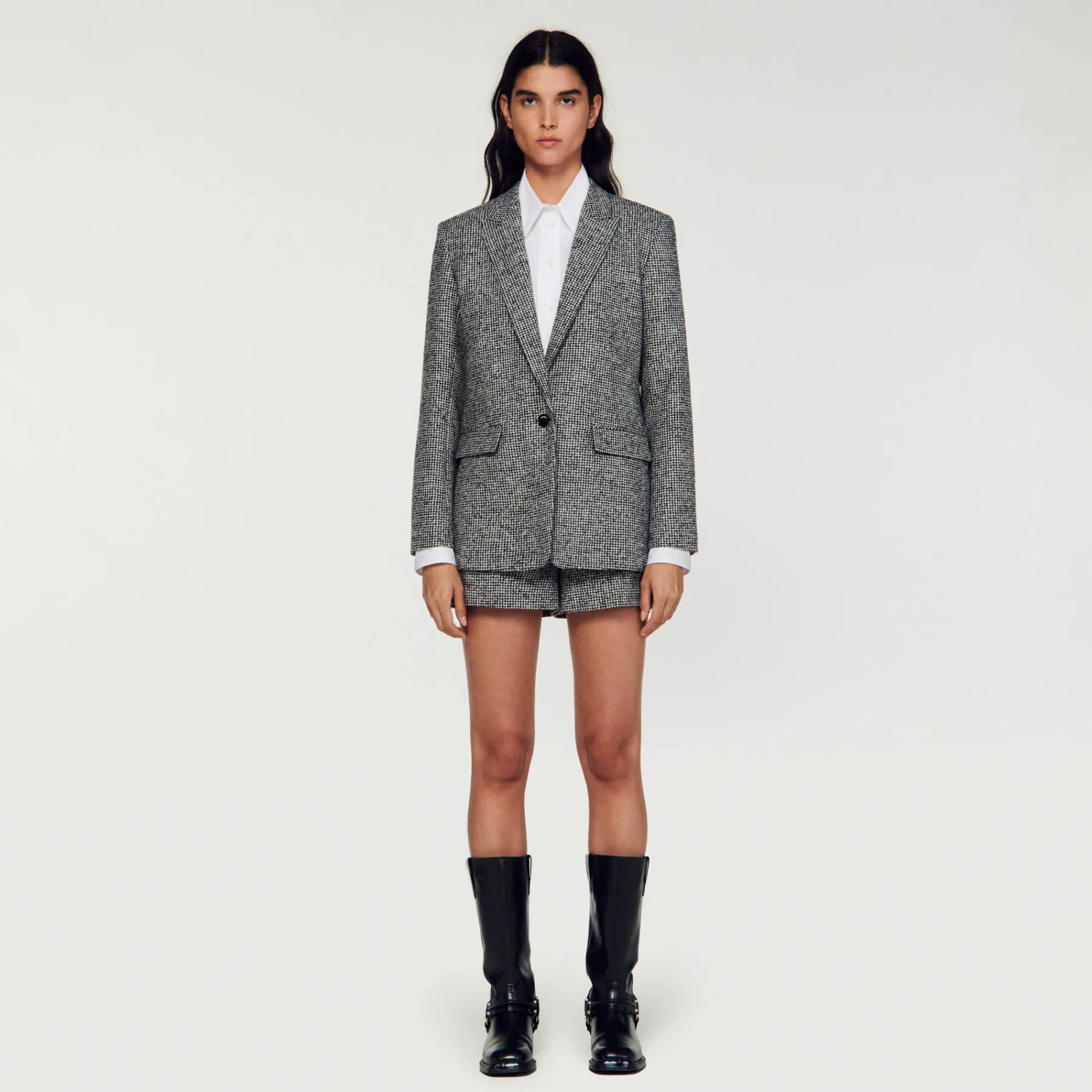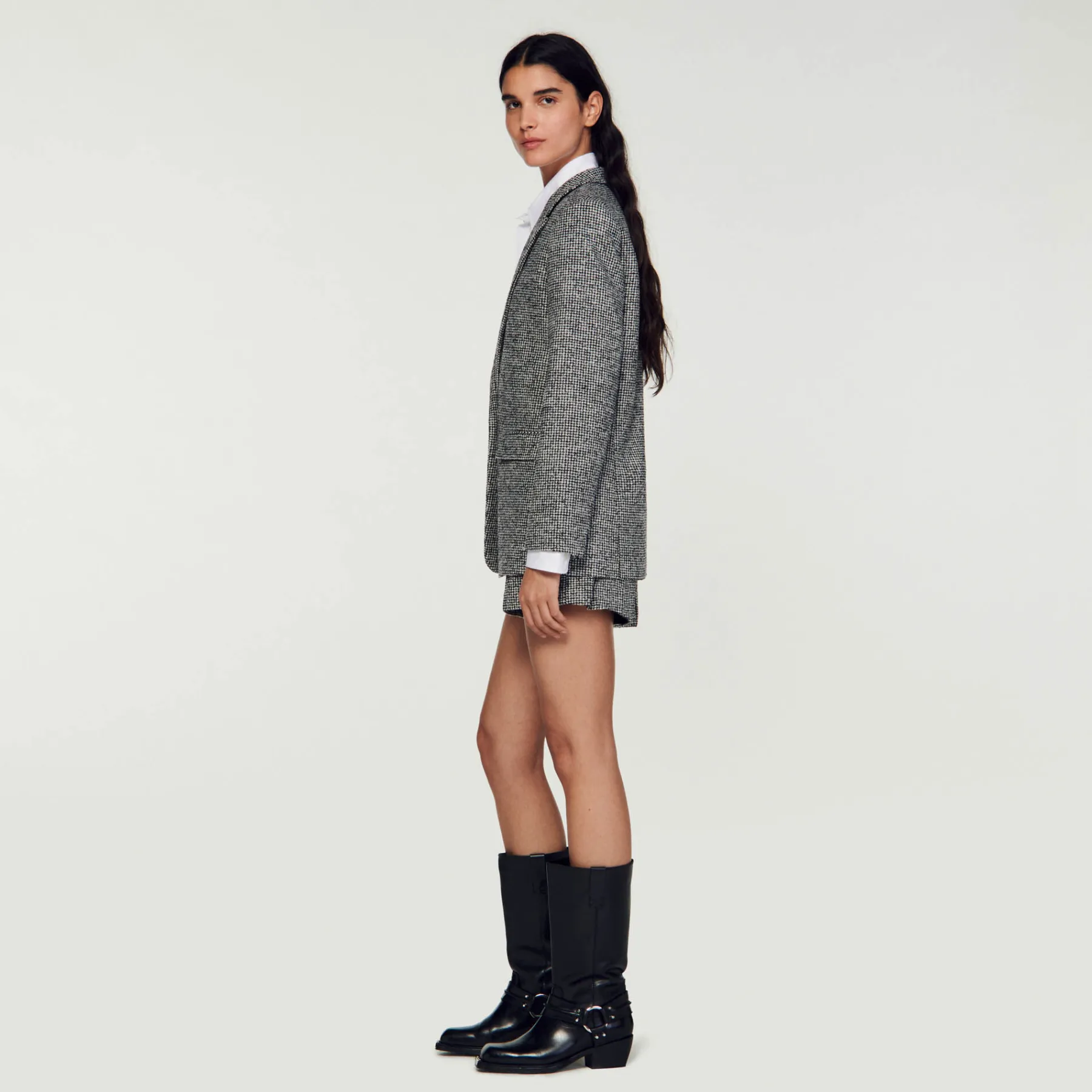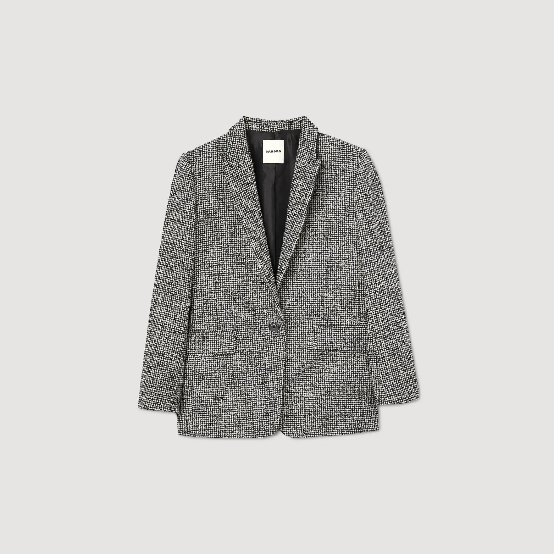 Houndstooth wool-blend blazer with stand-up turn-up collar, long sleeves and welt pockets at the waist.
