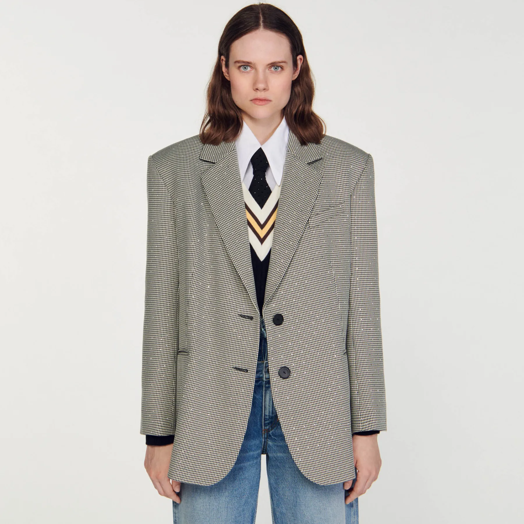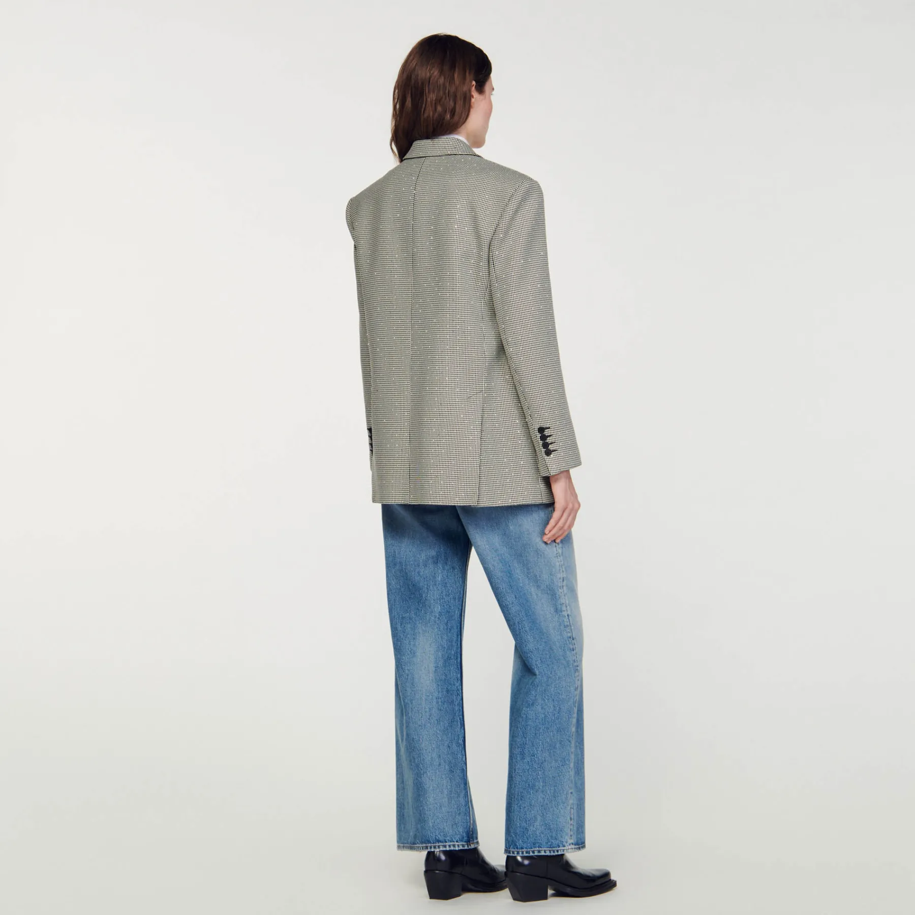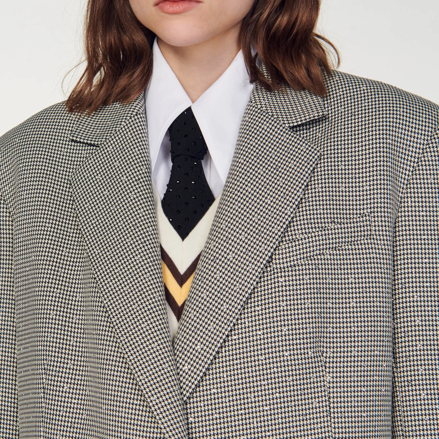 Oversize blazer with houndstooth pattern, embellished with crystals, long sleeves, welt pockets and a double slit at the back.