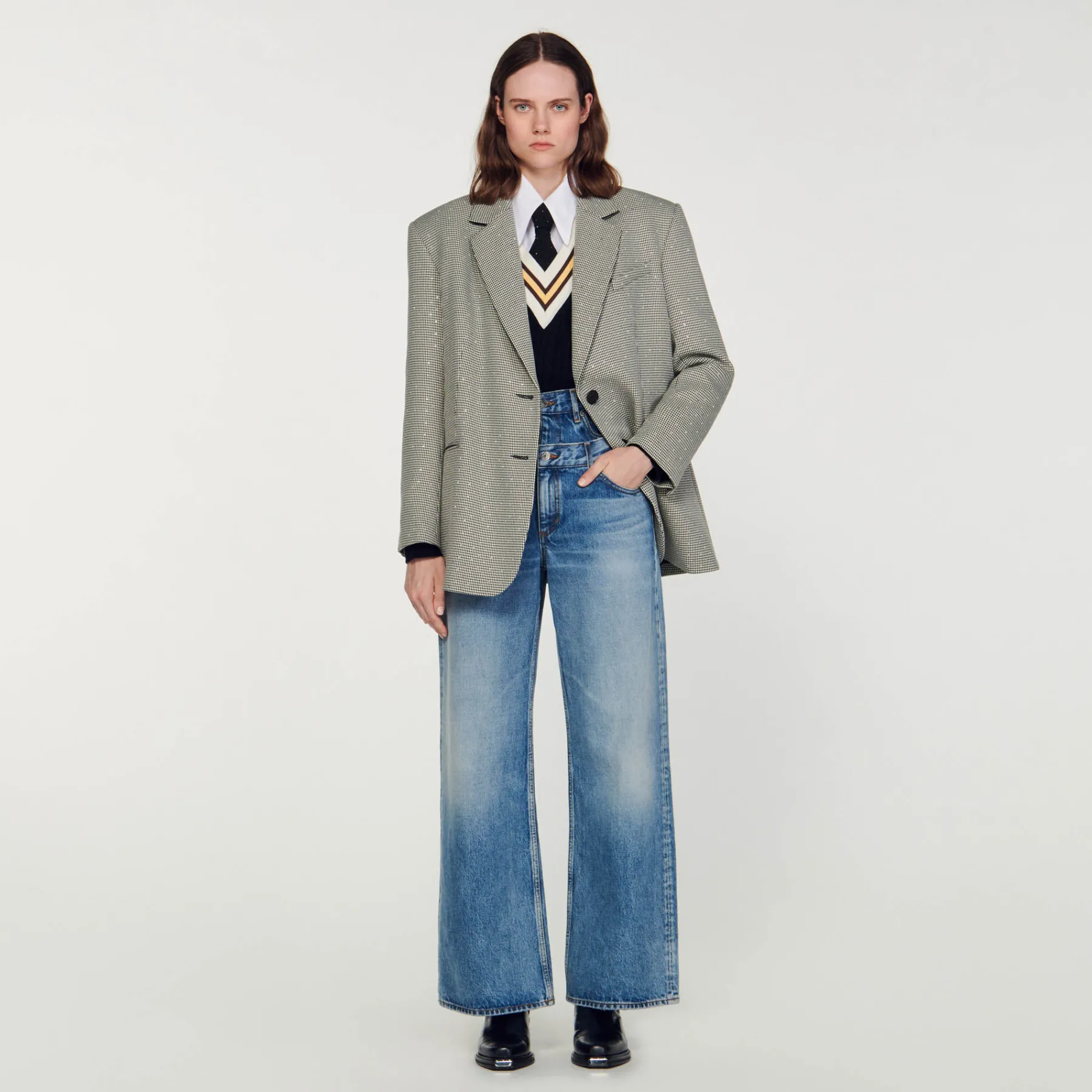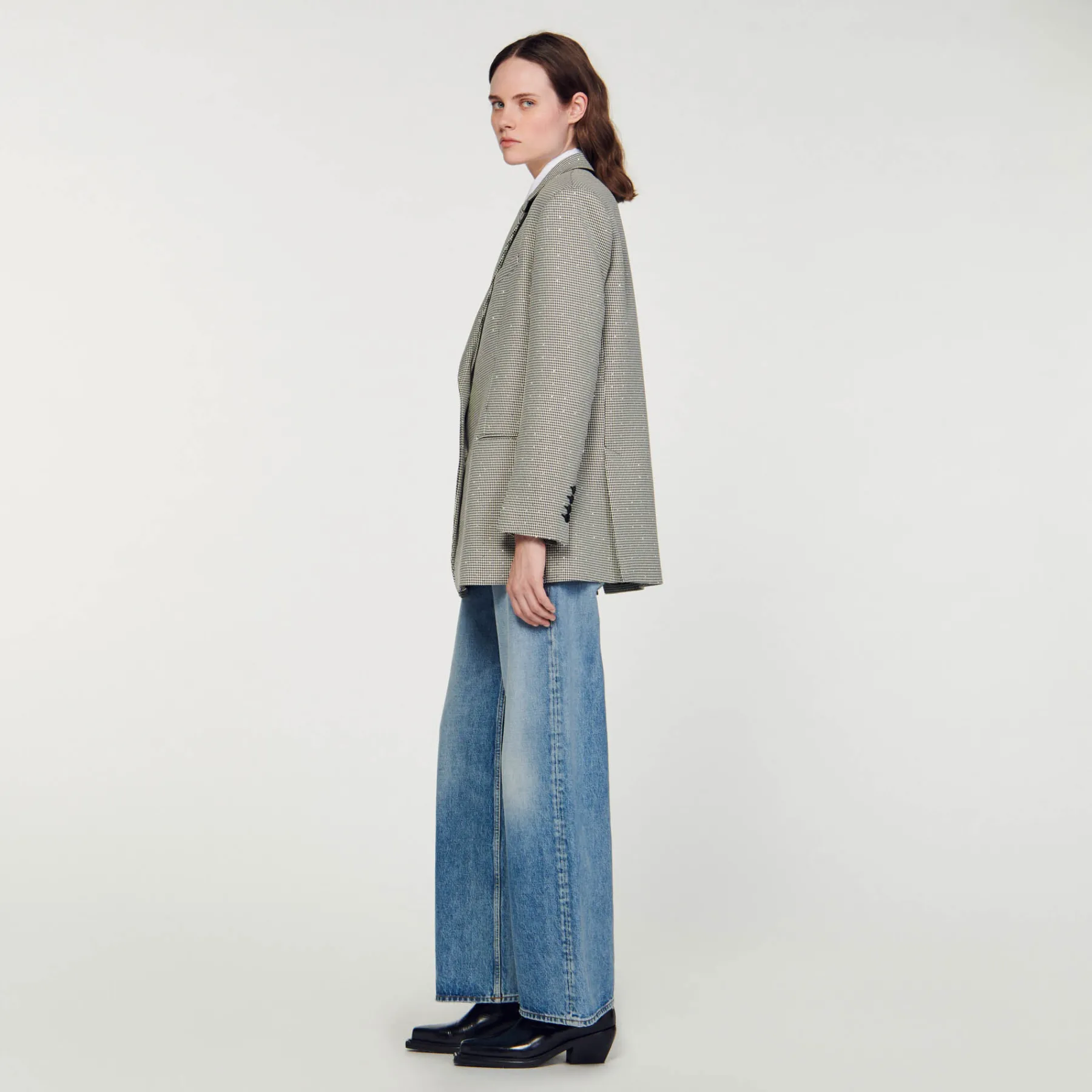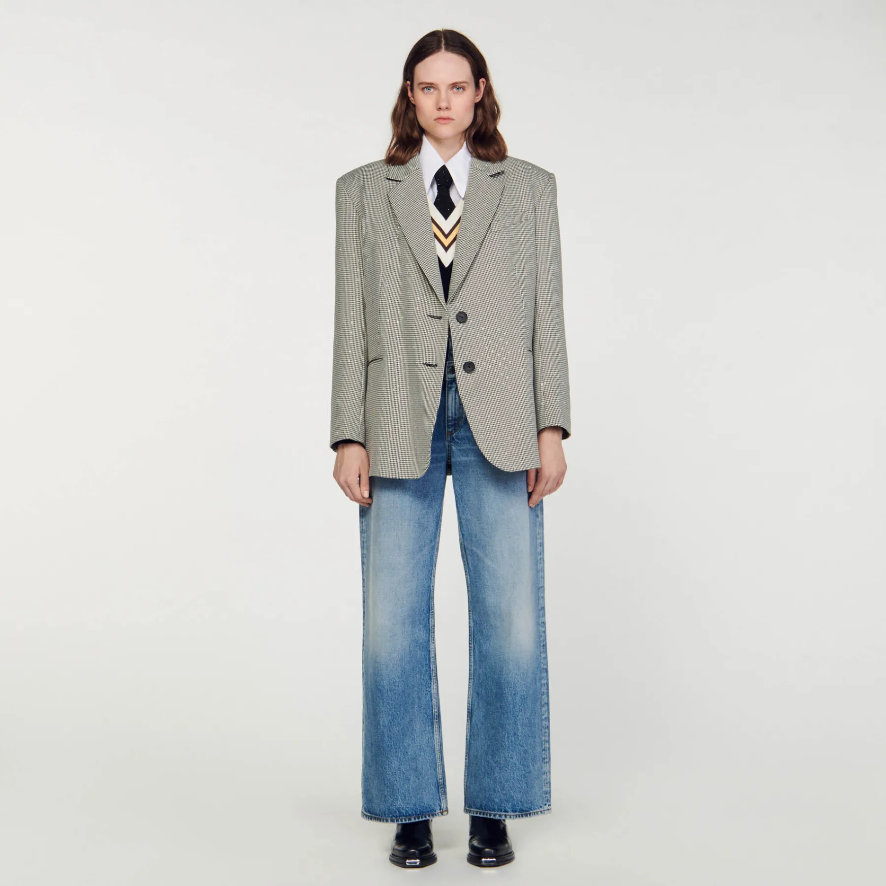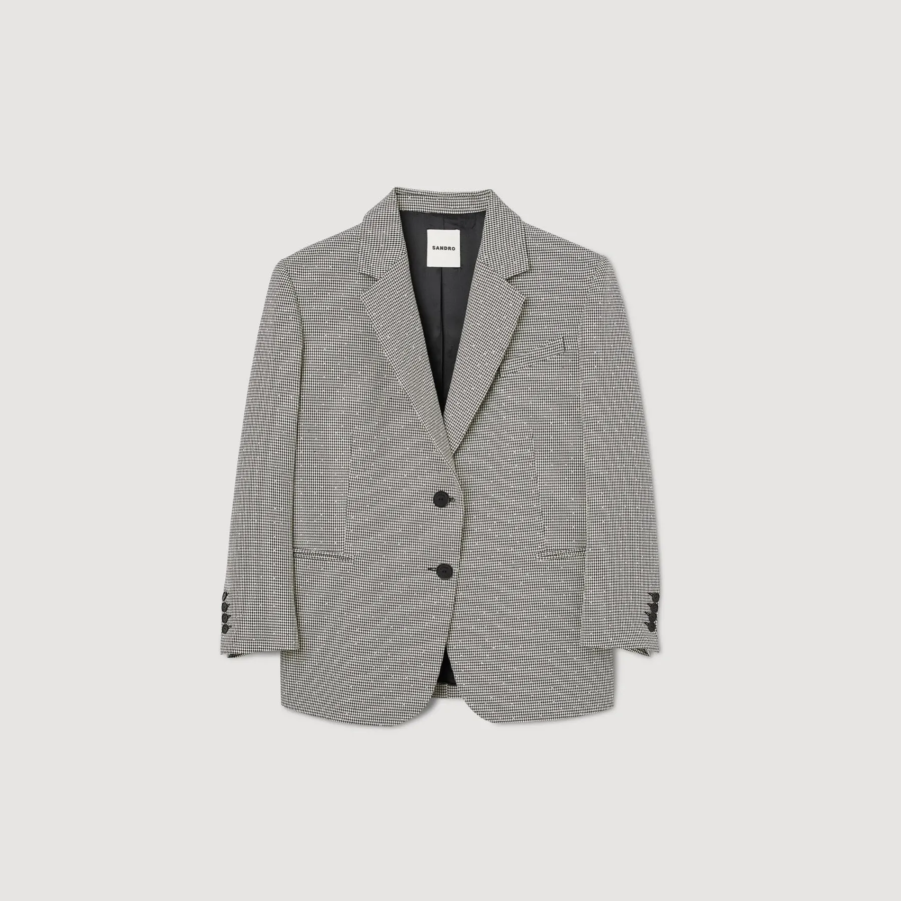 Oversize blazer with houndstooth pattern, embellished with crystals, long sleeves, welt pockets and a double slit at the back.