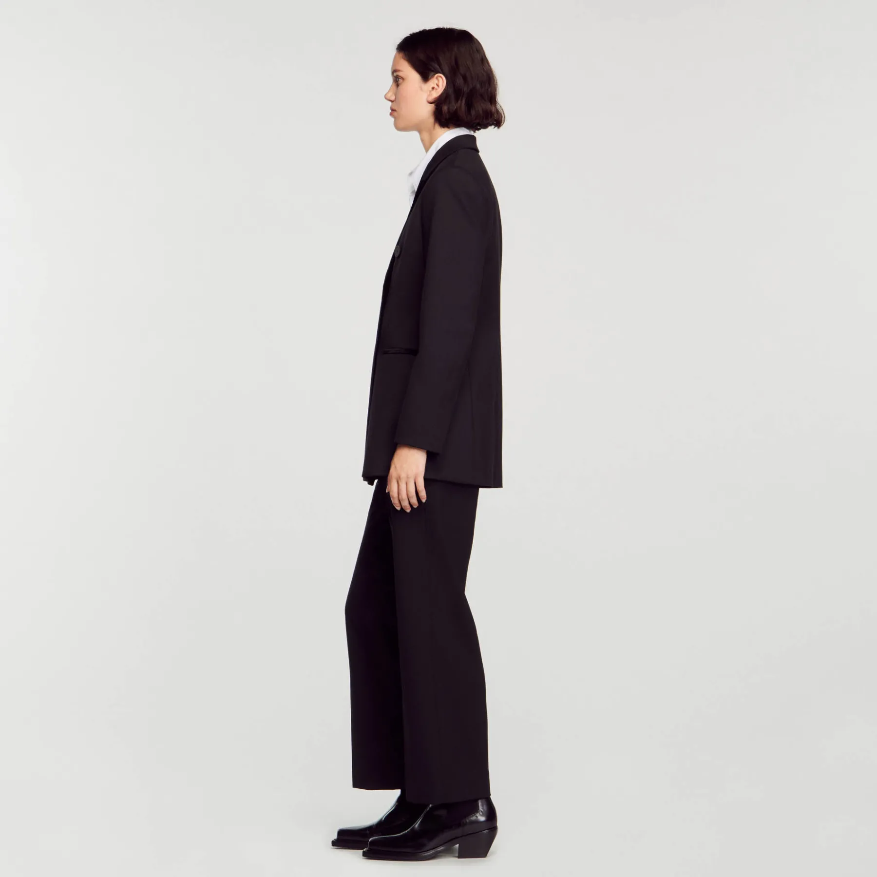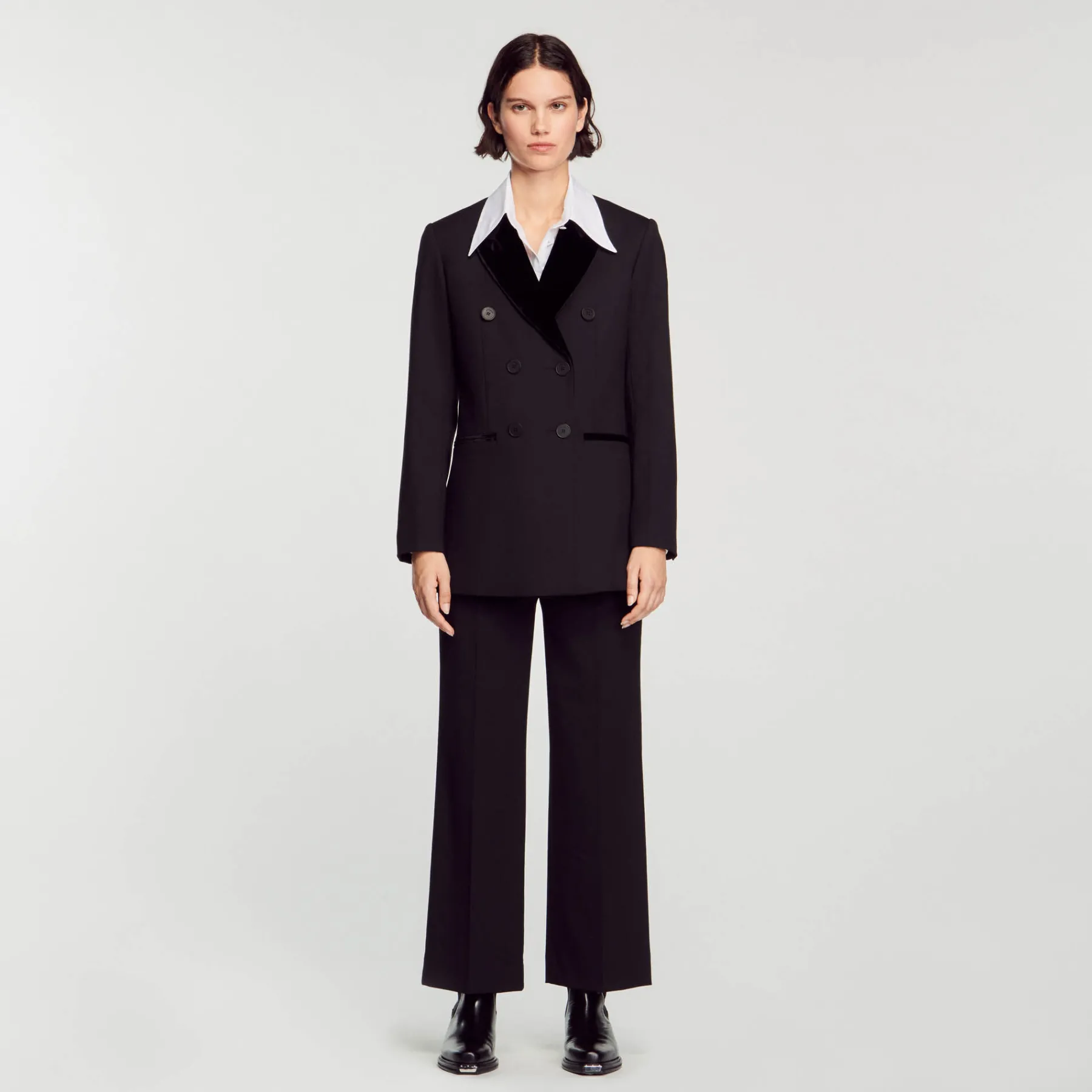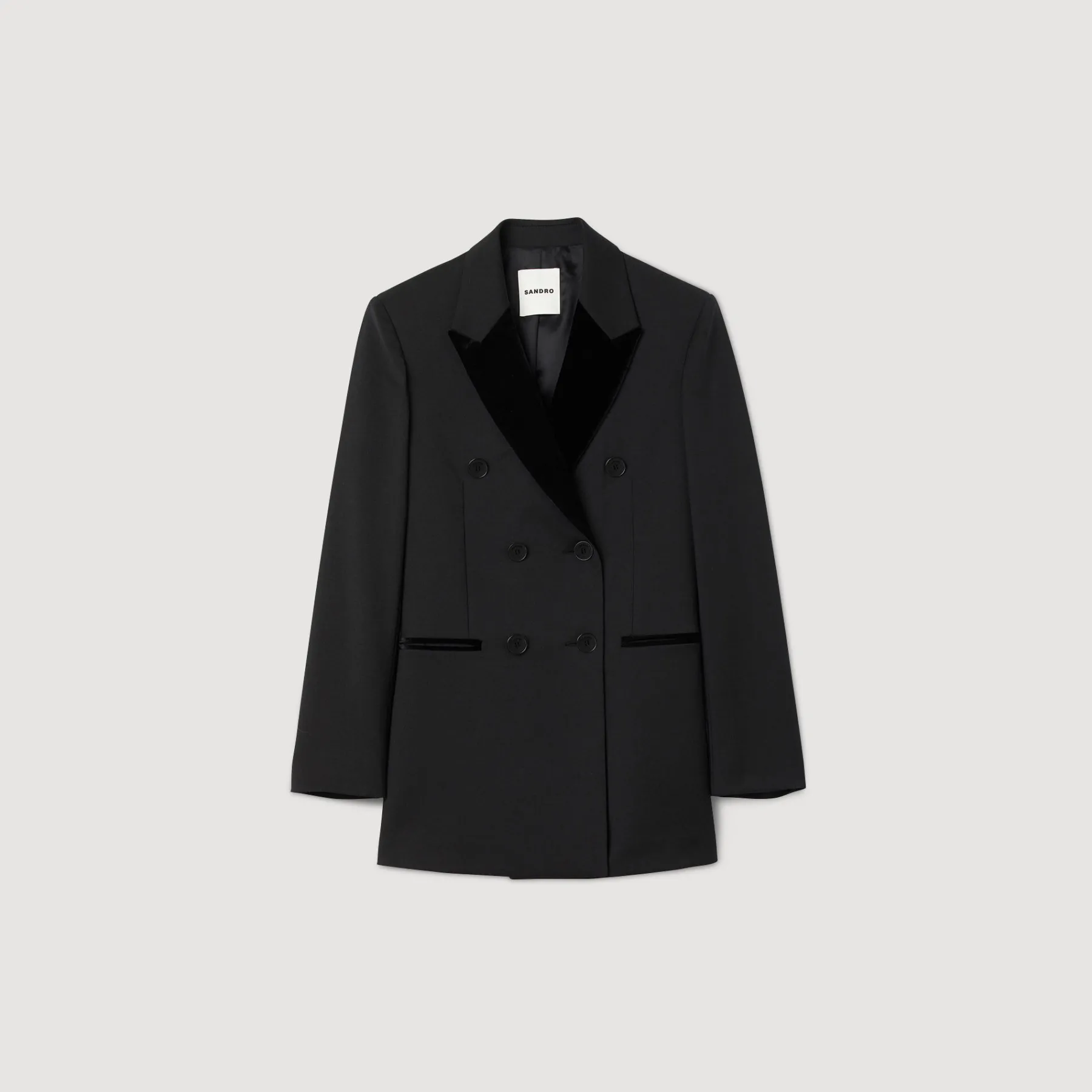 Tailored jacket with a double-breasted button fastening, a wide velvet collar, long sleeves, and piped pockets.