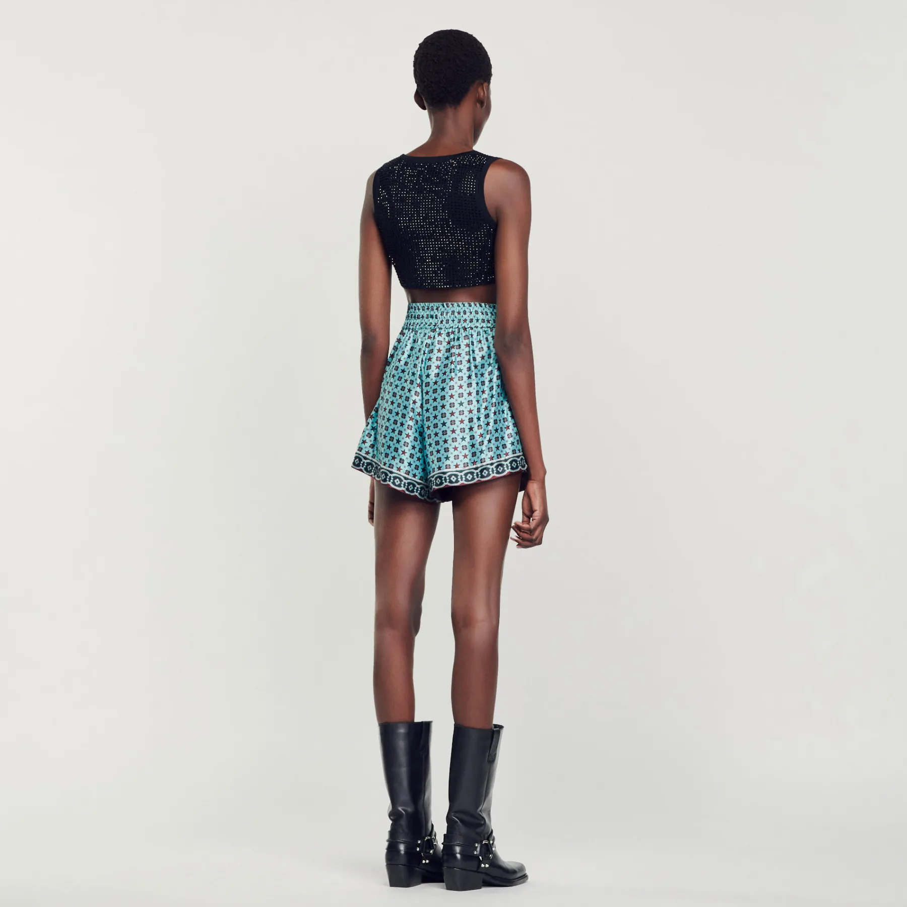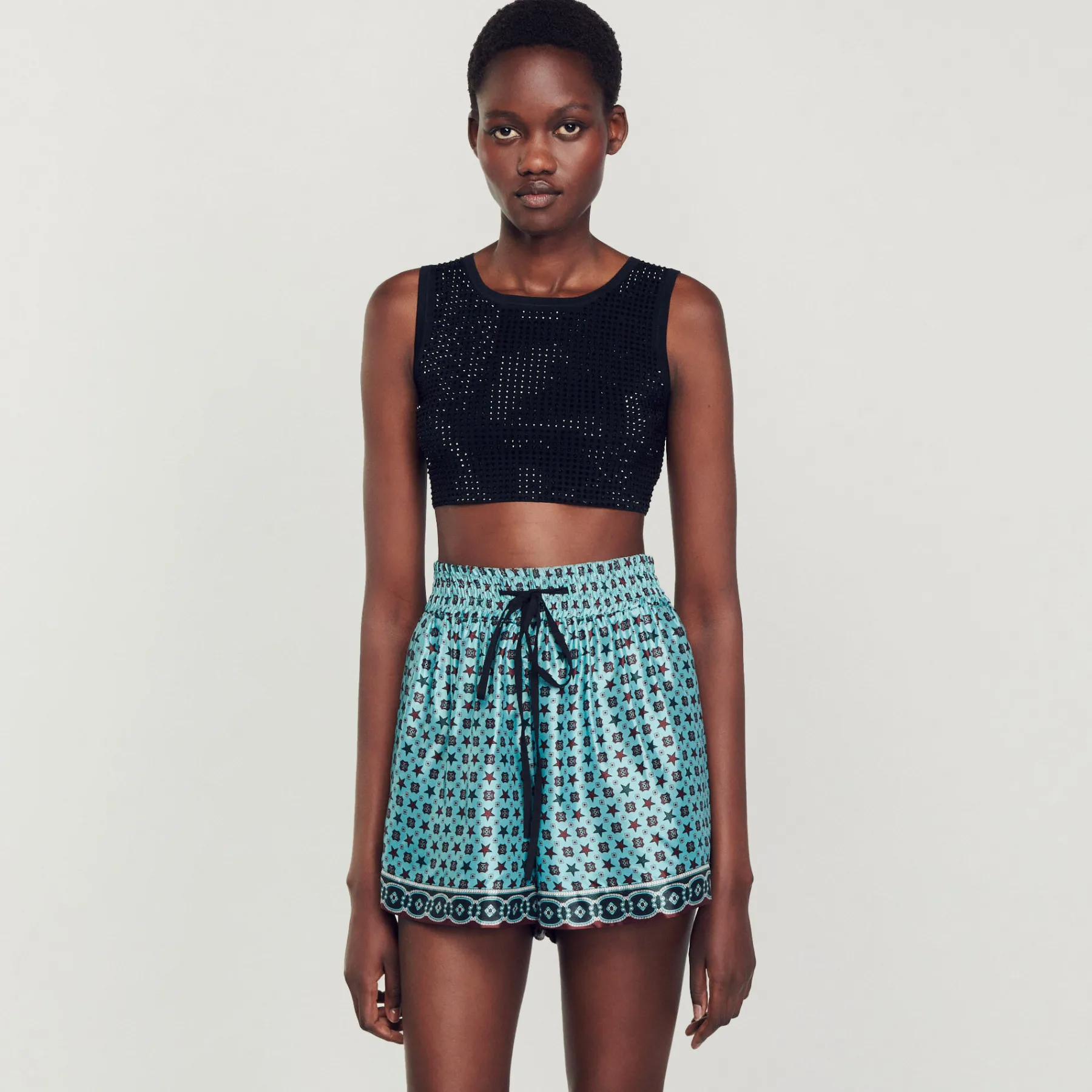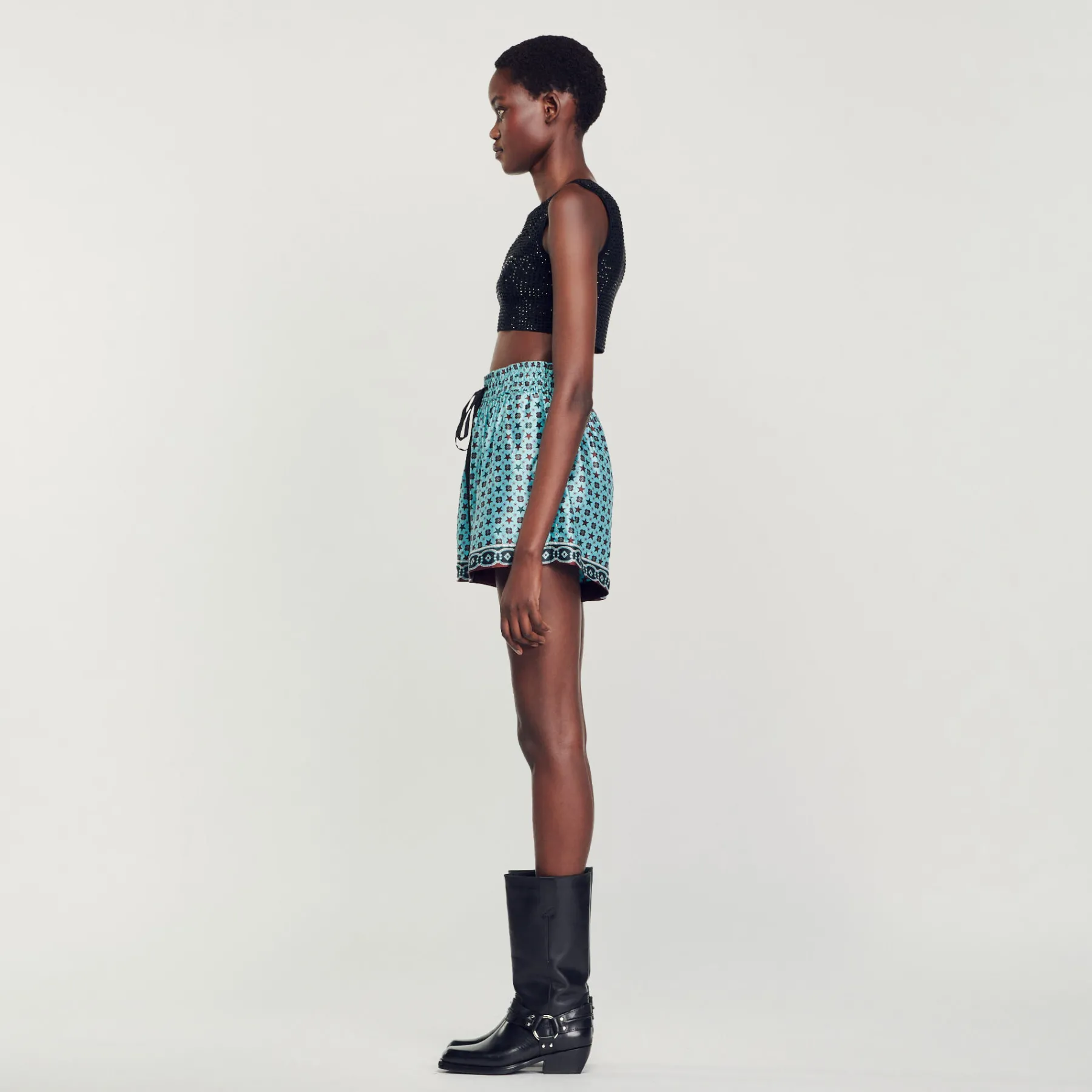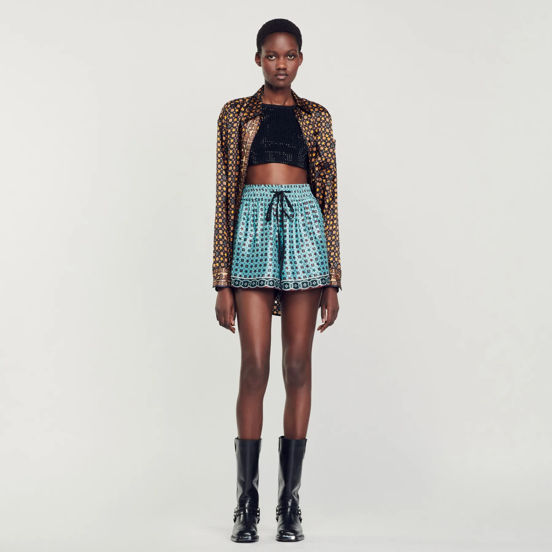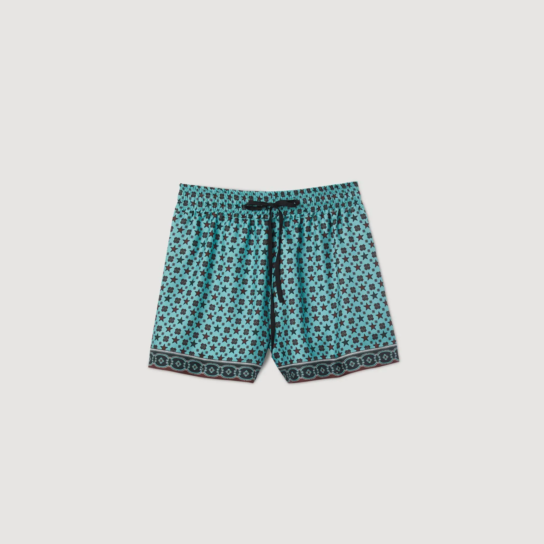 Floaty satin shorts with a tie print, contrasting drawstrings at the waist, and side pockets.