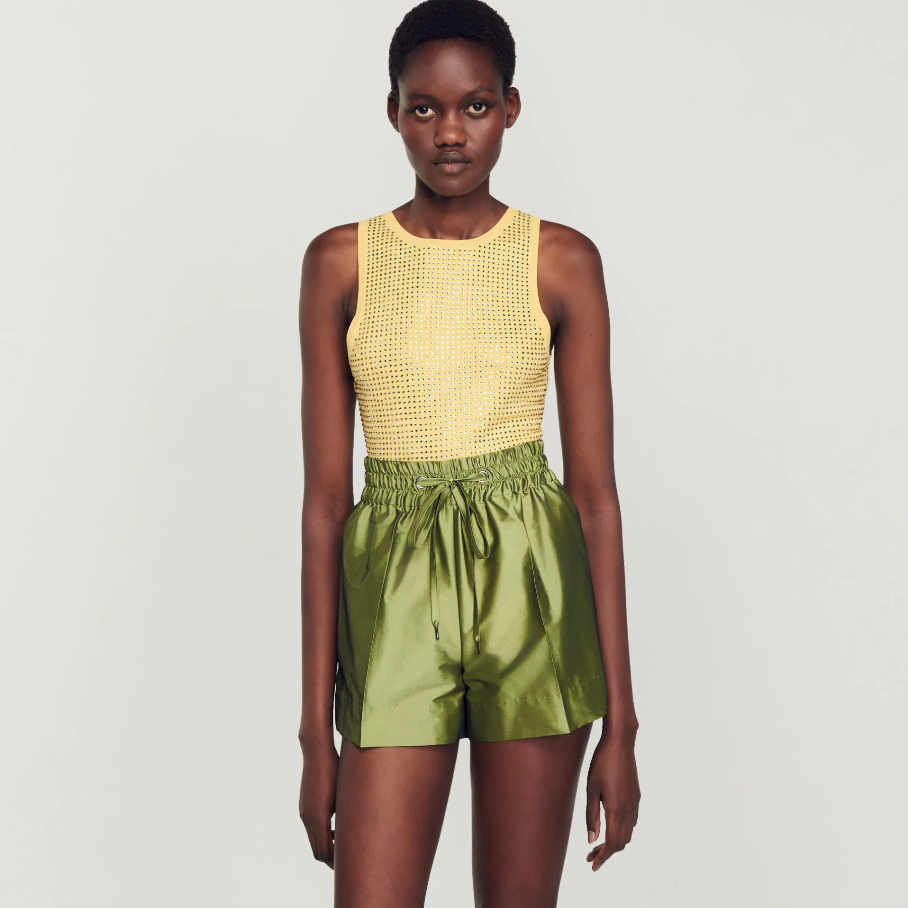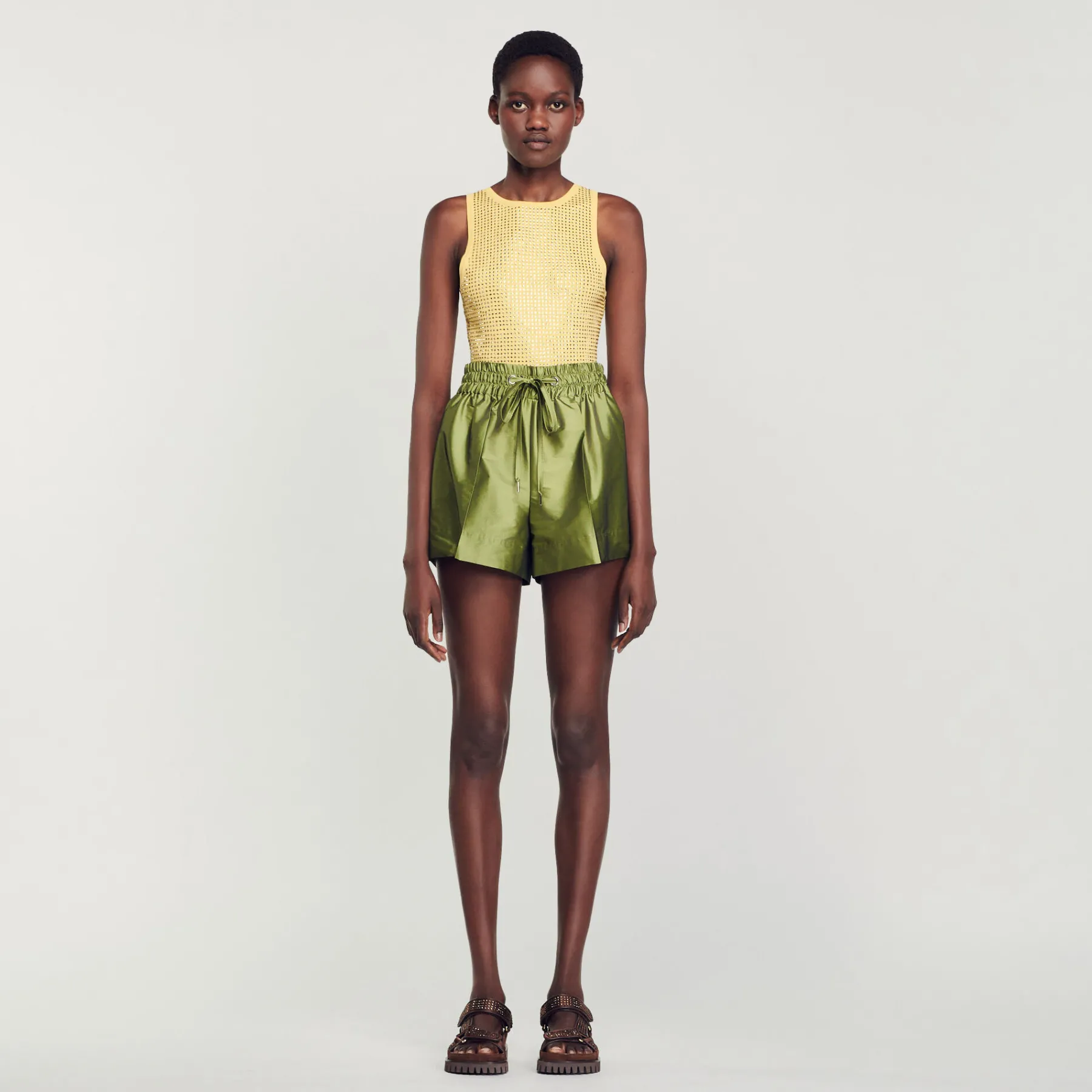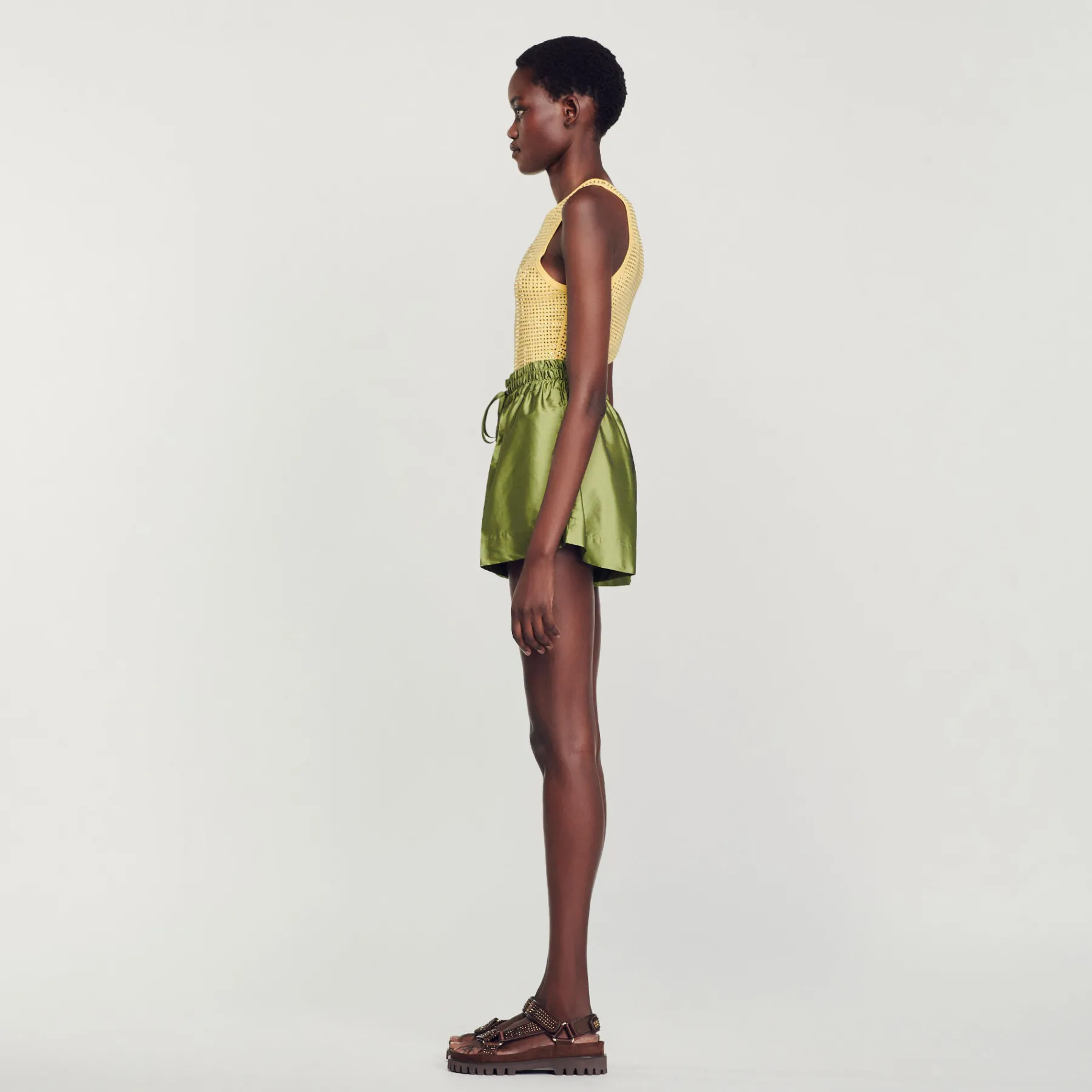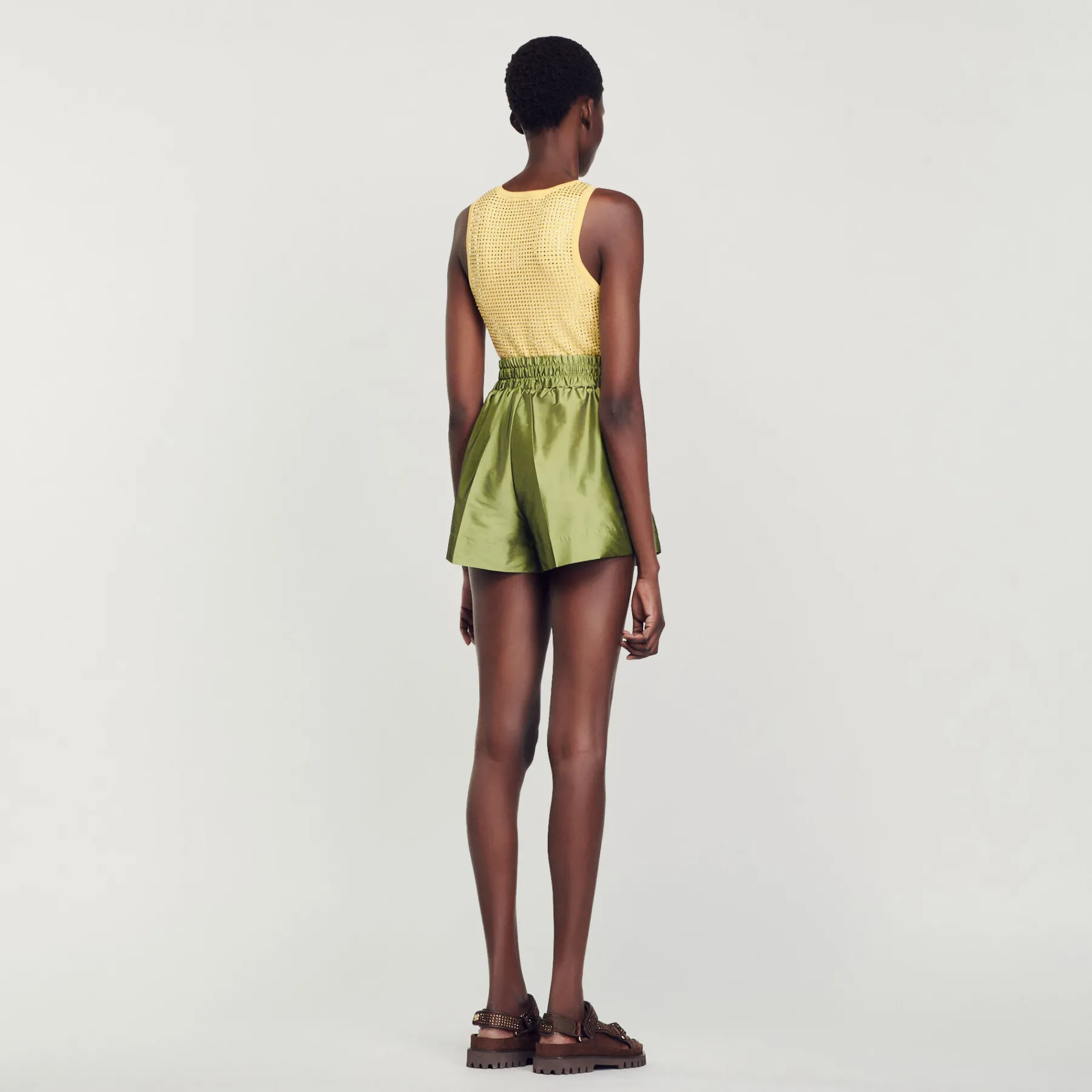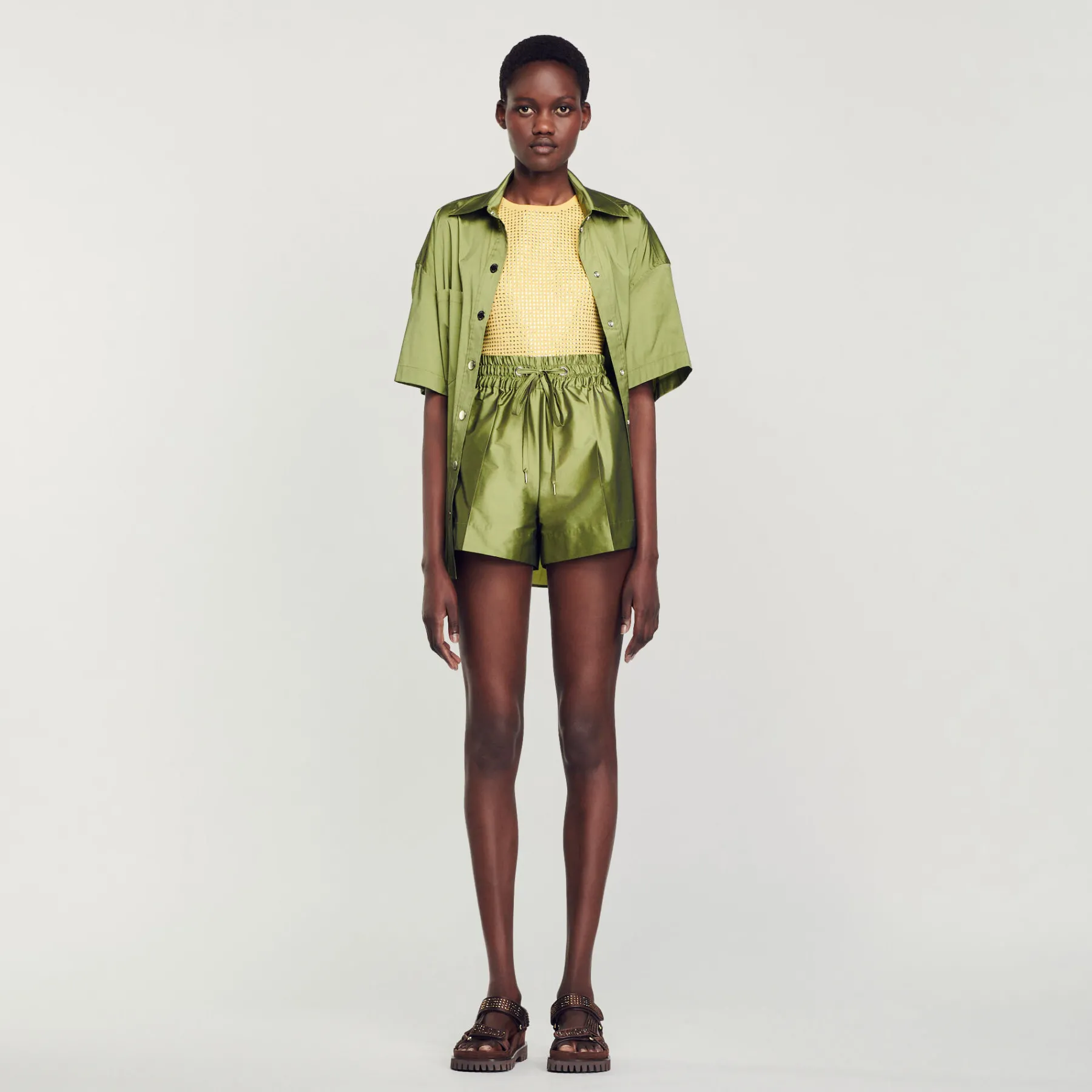 DescriptionSandro Women’s satin shortsFlared cutWaist tiesPressed pleats These shorts have a matching shirt Learn about …