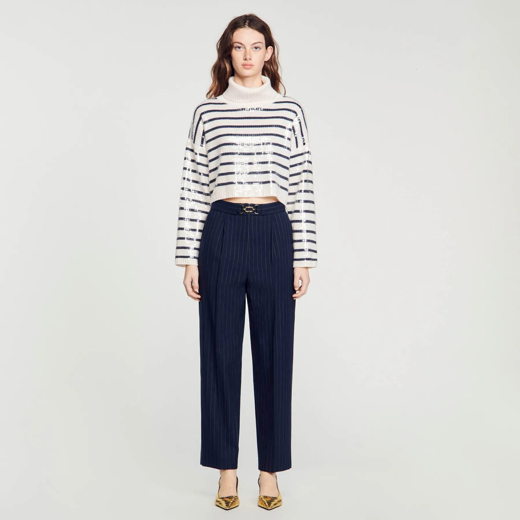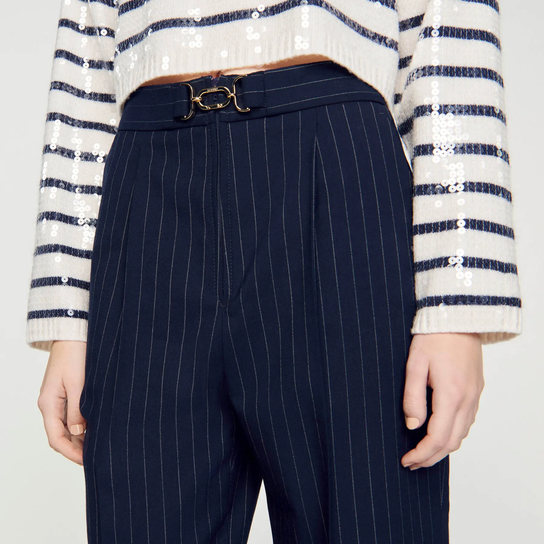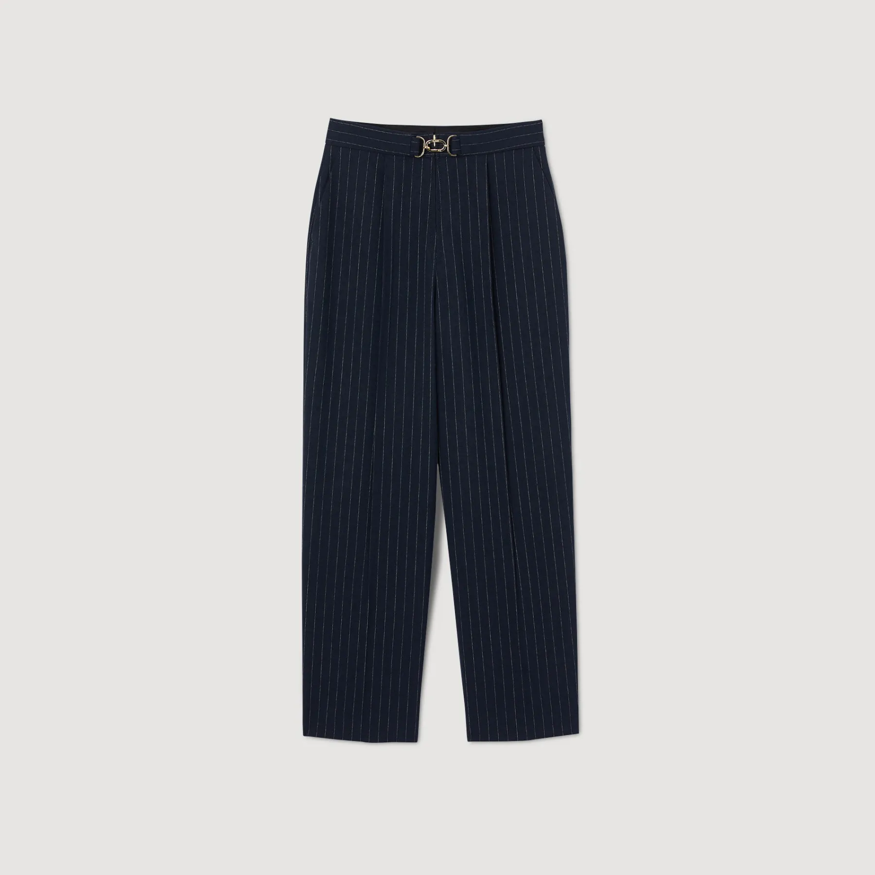 Creased pants with thin stripes and a belt featuring a metallic buckle with the Sandro logo.