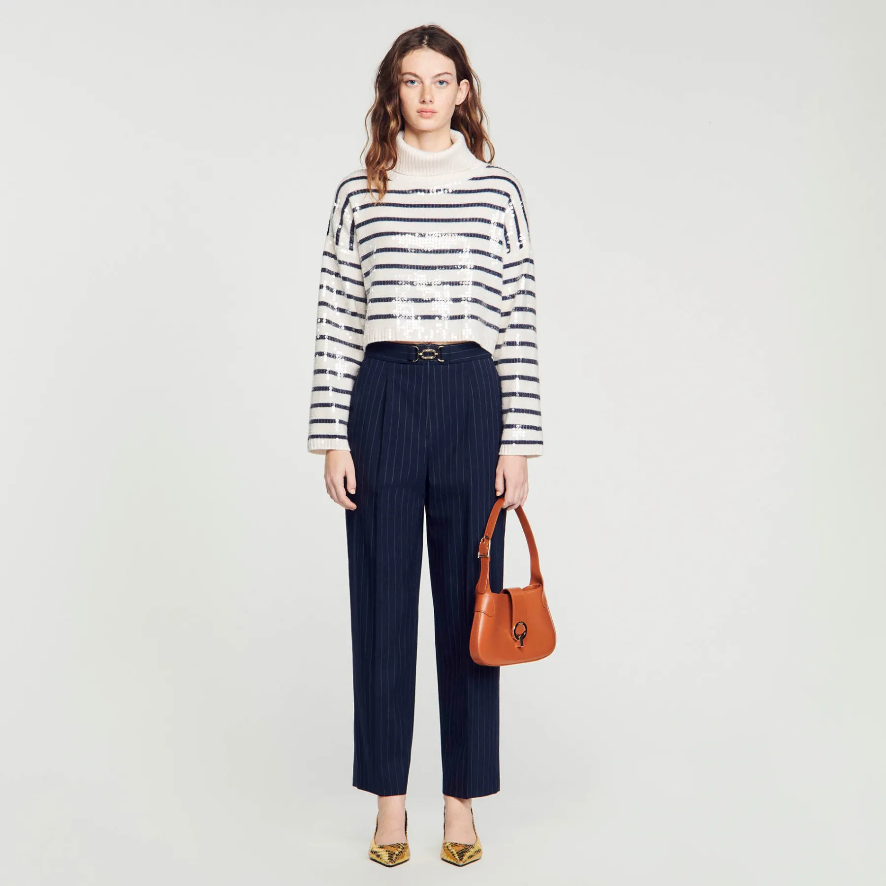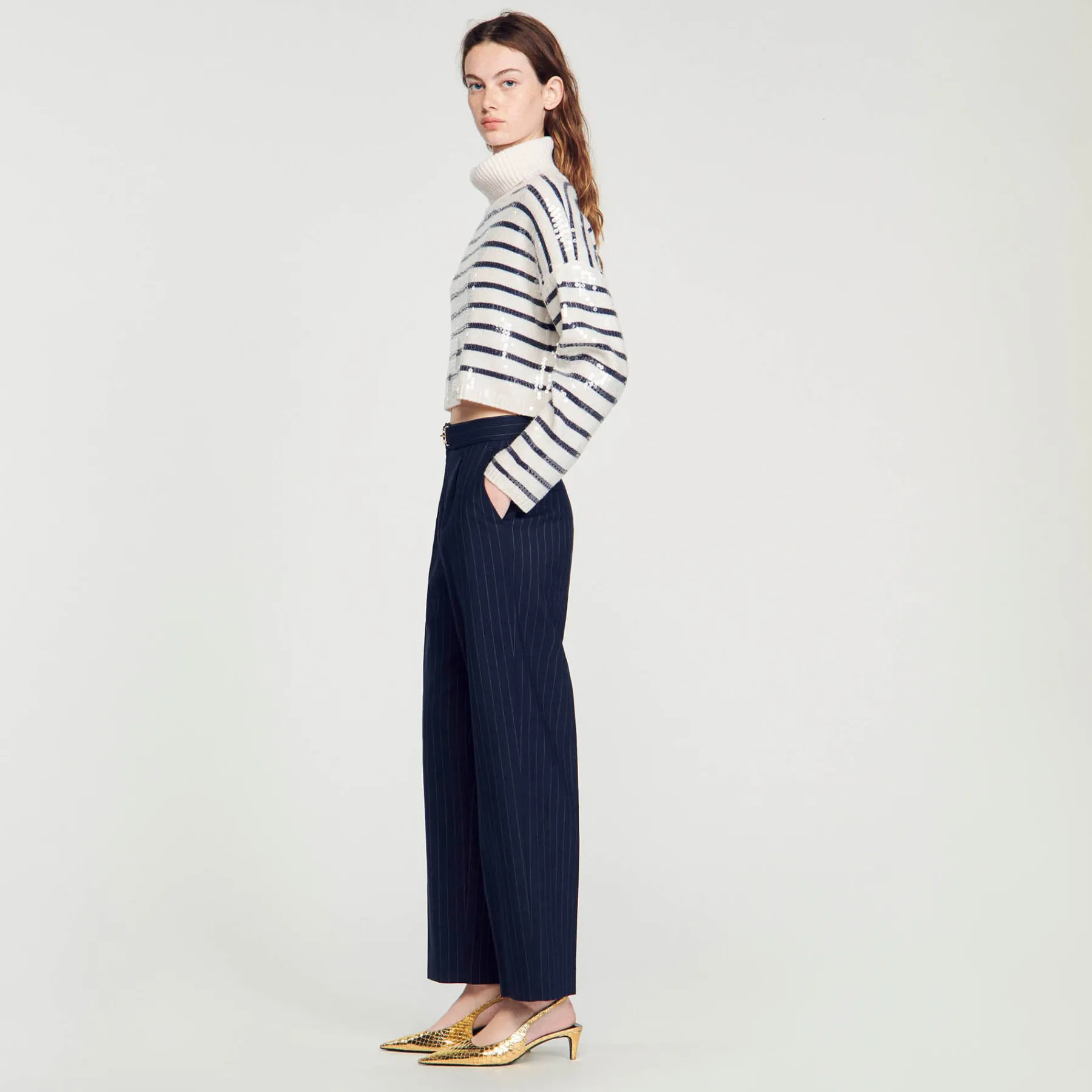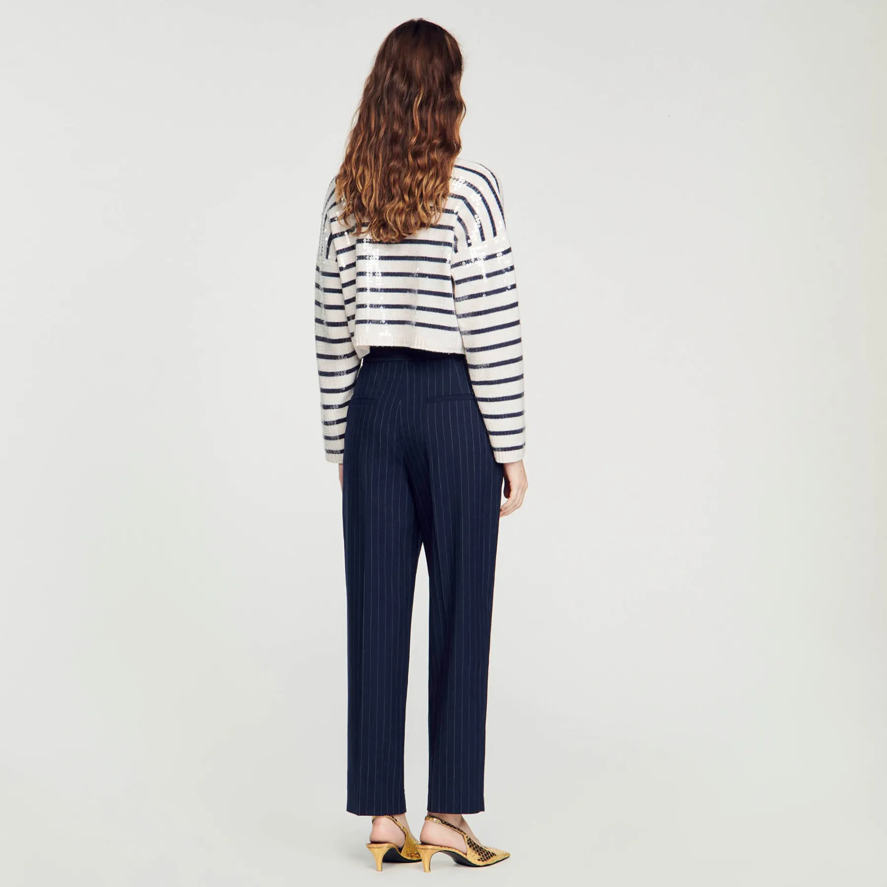 Creased pants with thin stripes and a belt featuring a metallic buckle with the Sandro logo.