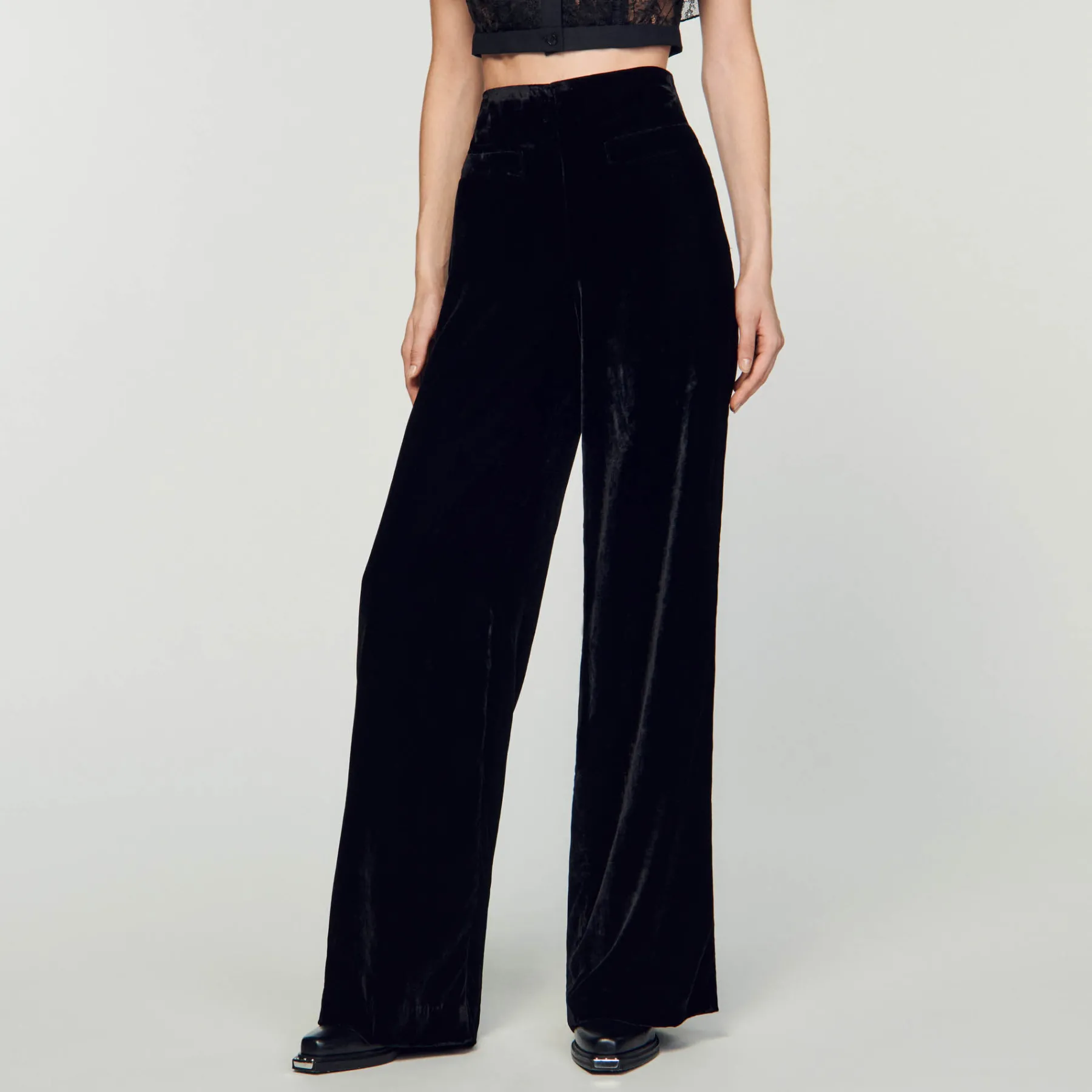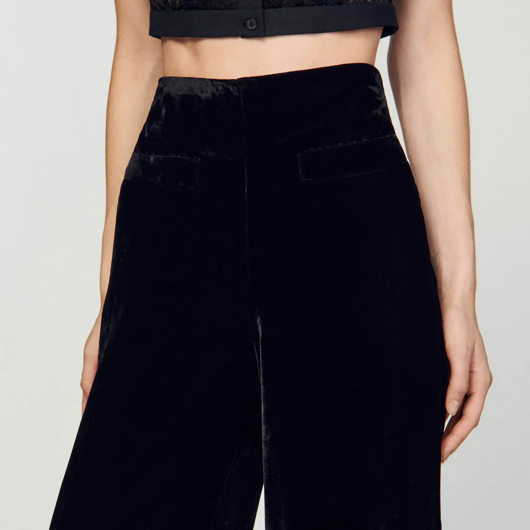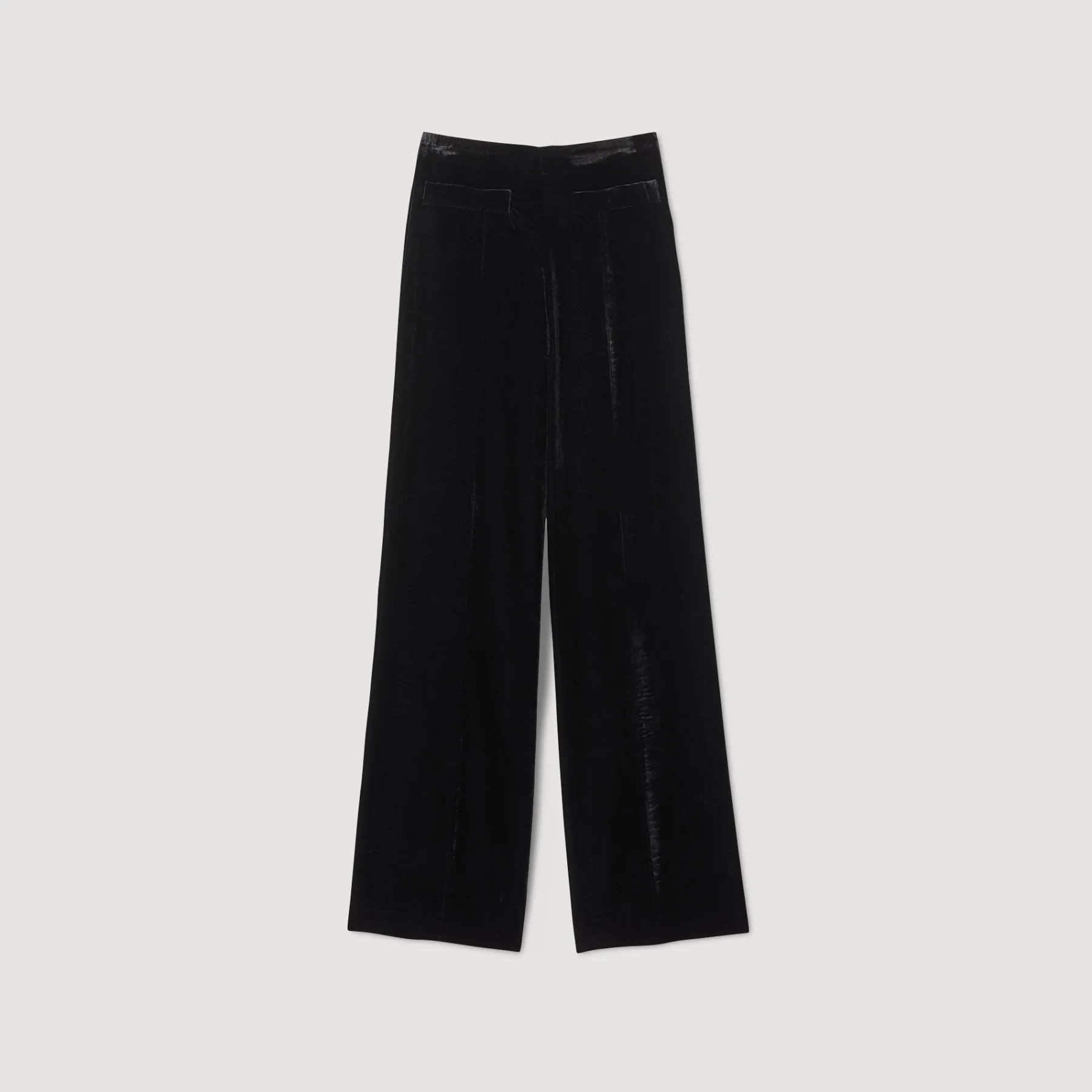 Wide-leg velvet pants with ironed creases on the front and darts at the back, and piping on the waist.