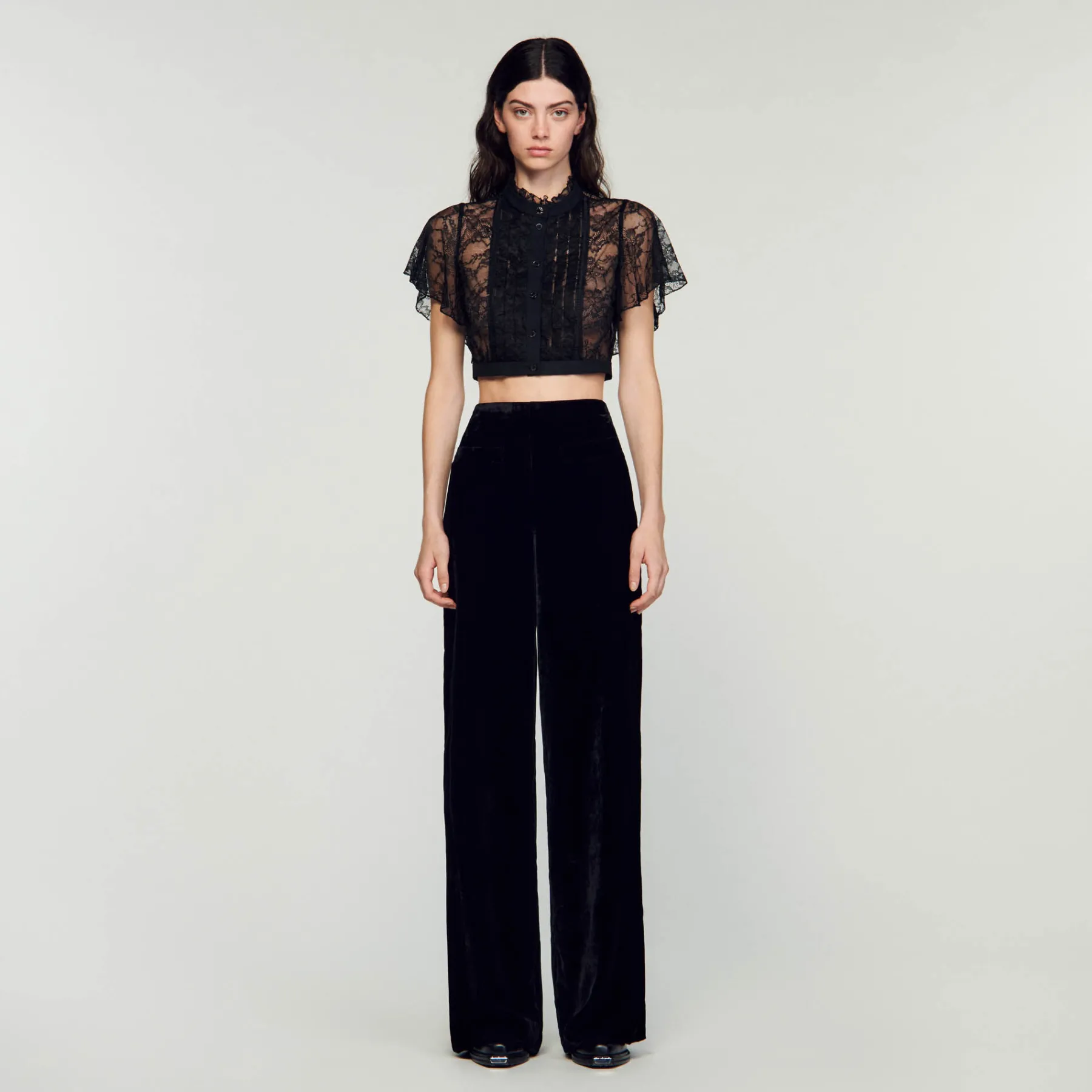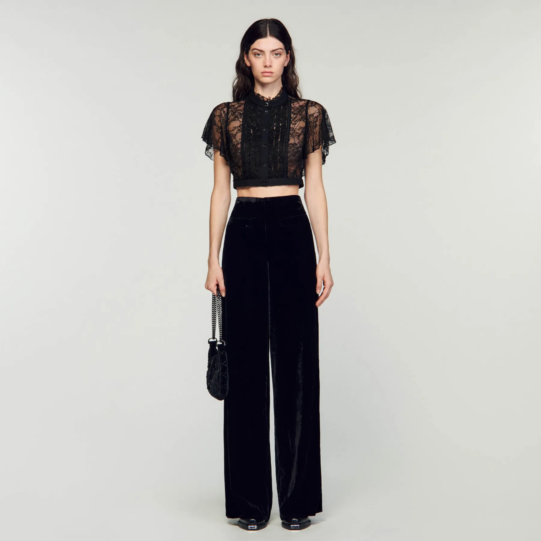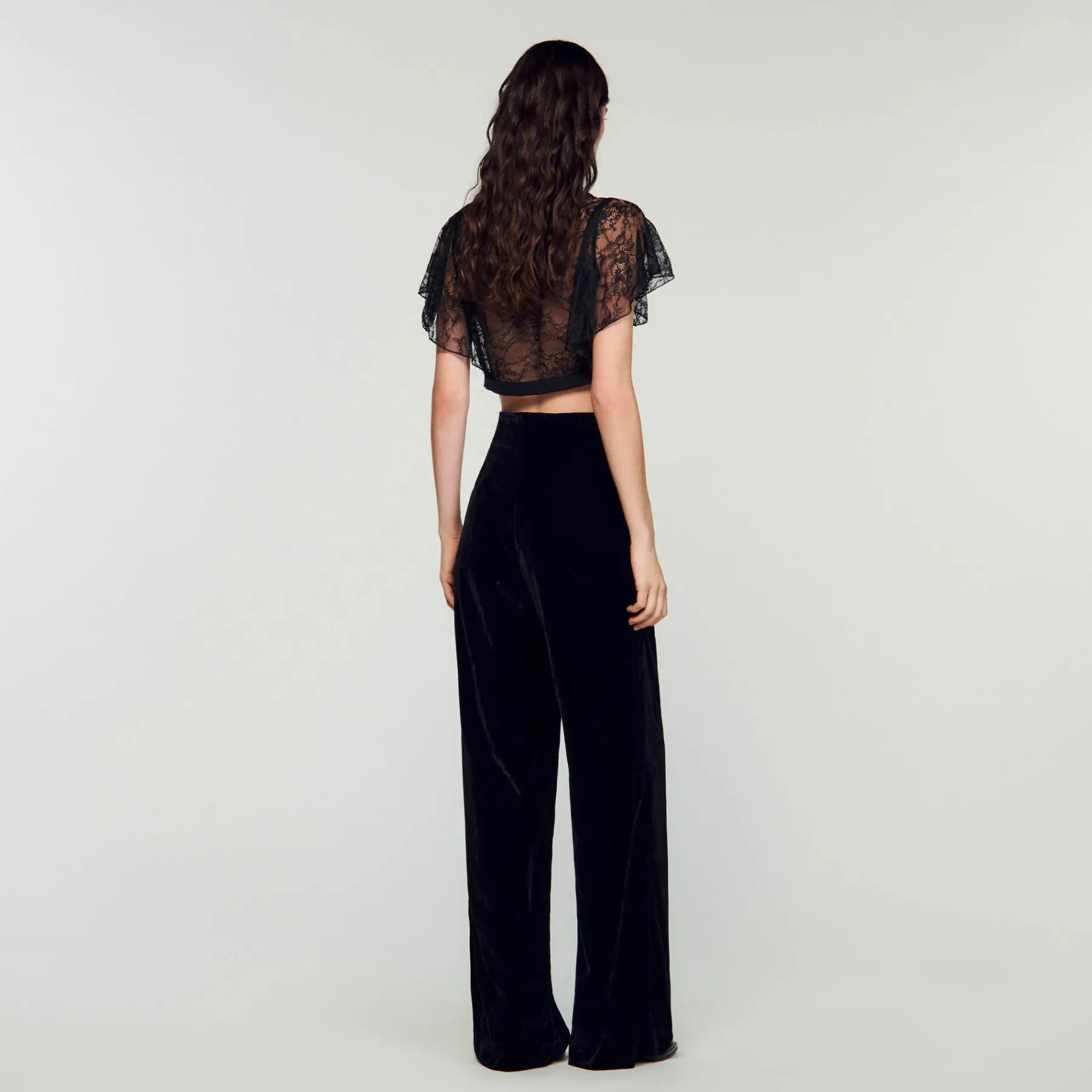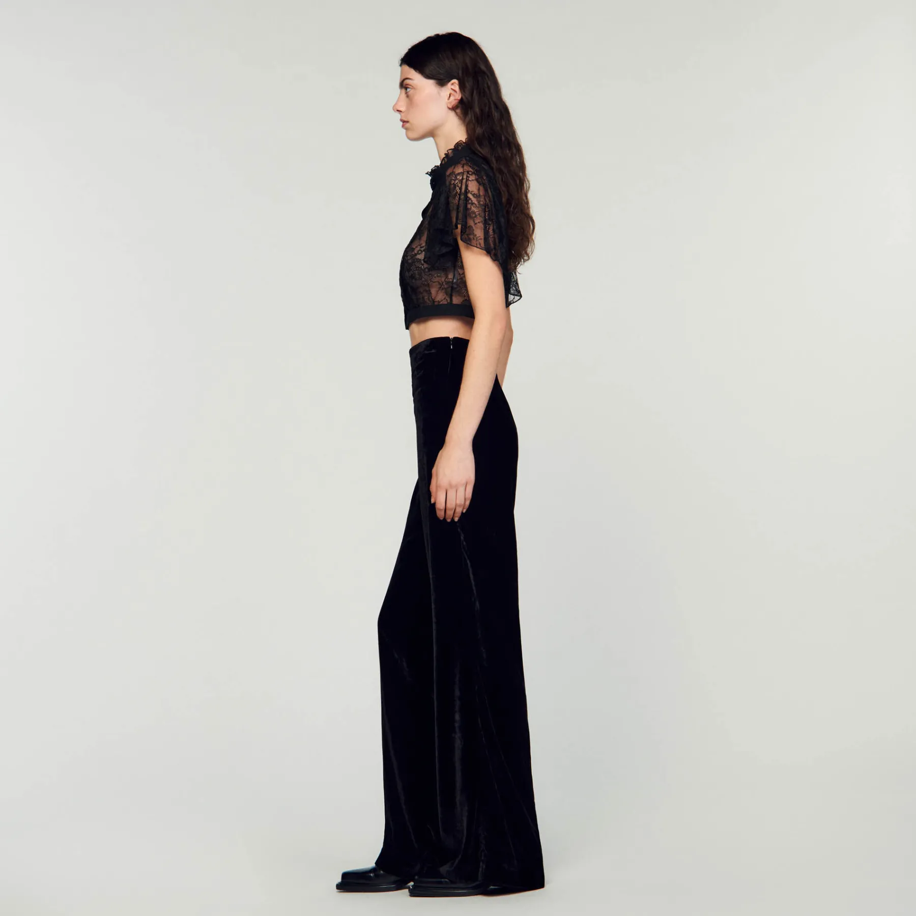Wide-leg velvet pants with ironed creases on the front and darts at the back, and piping on the waist.