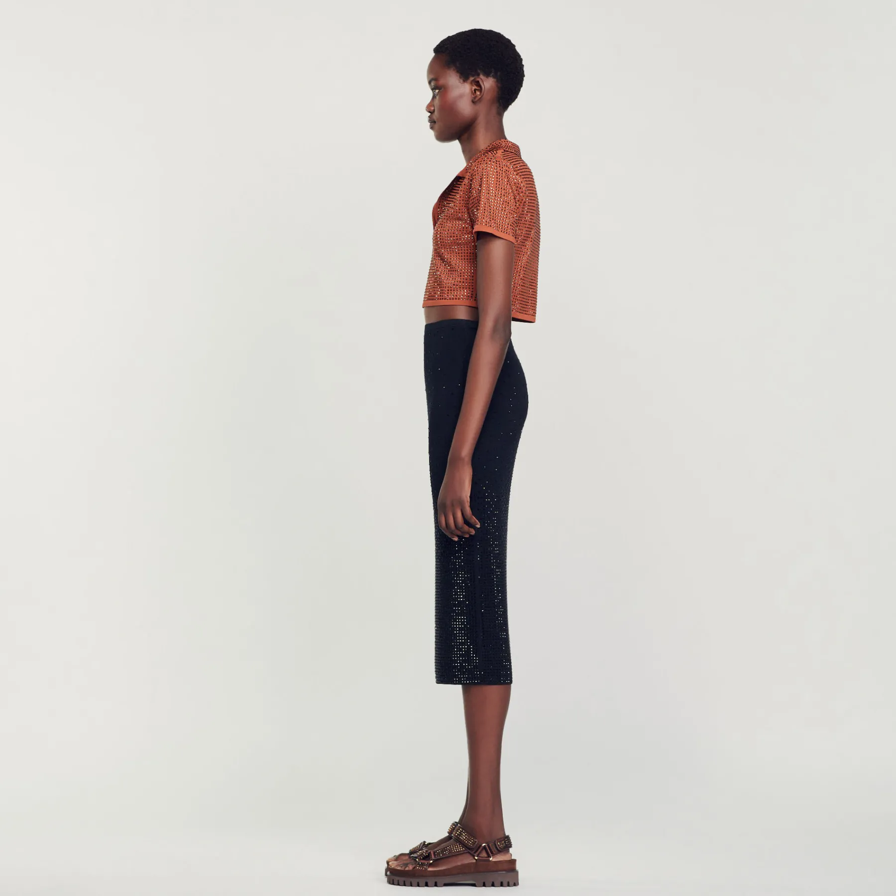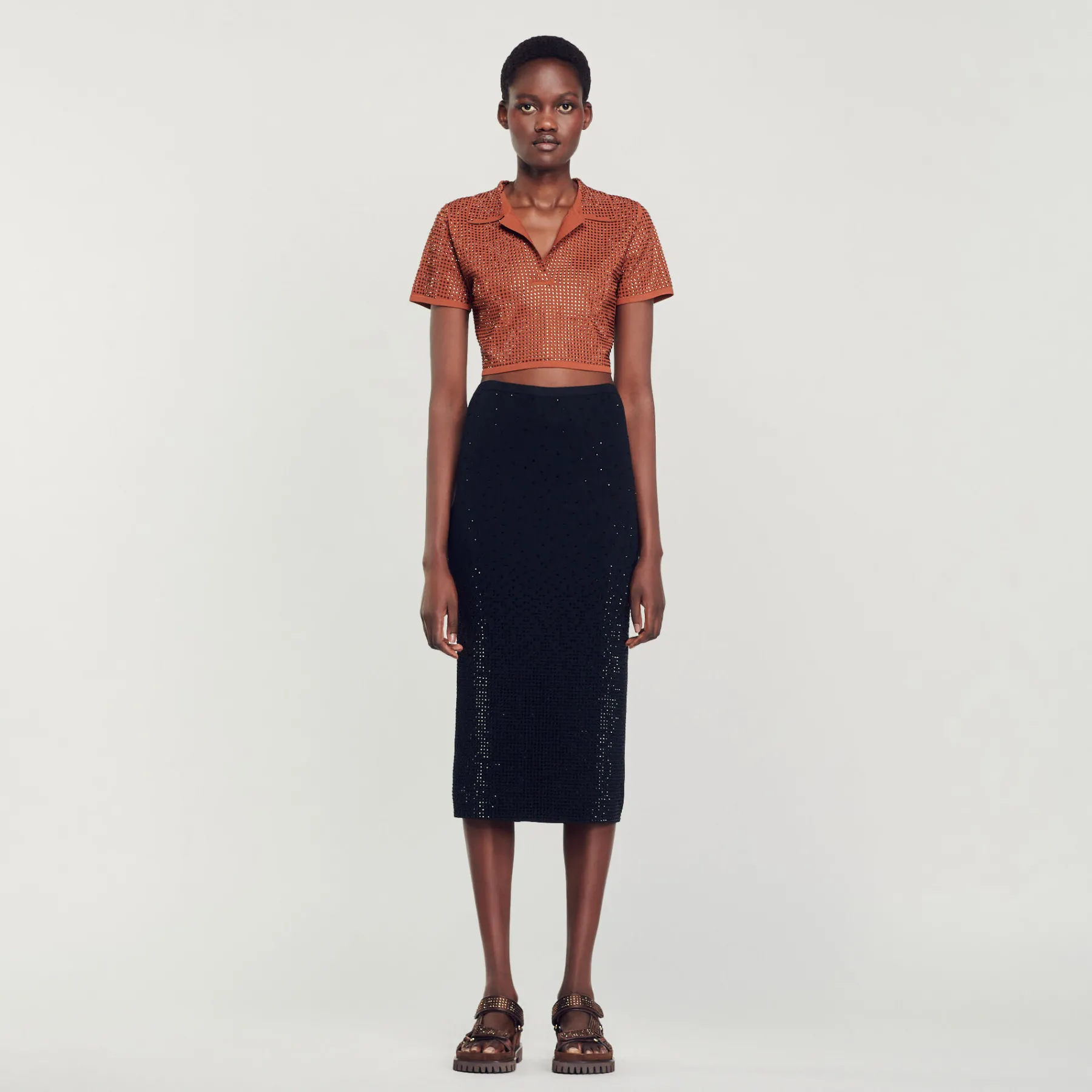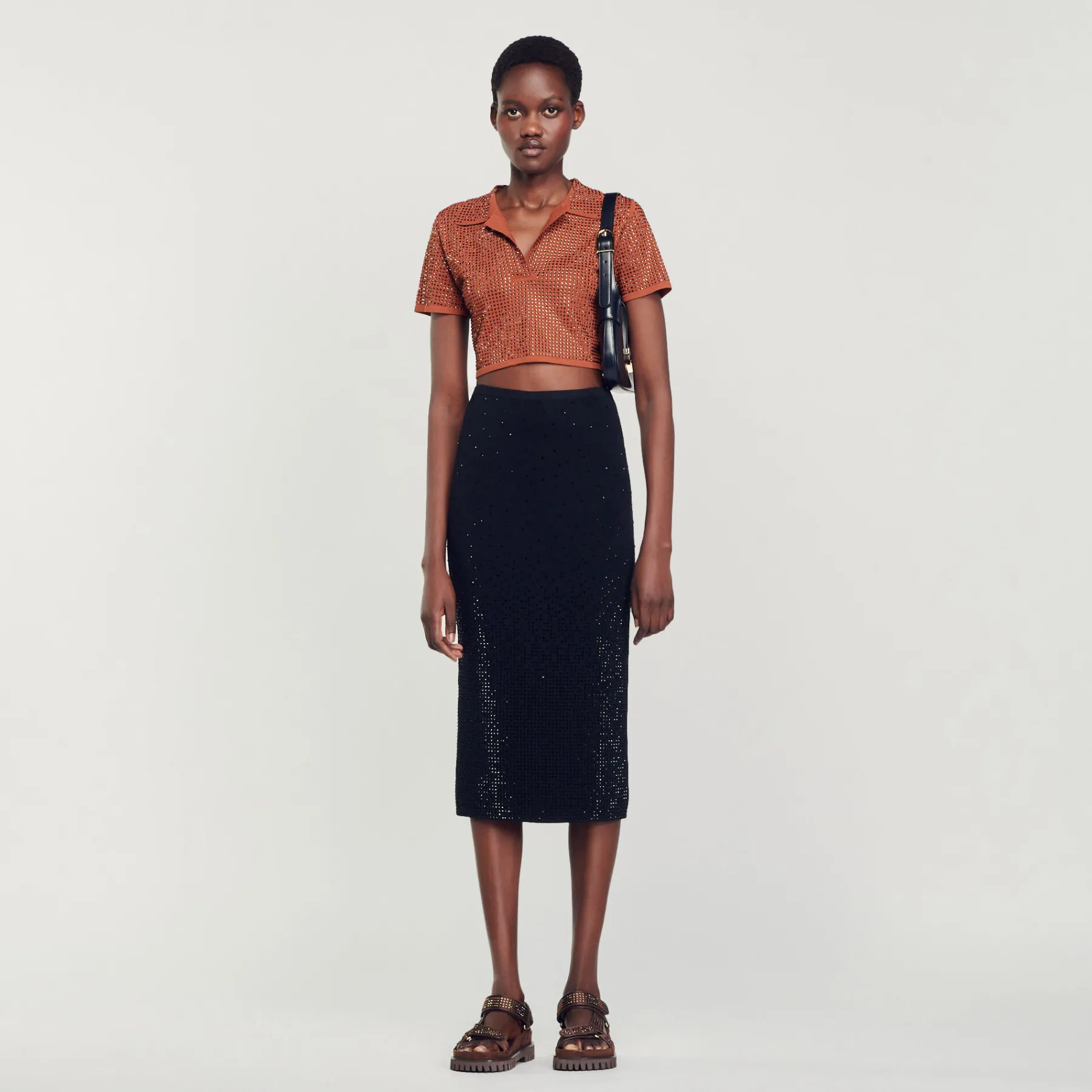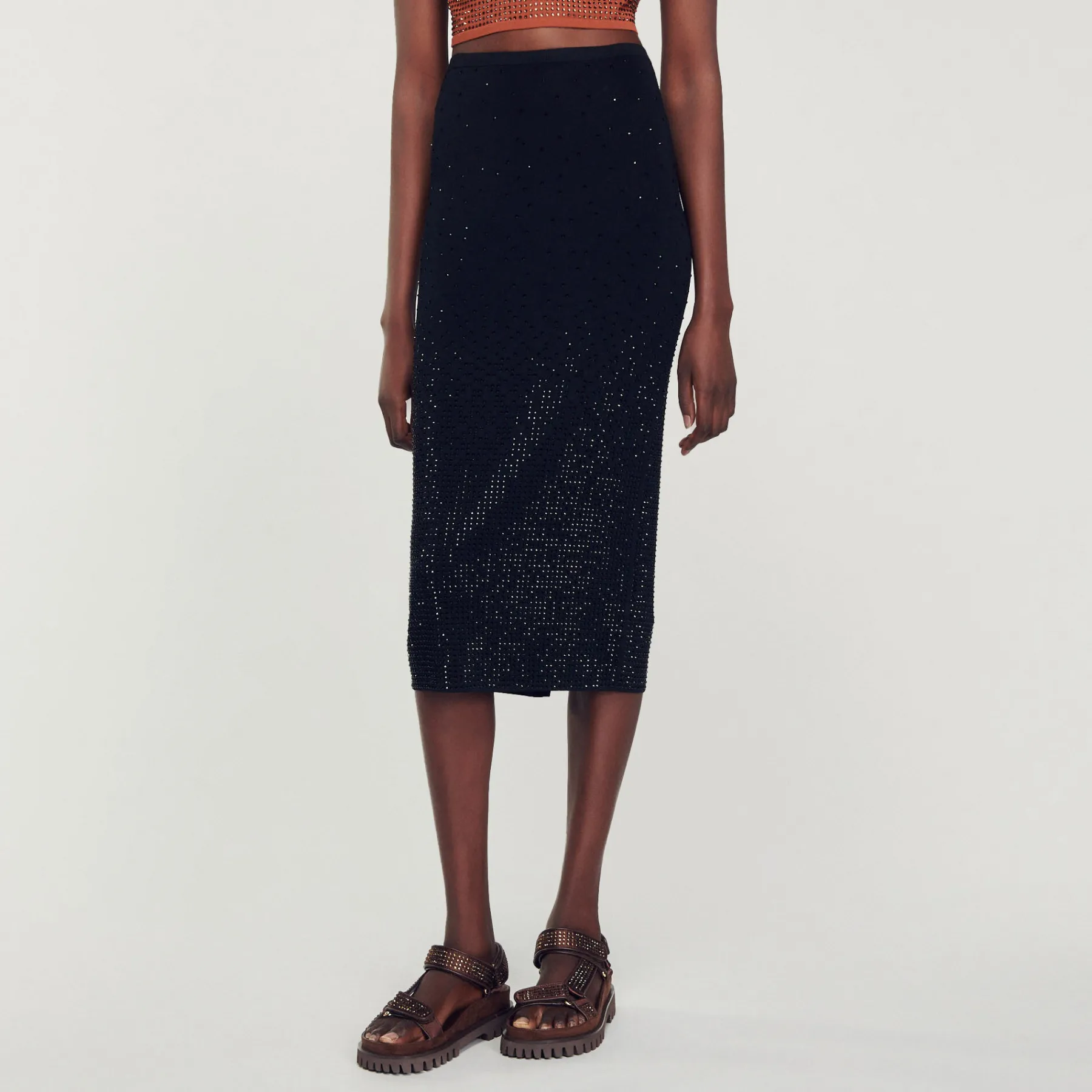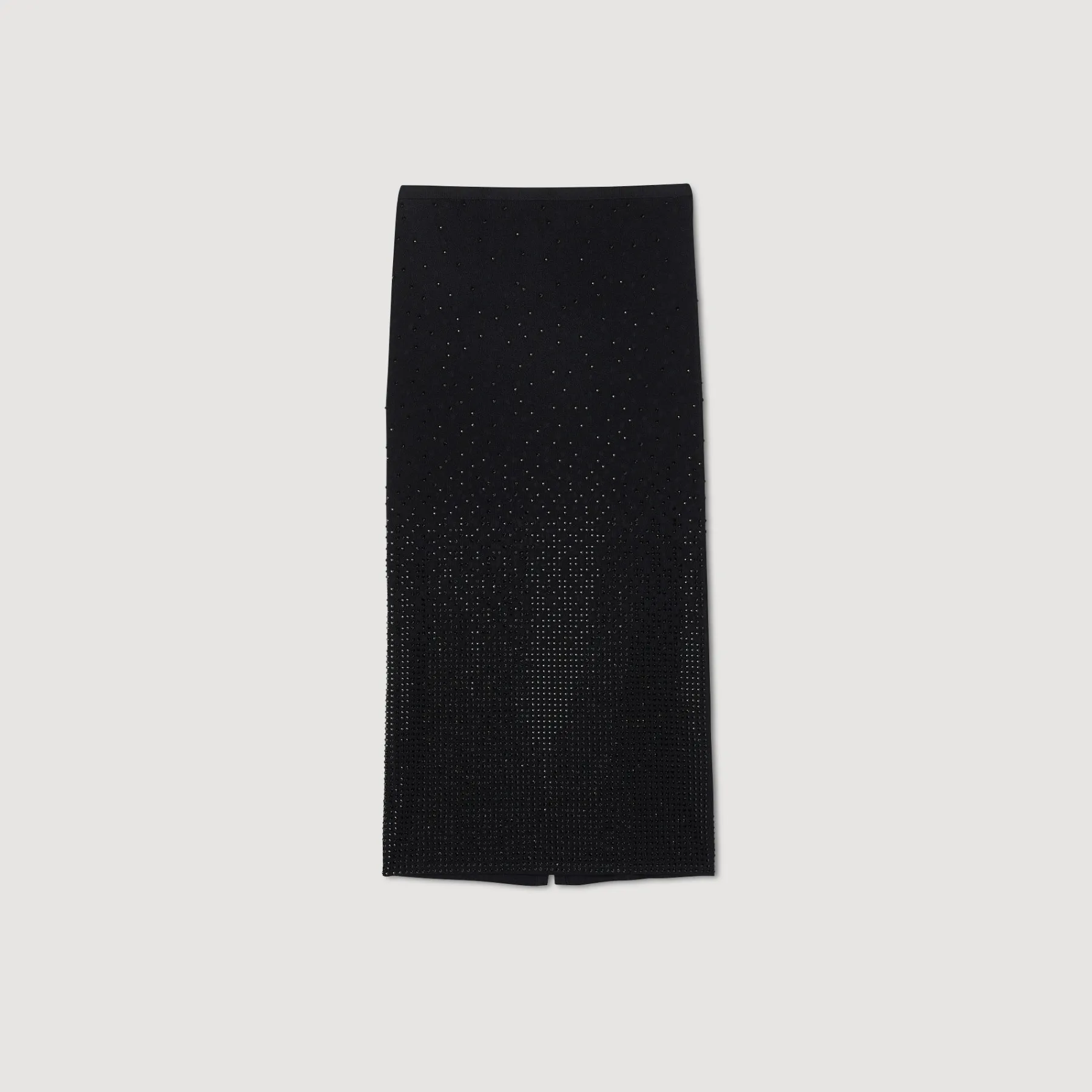 Figure-hugging stretch-knit midi skirt, embellished with all-over rhinestones.