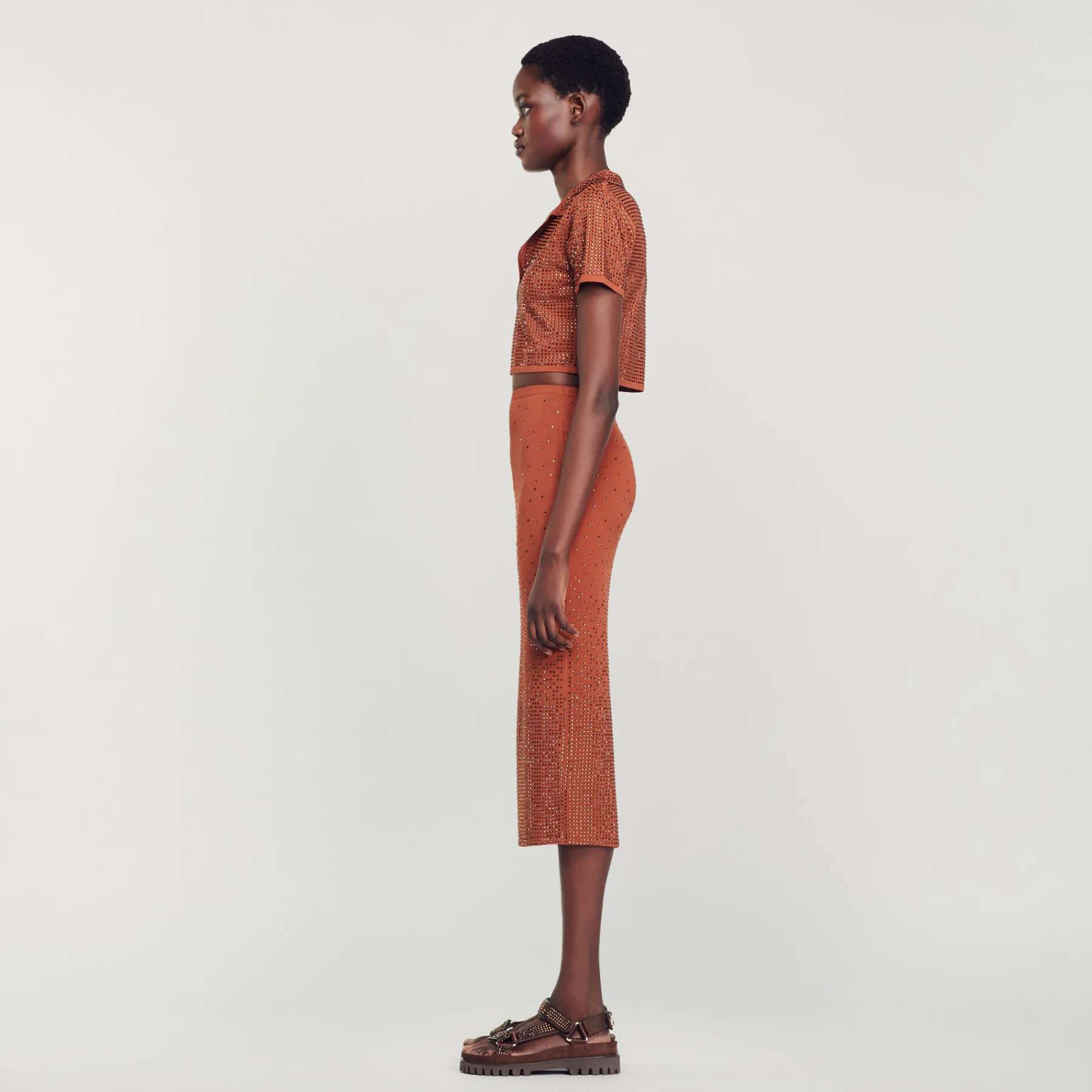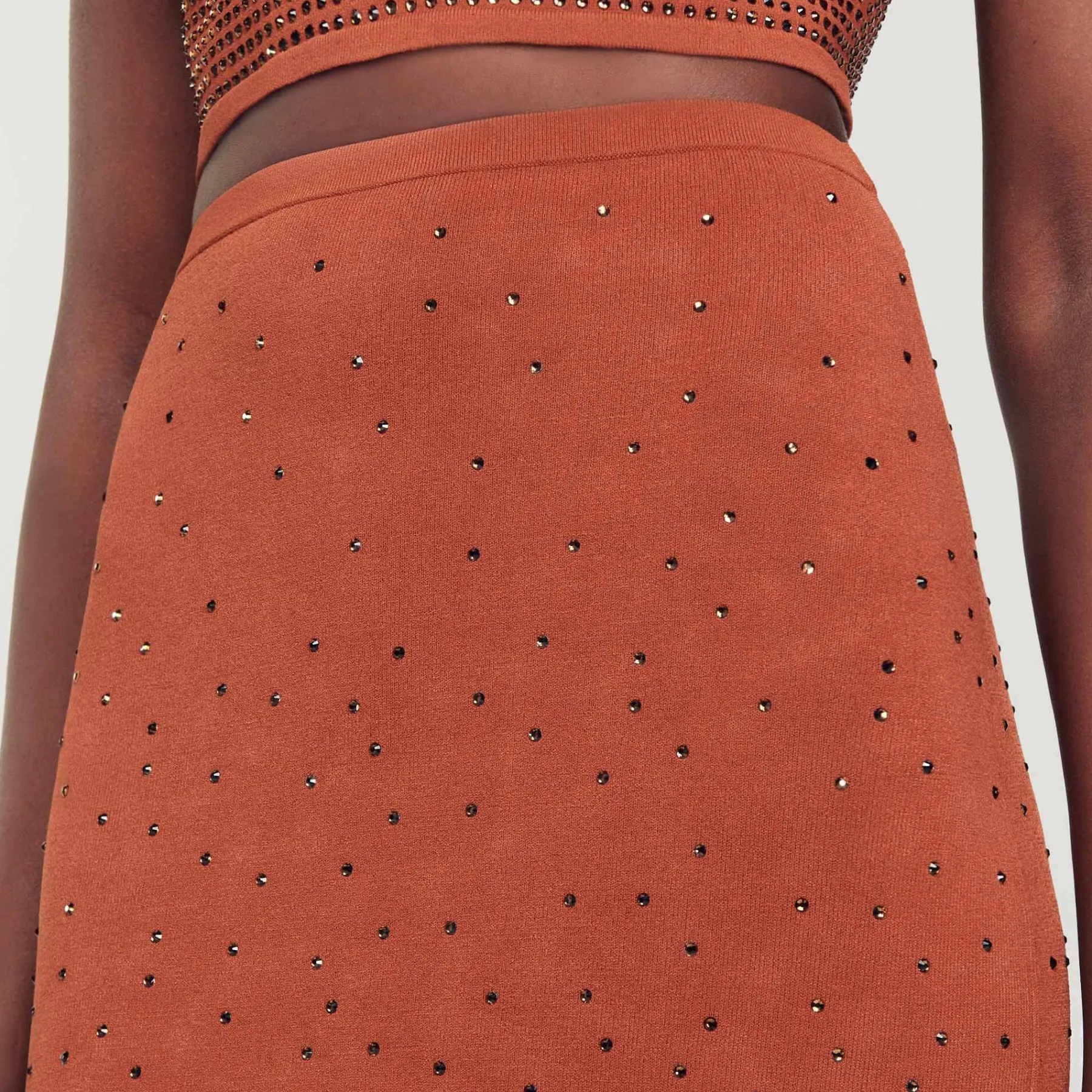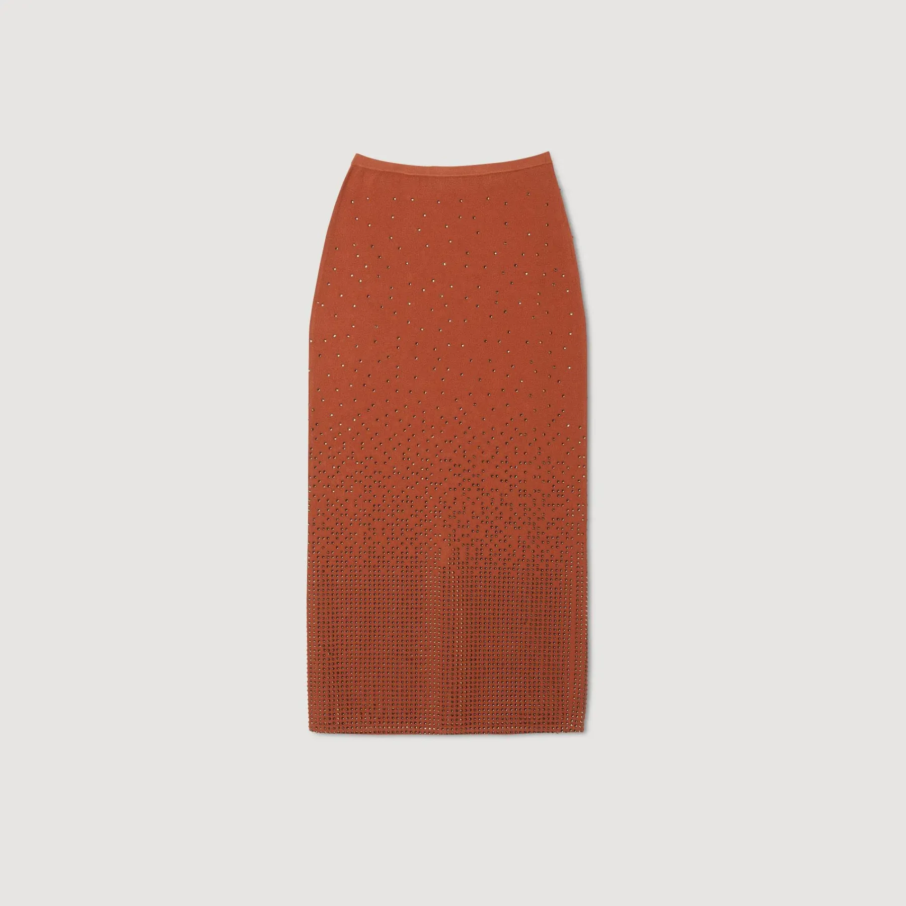 Figure-hugging stretch-knit midi skirt, embellished with all-over rhinestones.