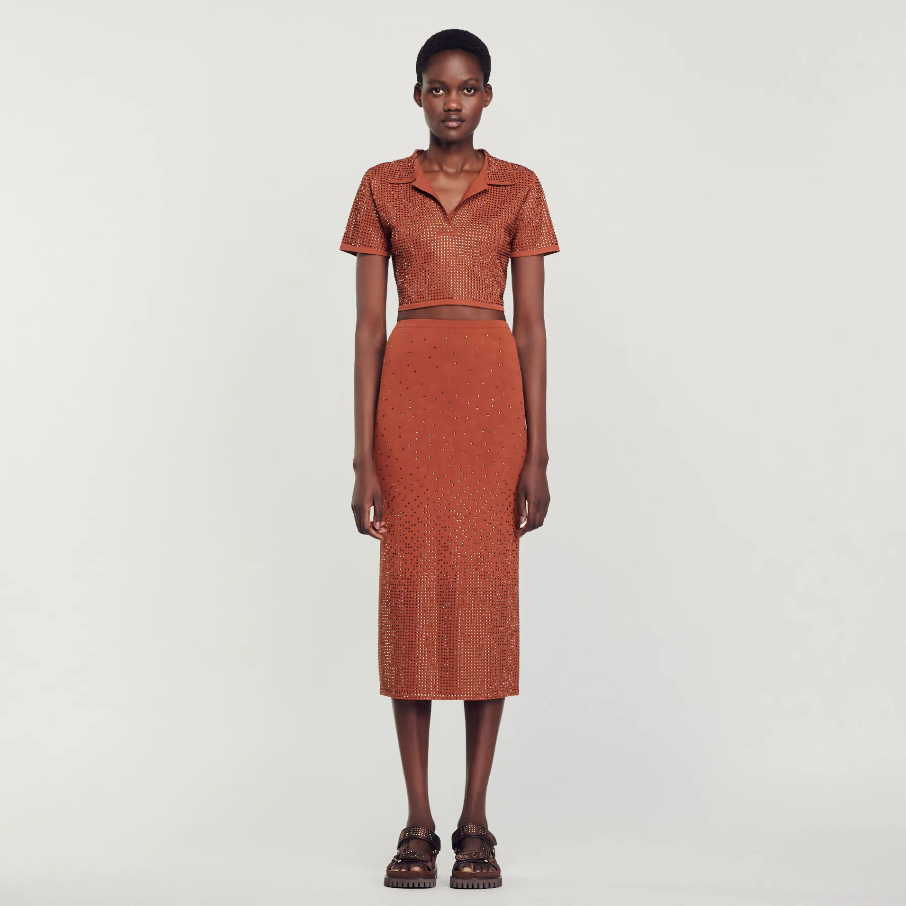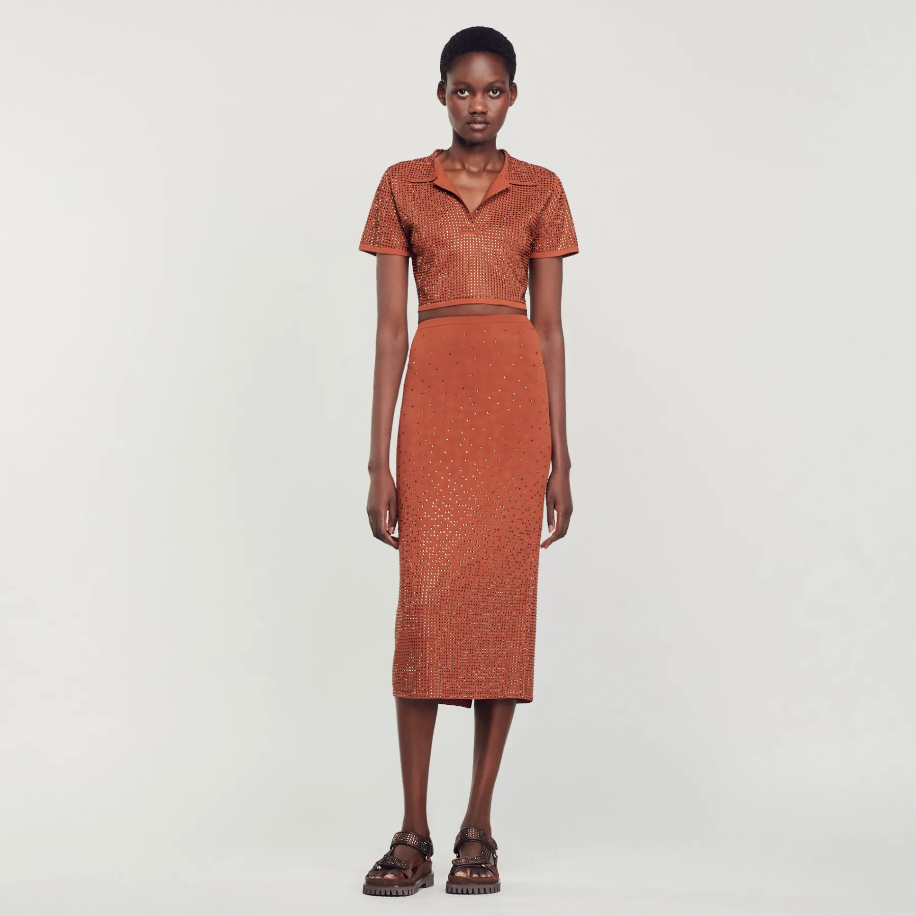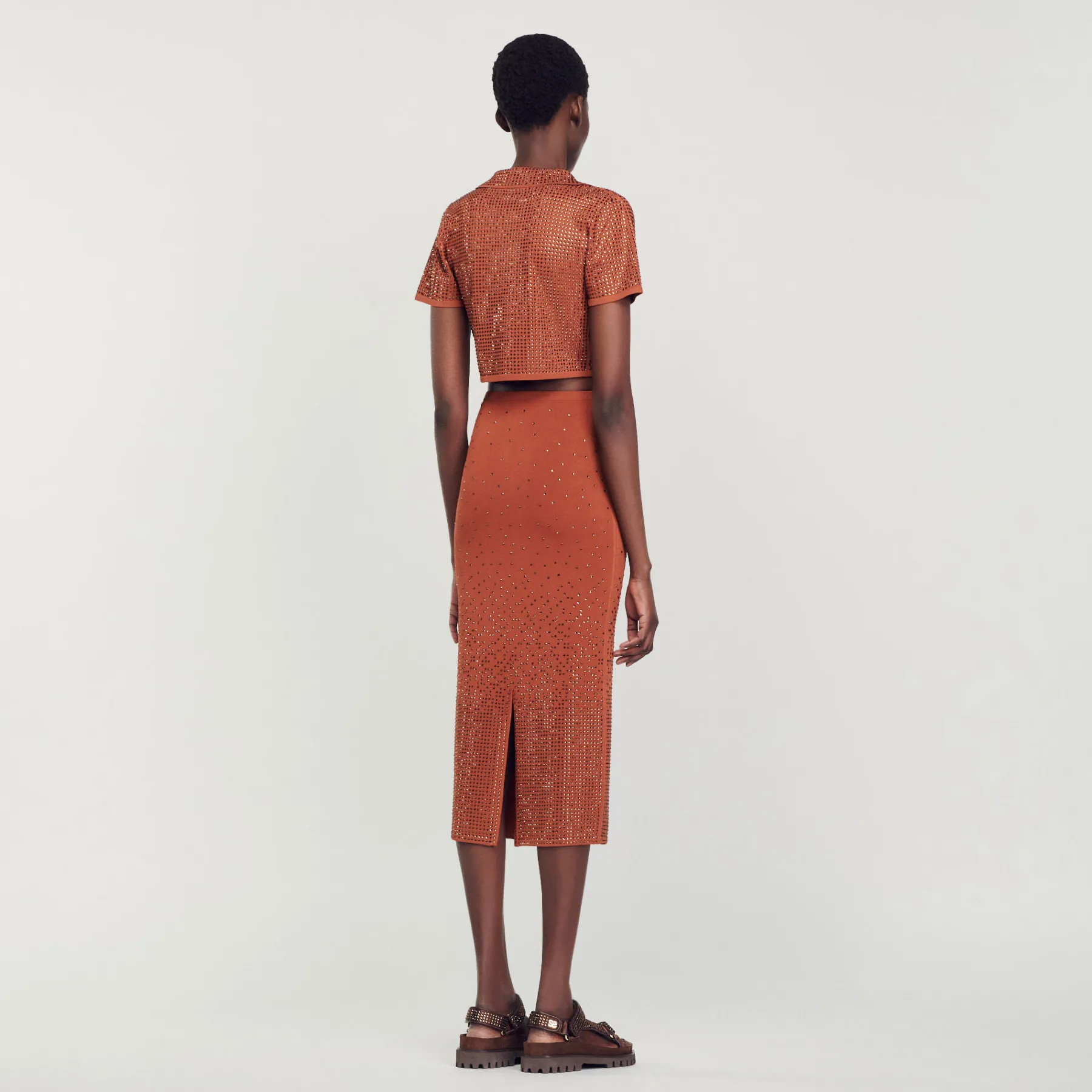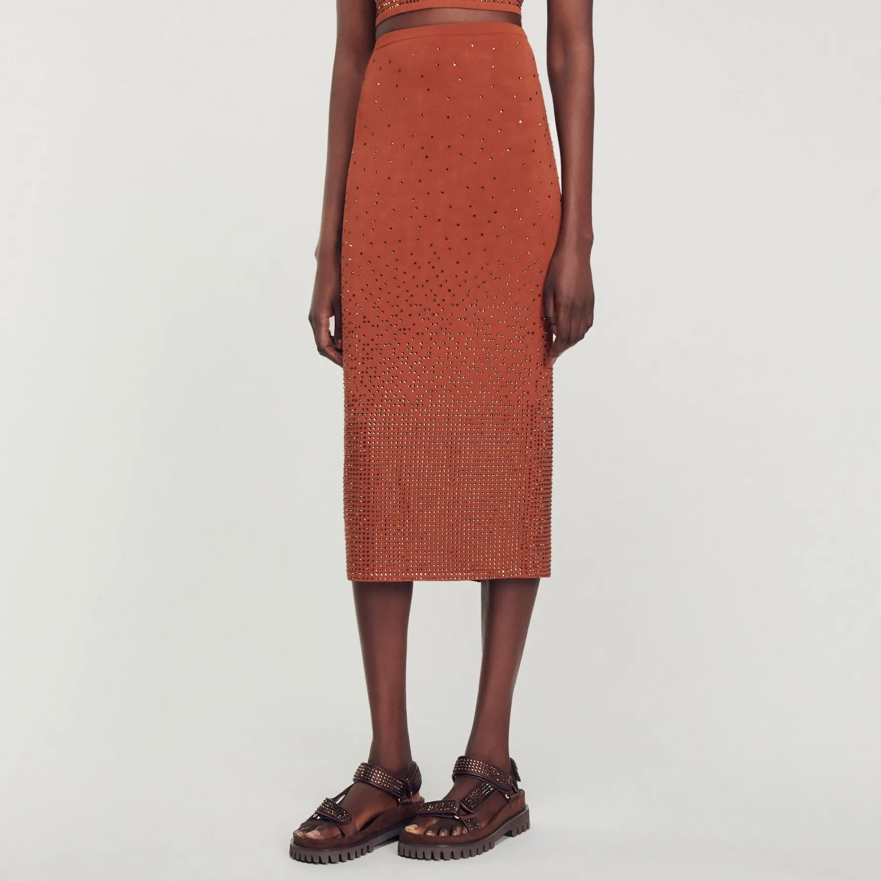 Figure-hugging stretch-knit midi skirt, embellished with all-over rhinestones.