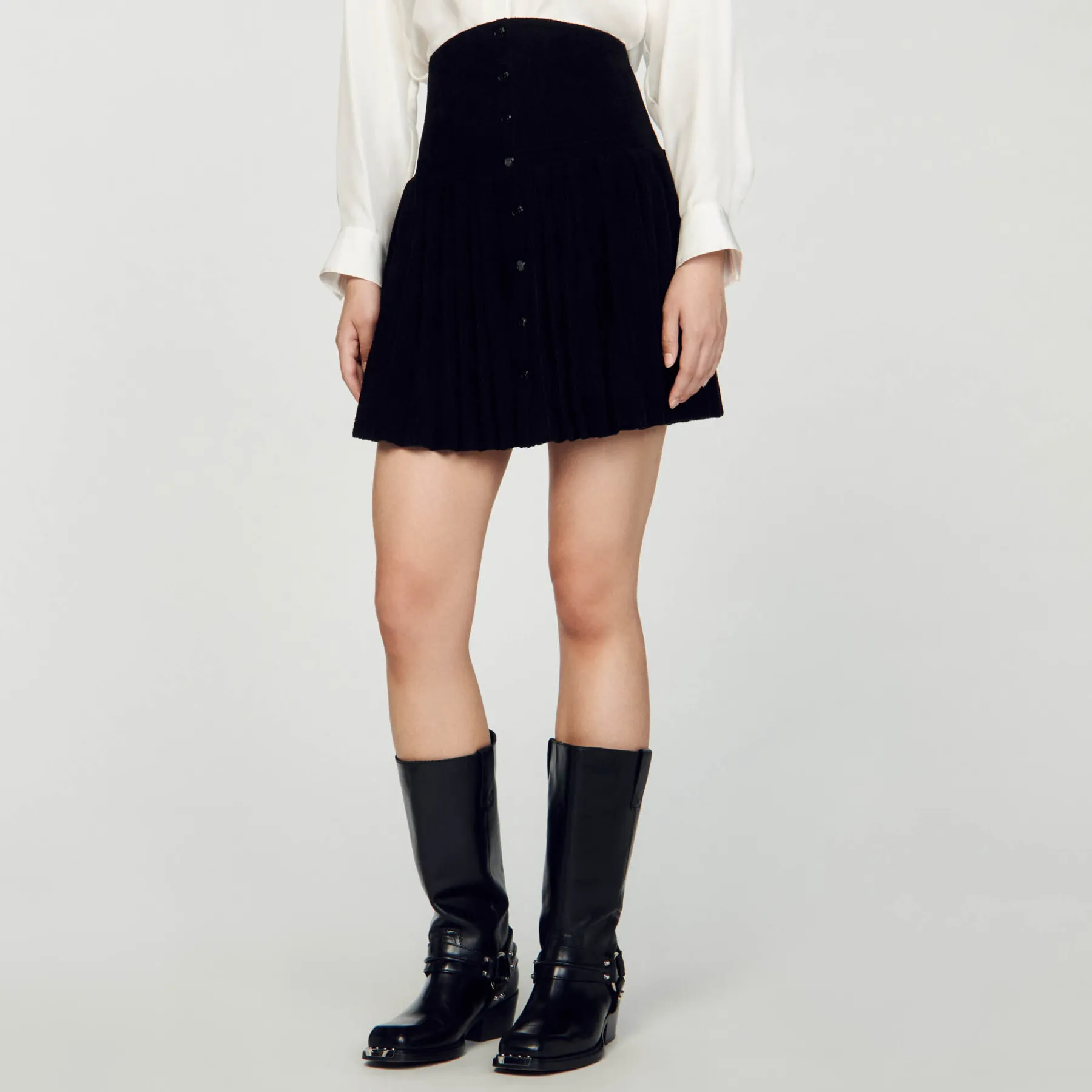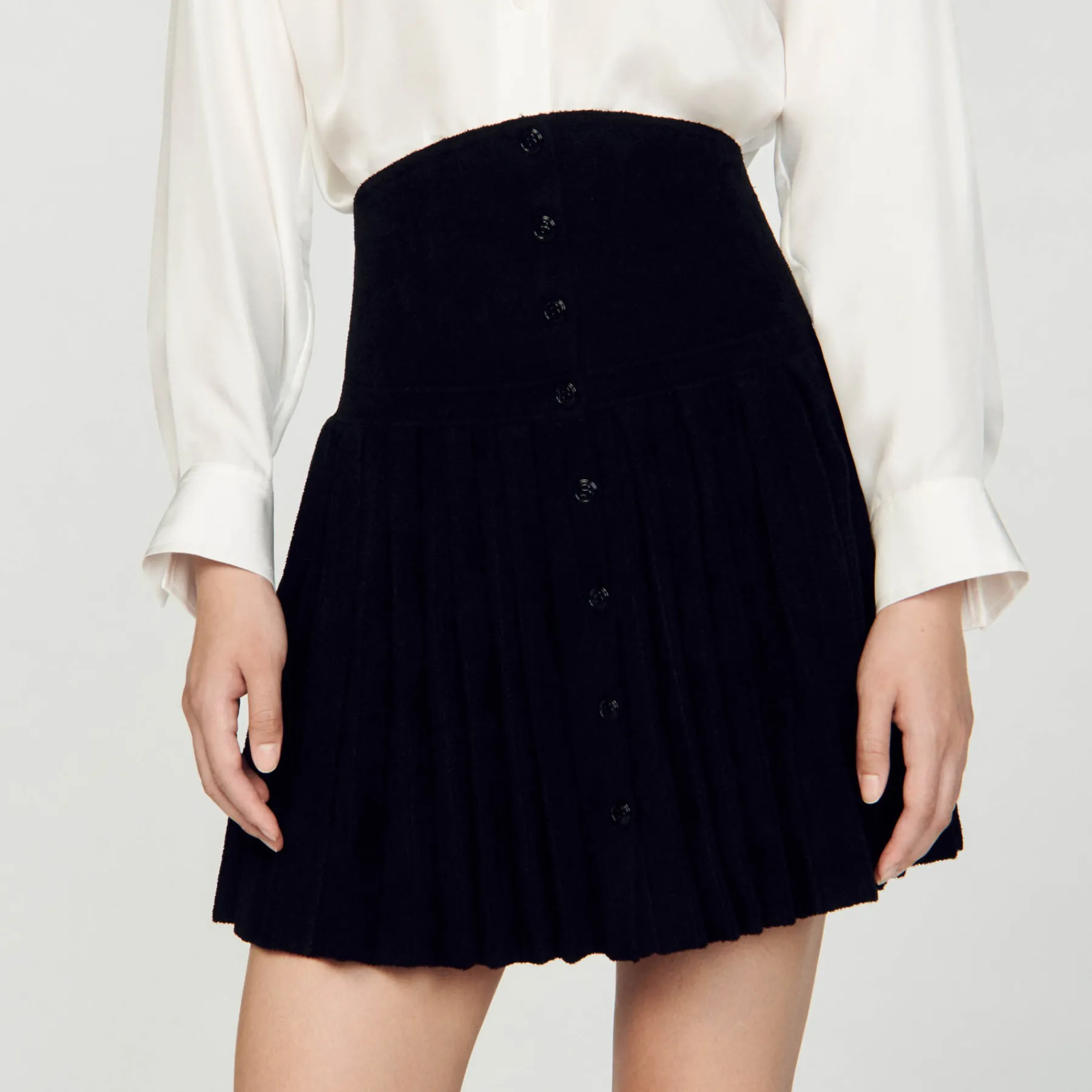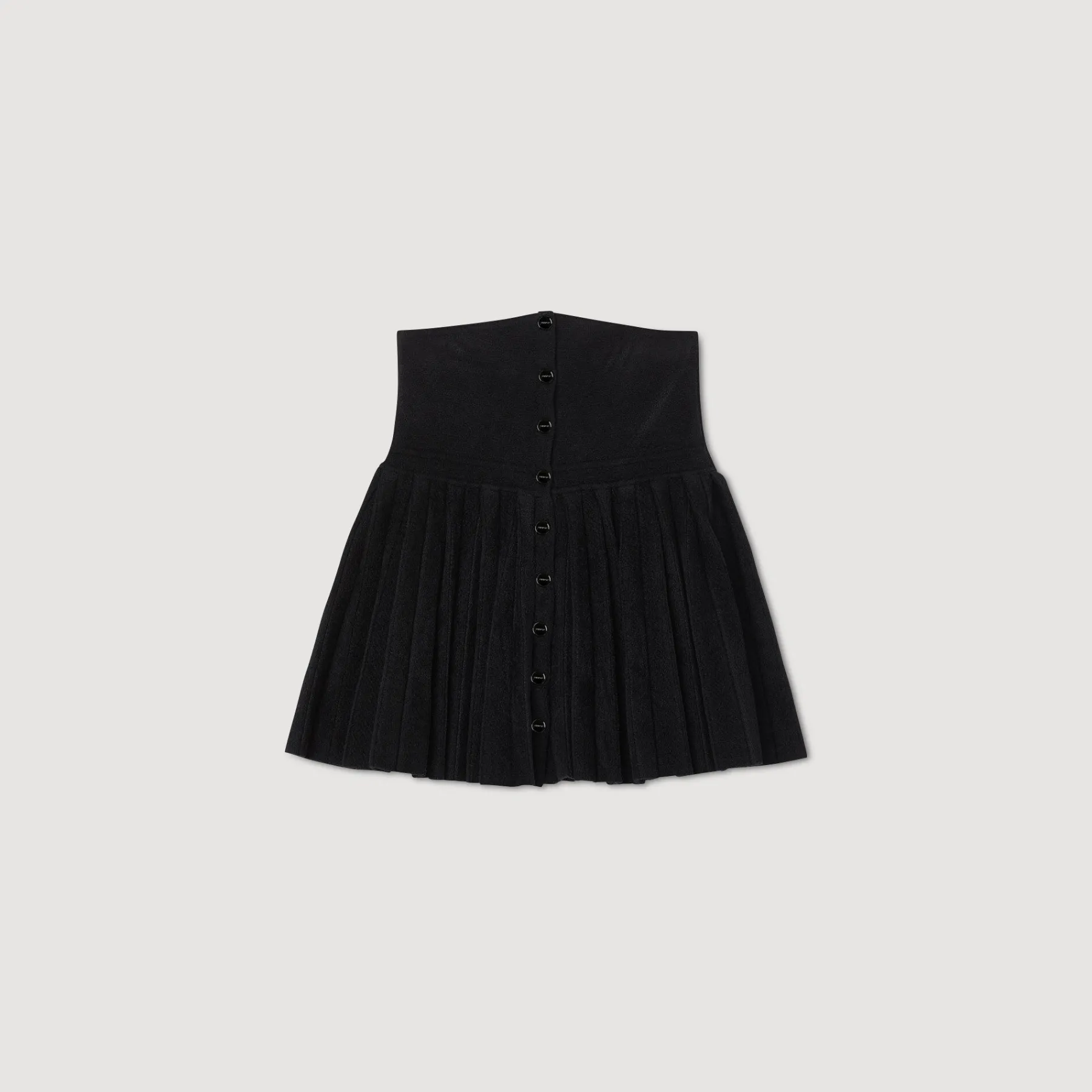 Short velvet knit skirt with corset-effect high waist, flared hem and lacquered front press studs.