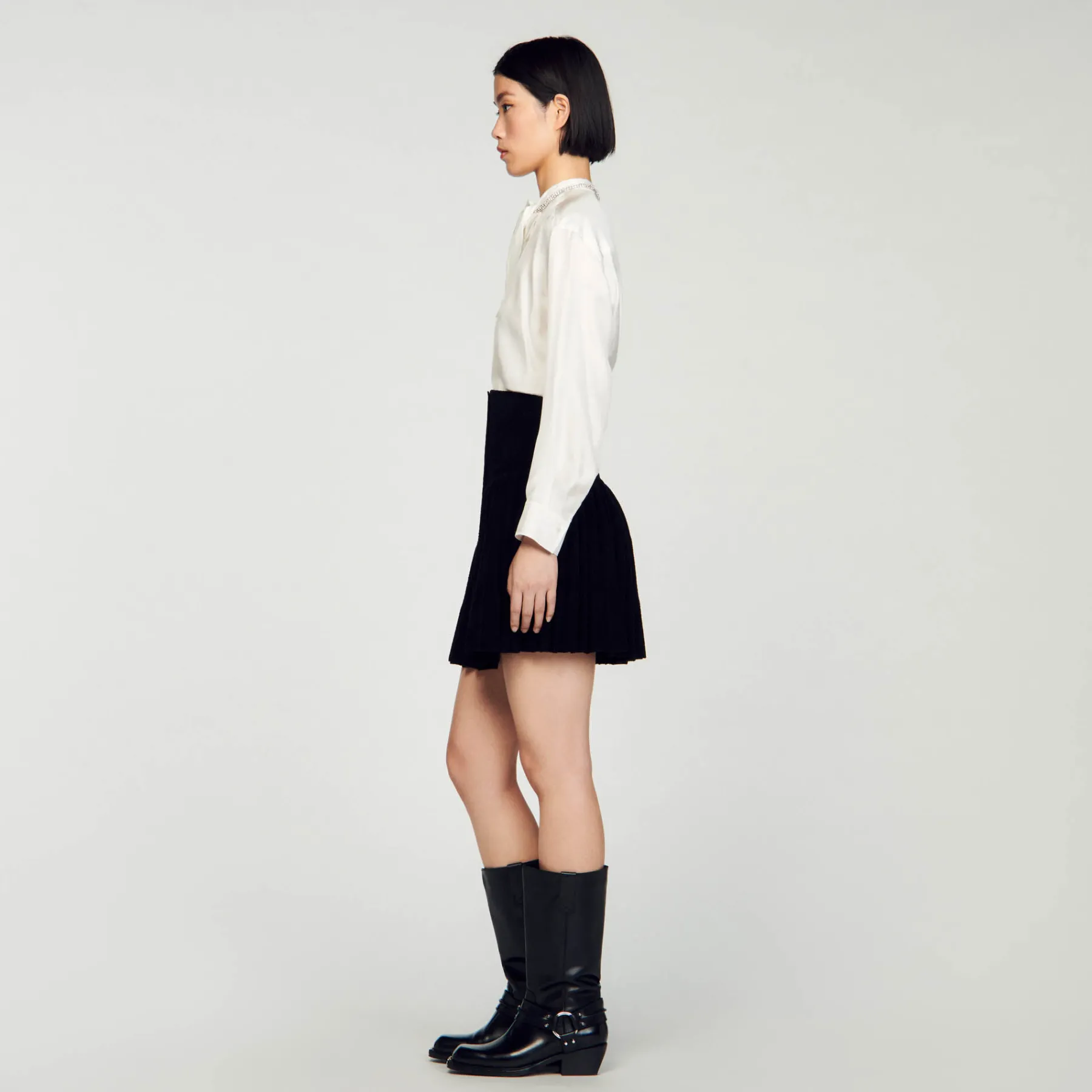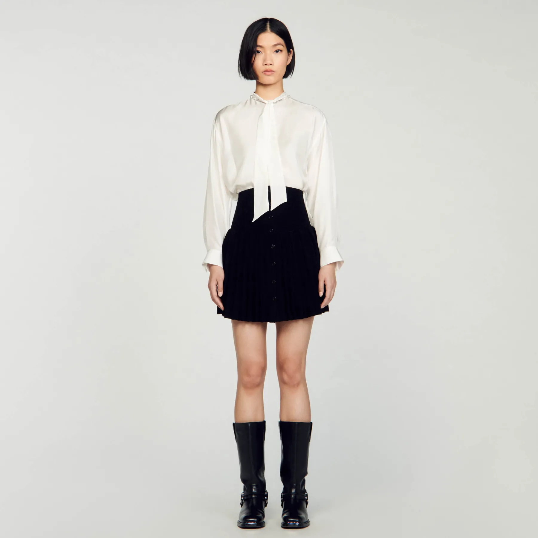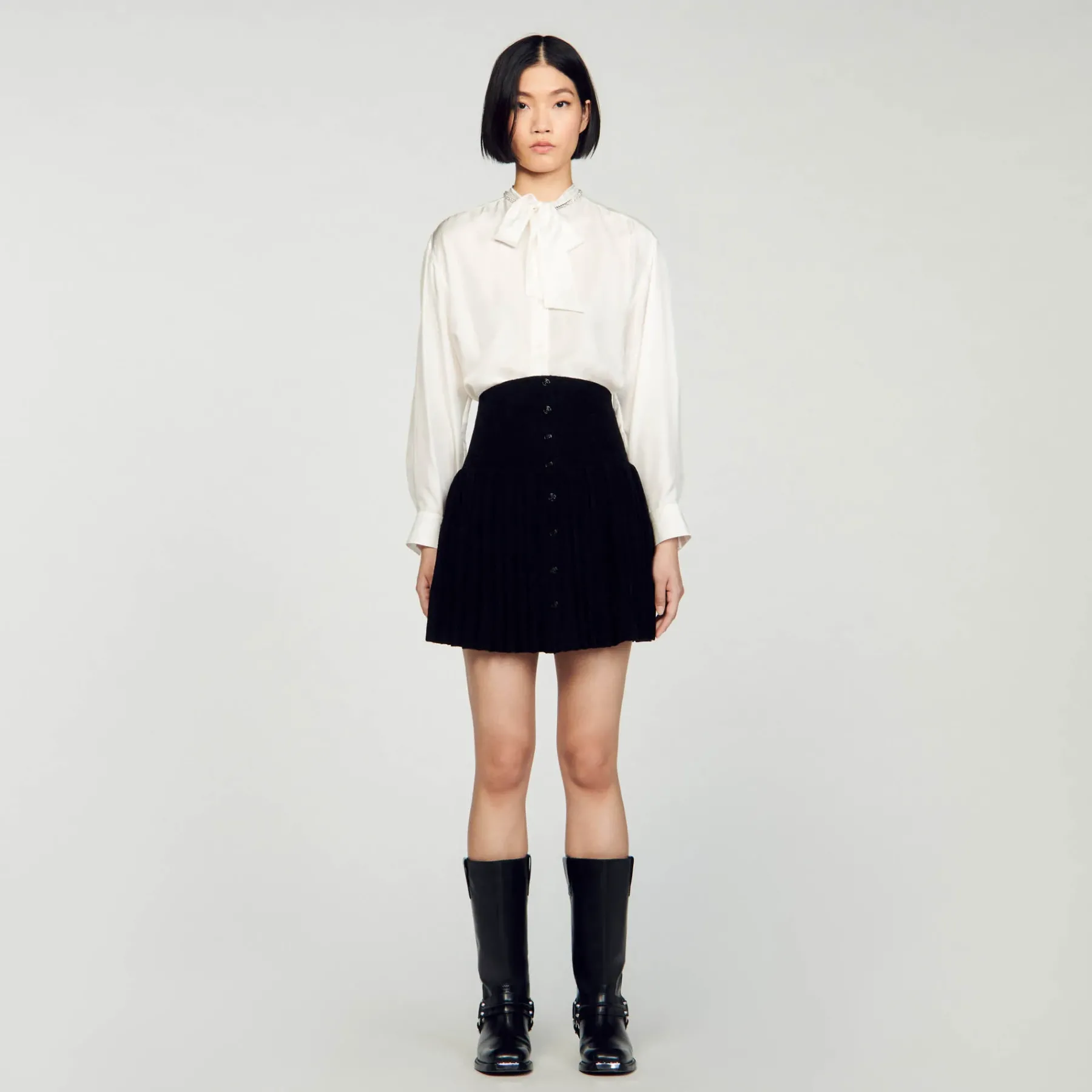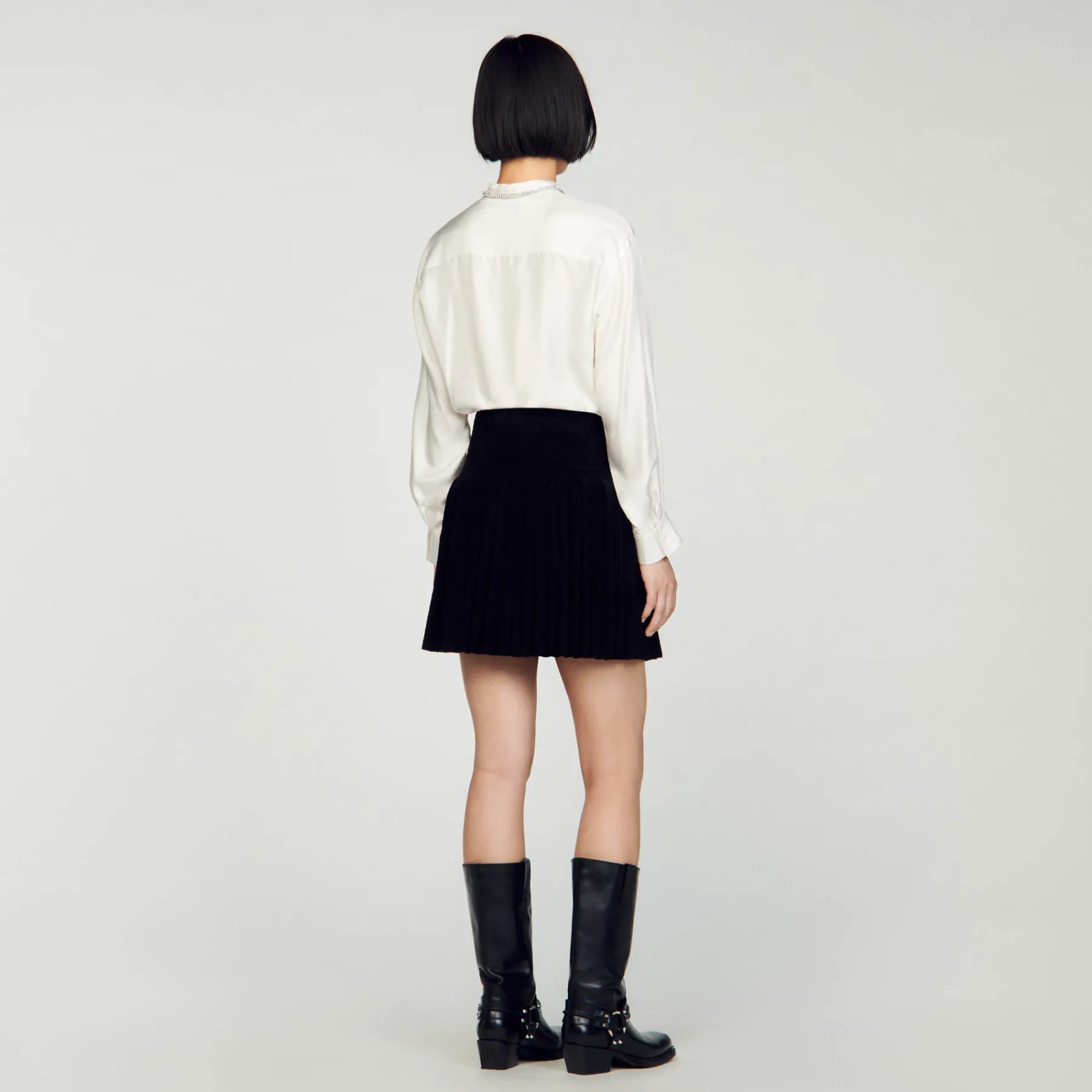 Short velvet knit skirt with corset-effect high waist, flared hem and lacquered front press studs.