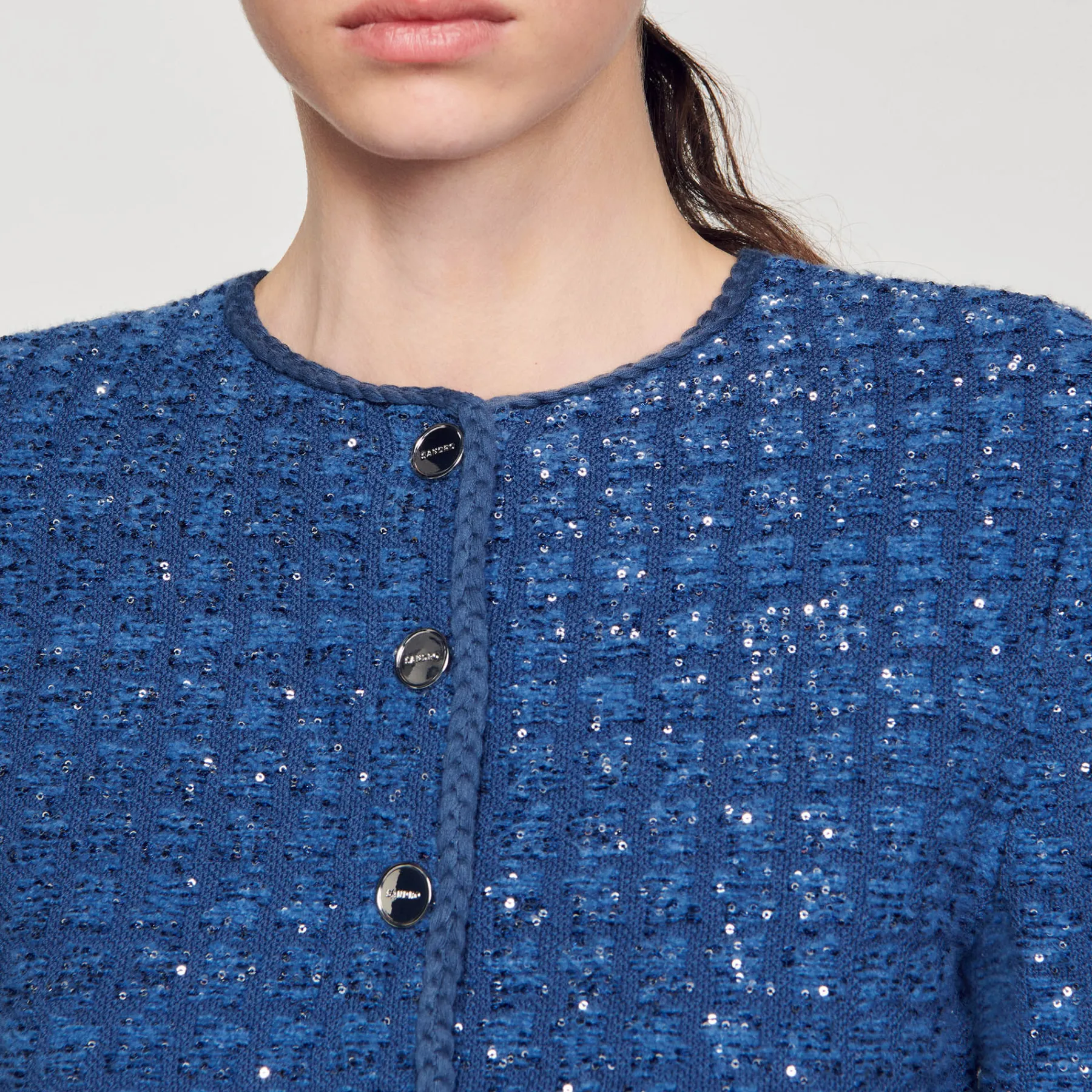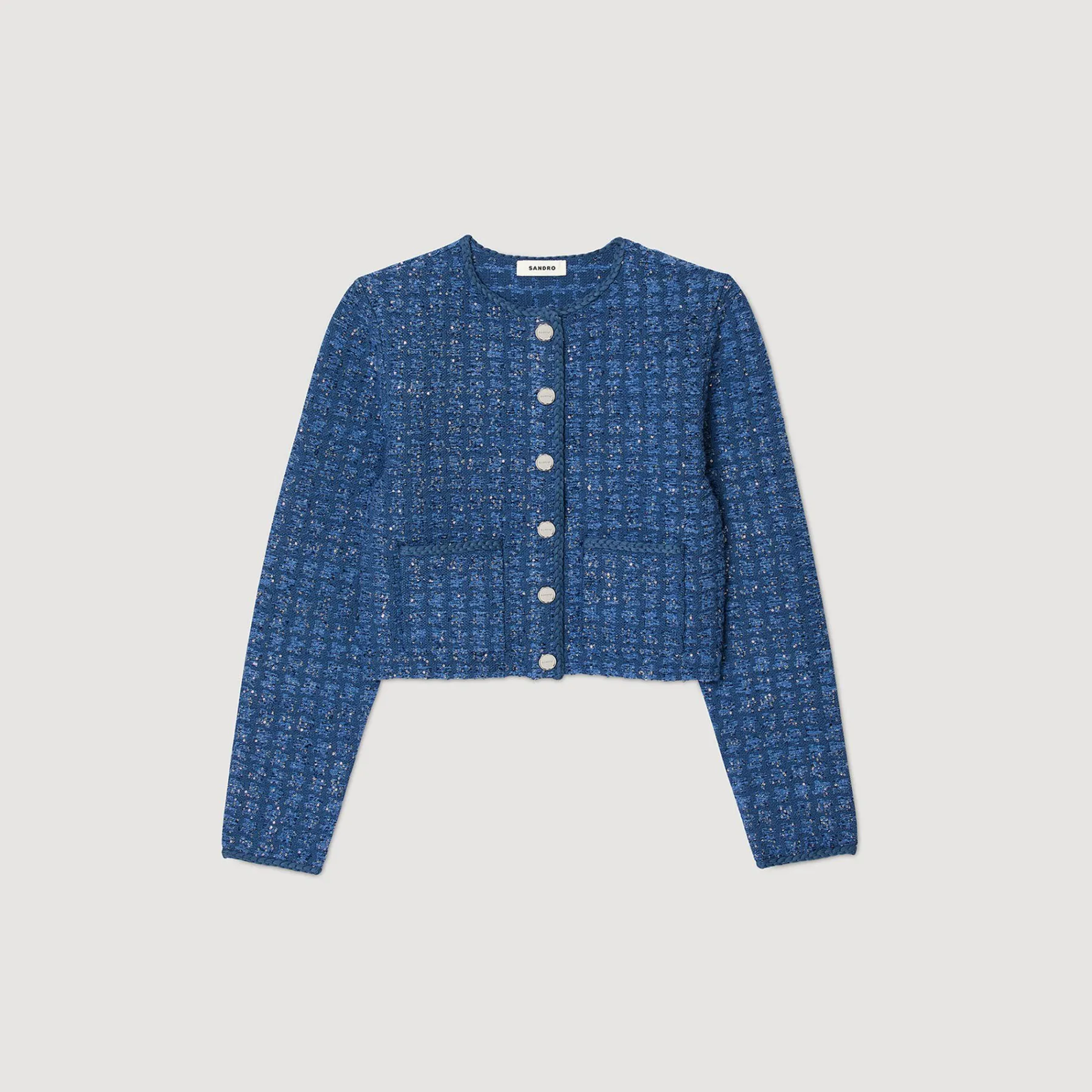 Short coatigan in a decorative knit with a glittering tweed effect, button fastening, braided ribbing and patch pockets at the waist.