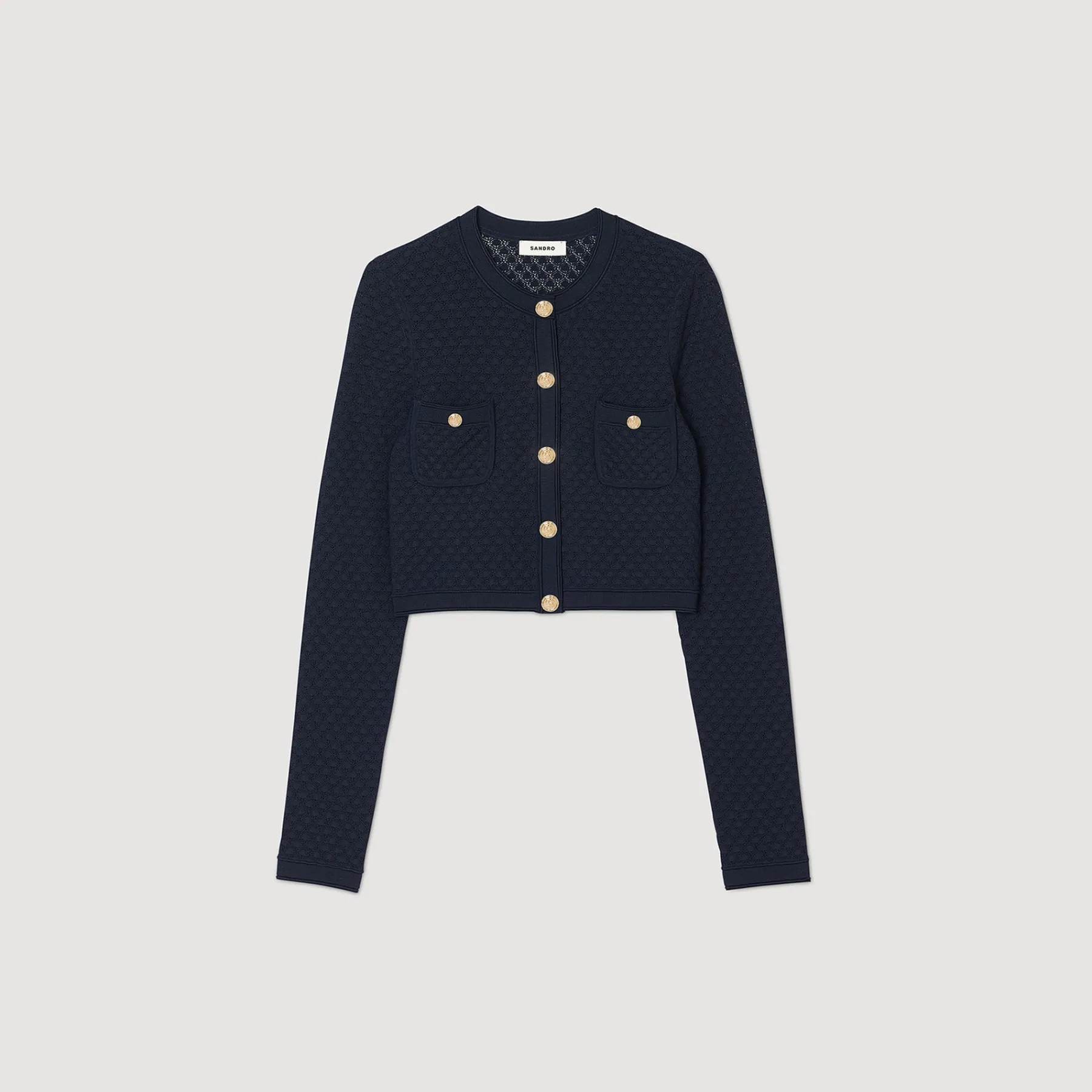 Cropped decorative knit coatigan with round collar, long sleeves, button fastening and patch pockets with Sandro buttons.