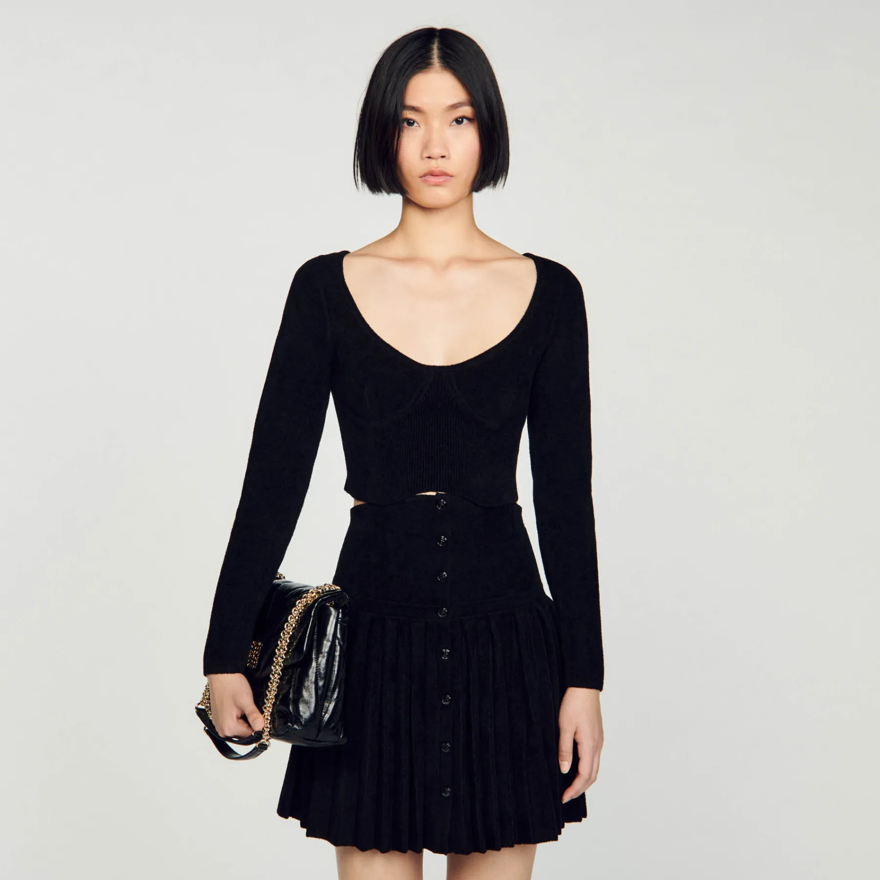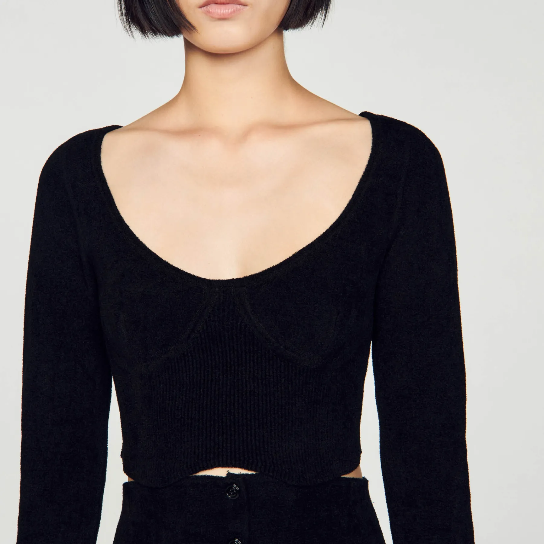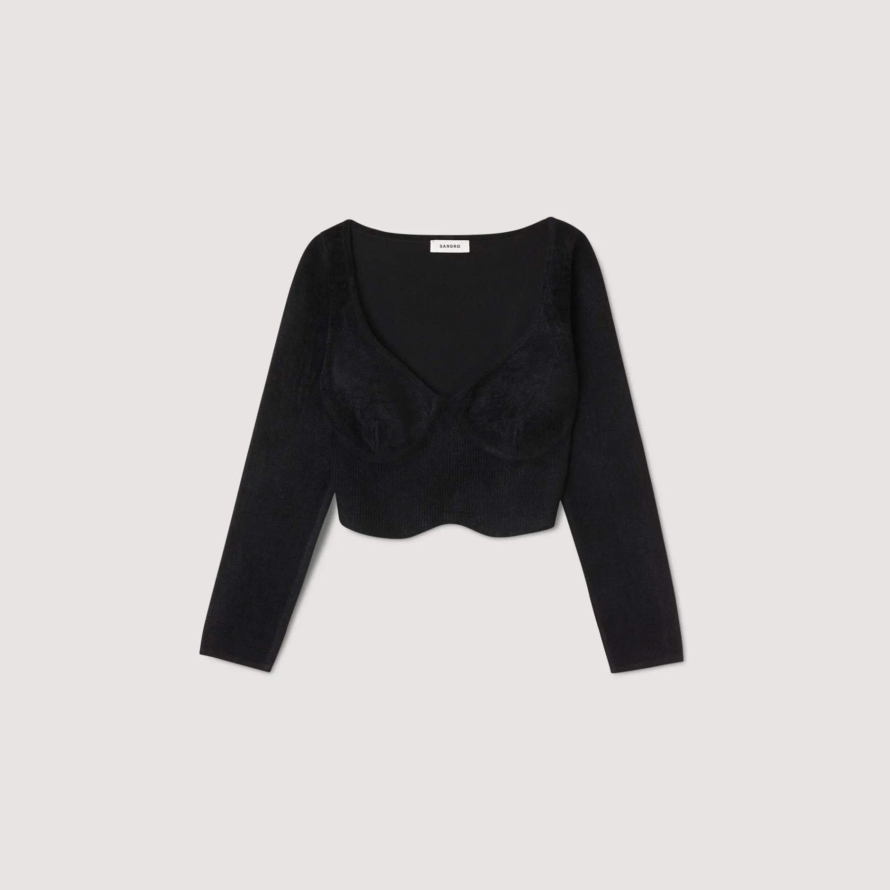 Figure-hugging cropped sweater in velvet knit, with long sleeves, an oversized round neck and embellished with corset-effect panels.