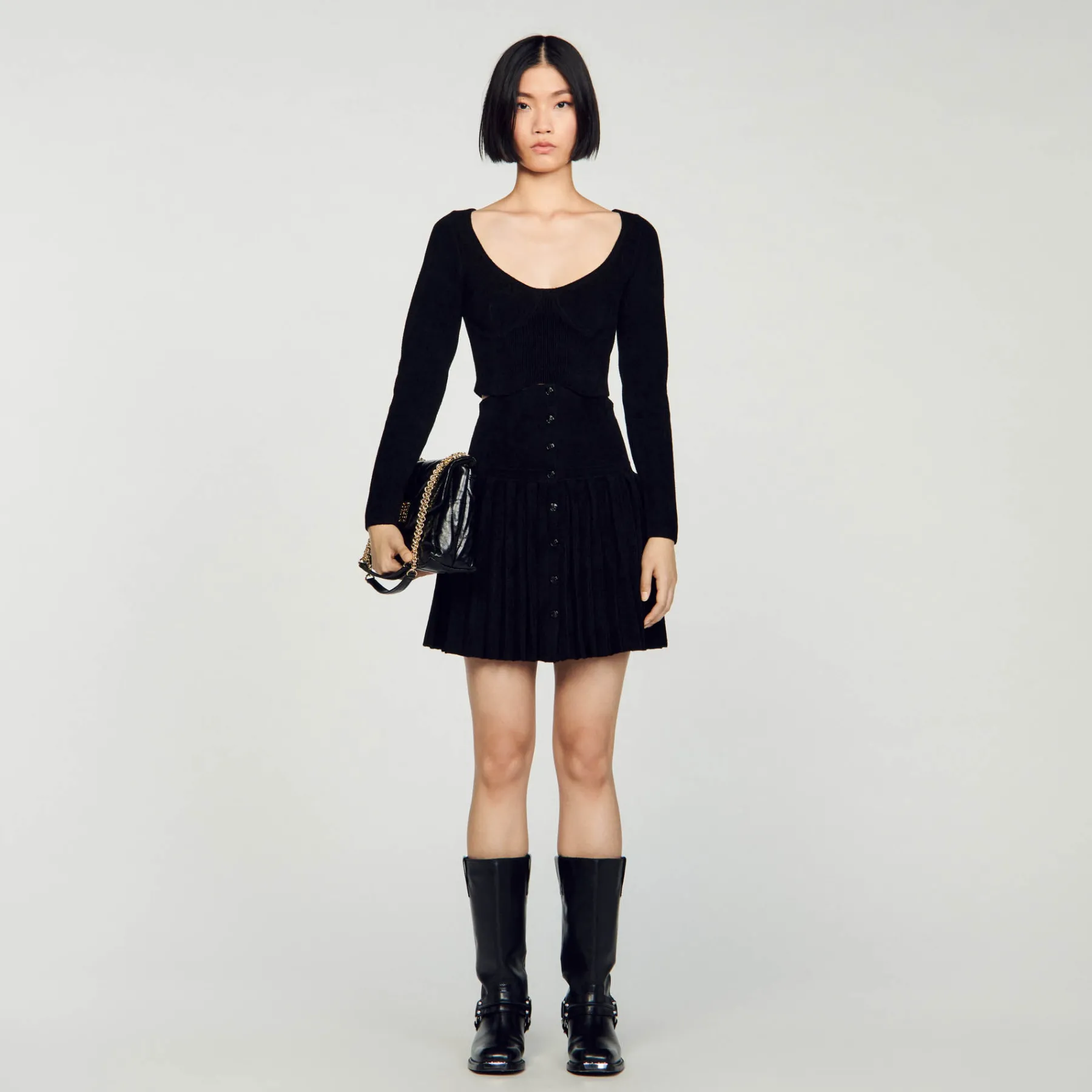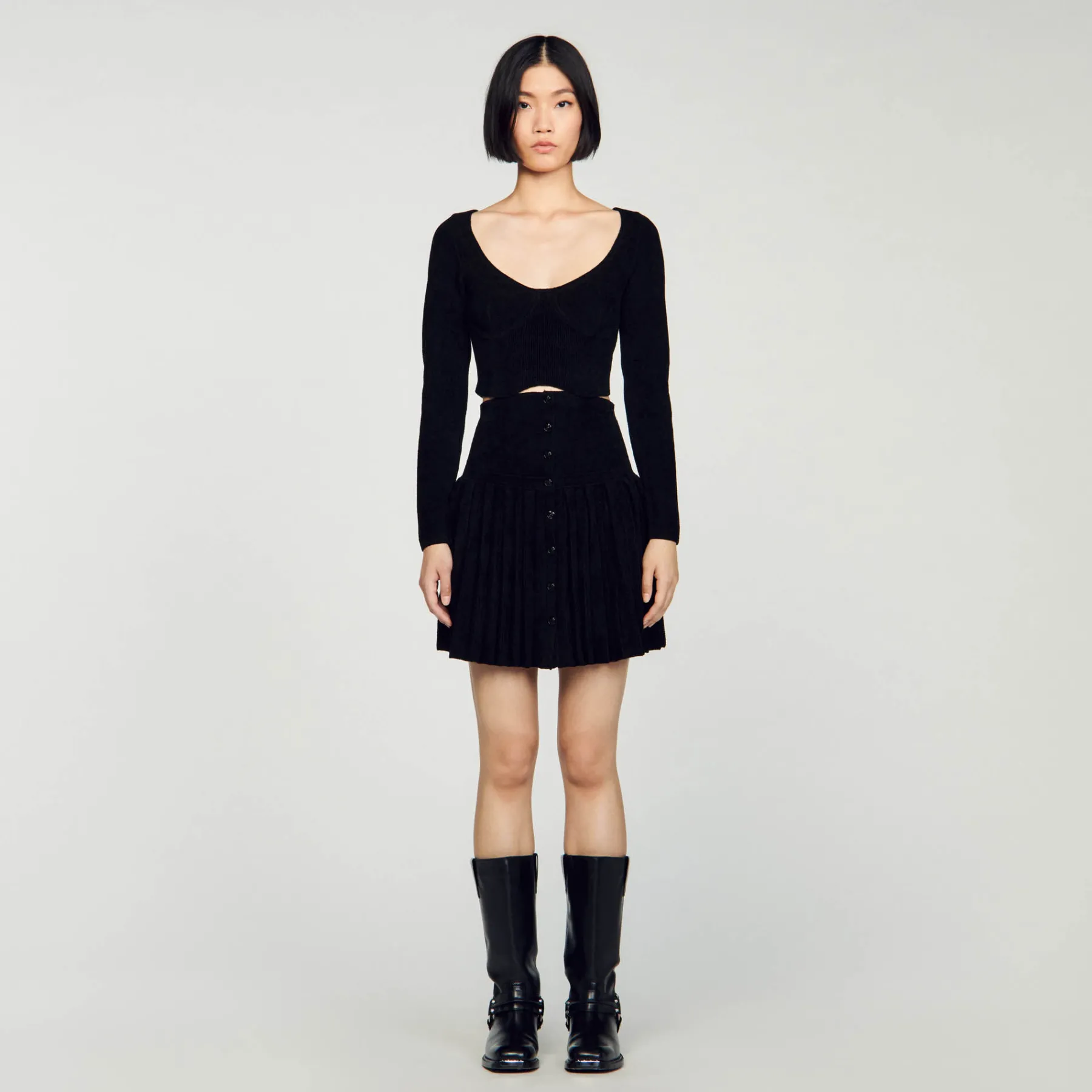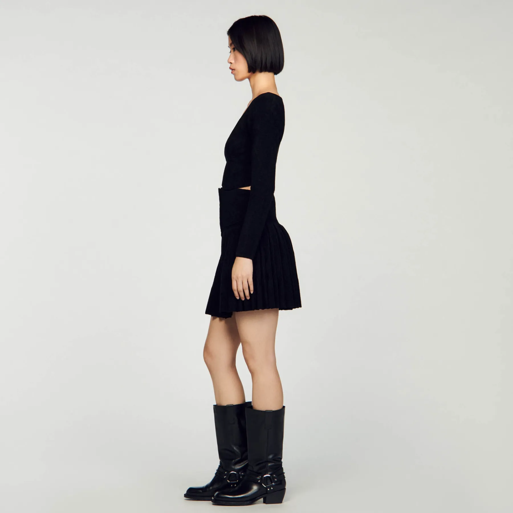 Figure-hugging cropped sweater in velvet knit, with long sleeves, an oversized round neck and embellished with corset-effect panels.