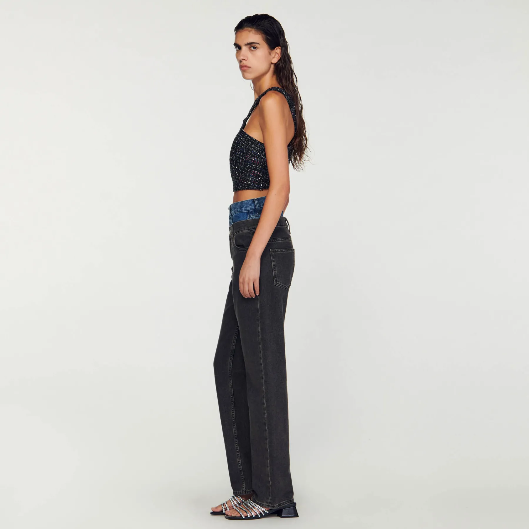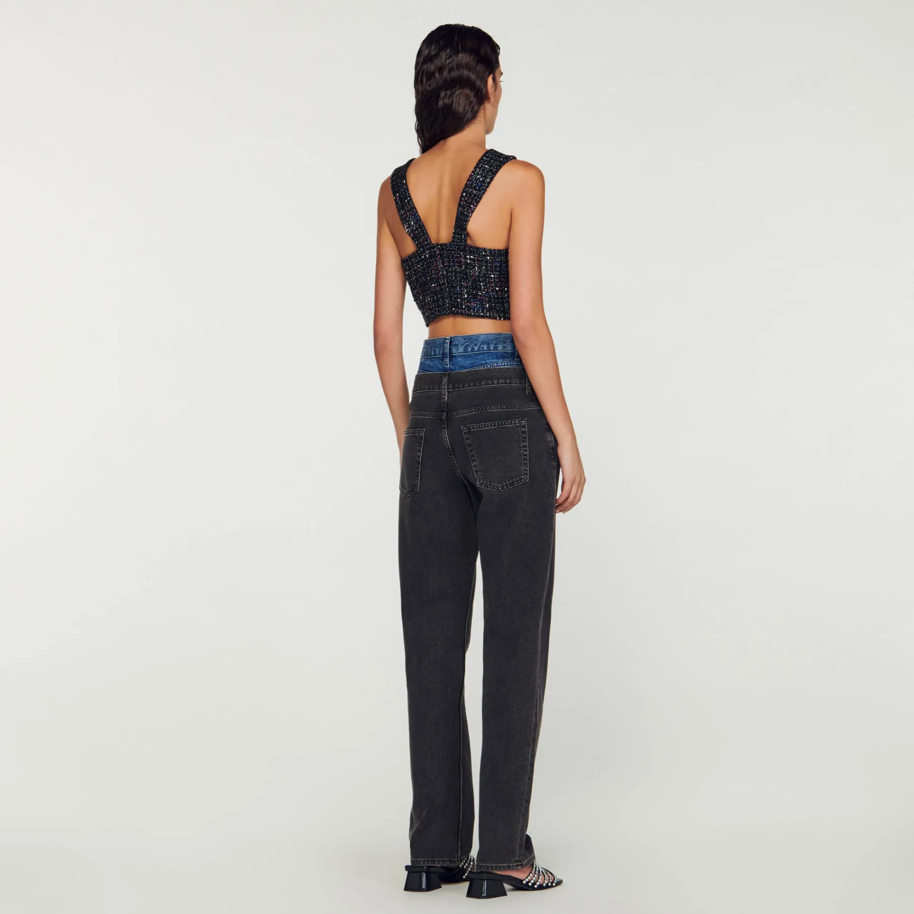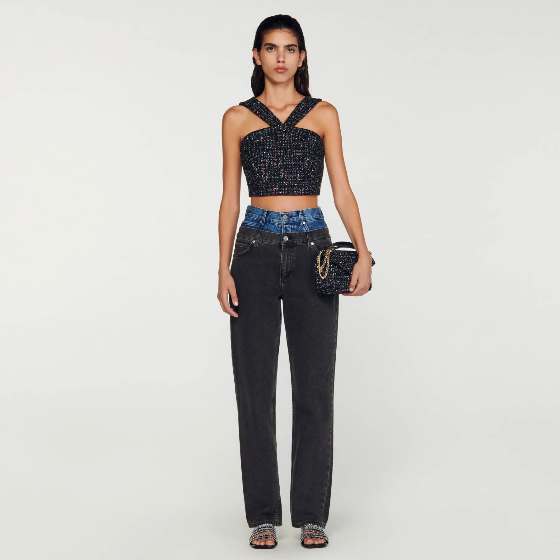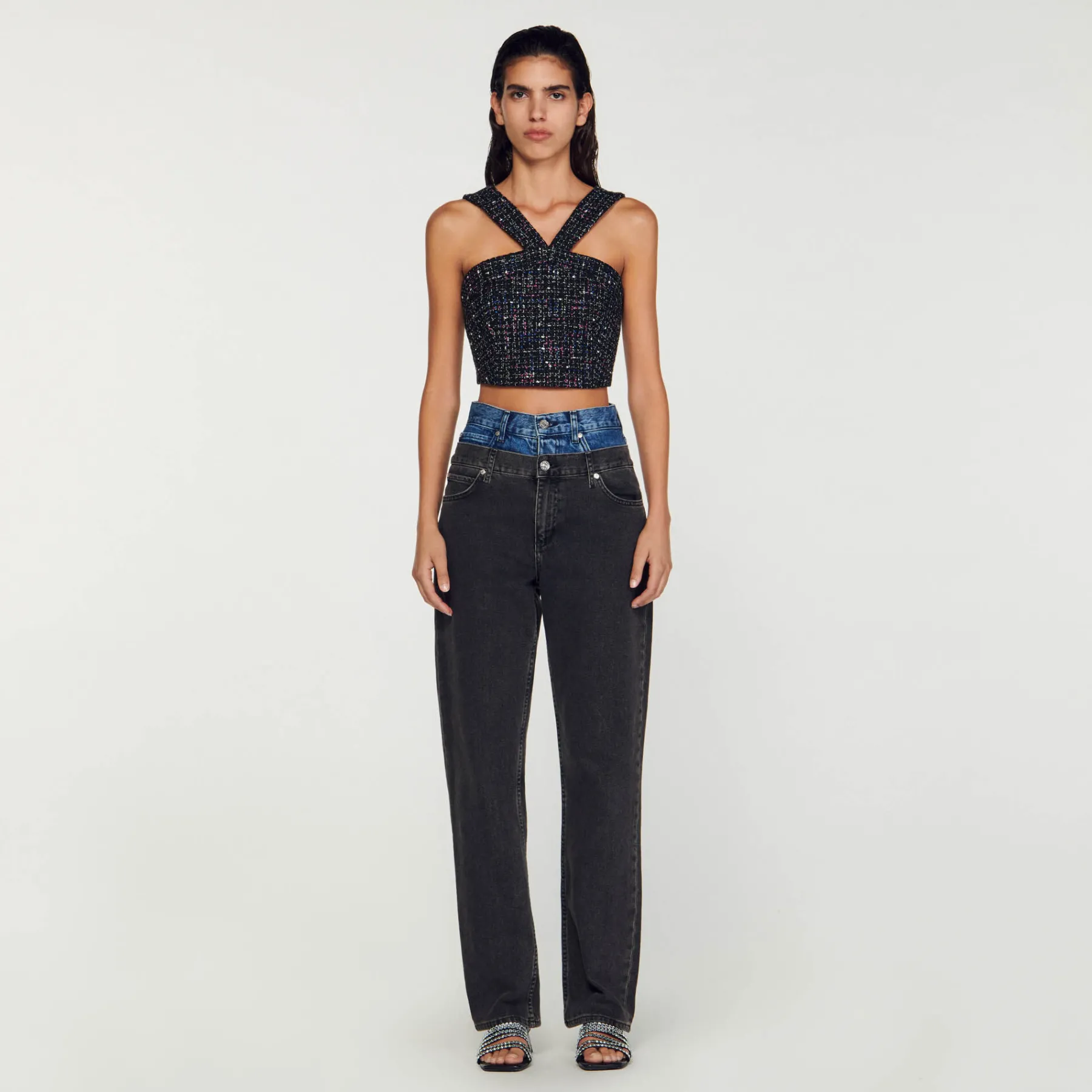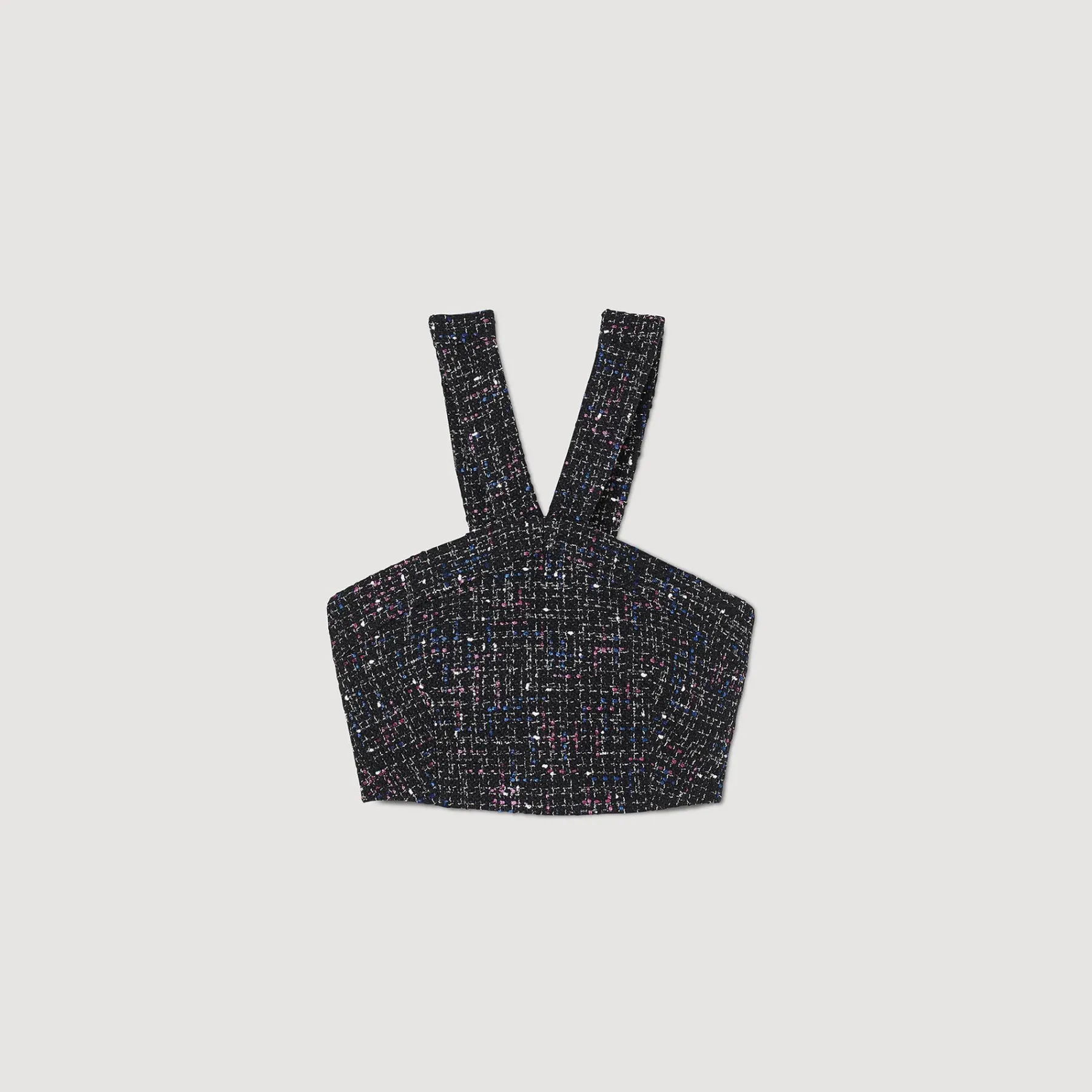 Strapless crop top in two-tone tweed, with flat straps on the neckline.