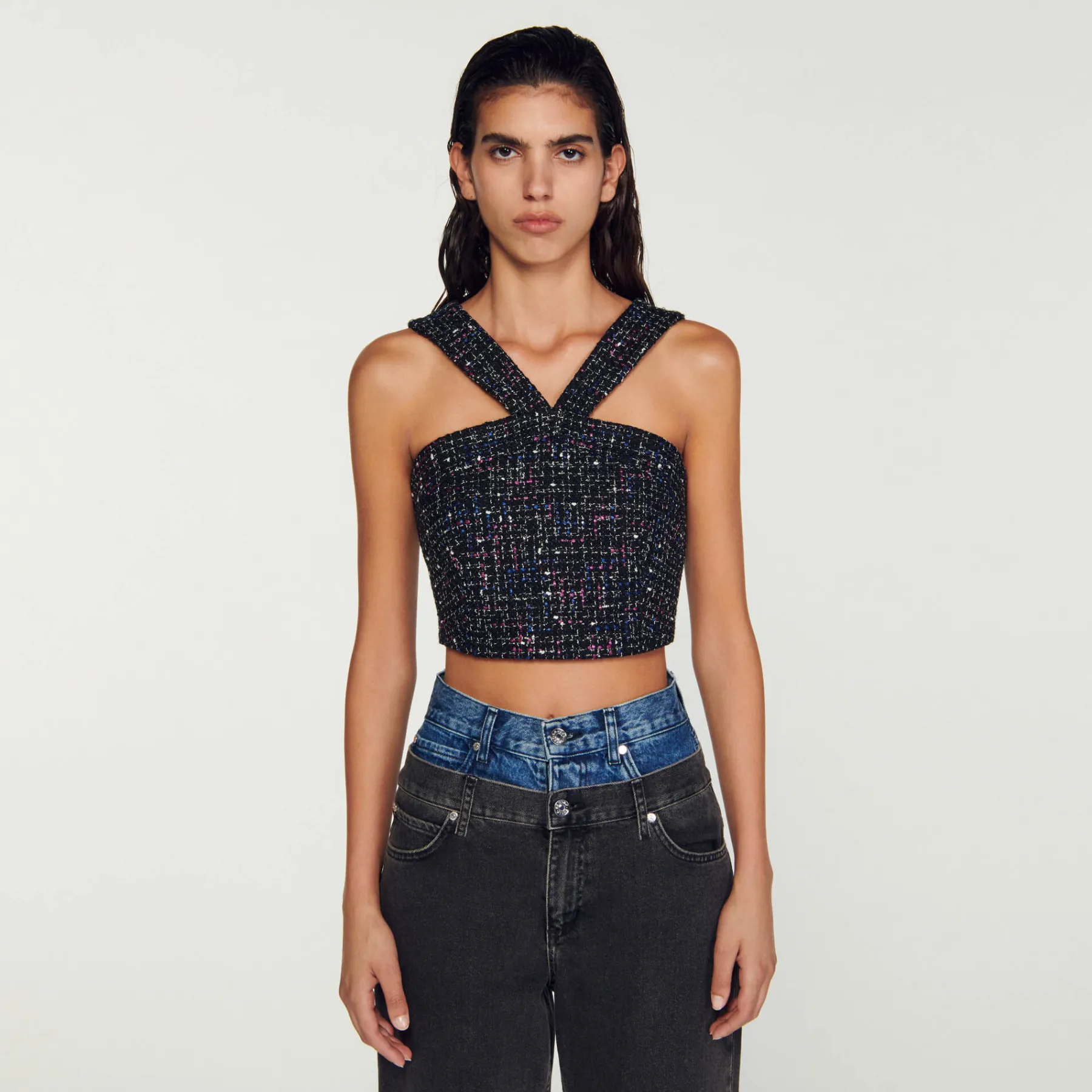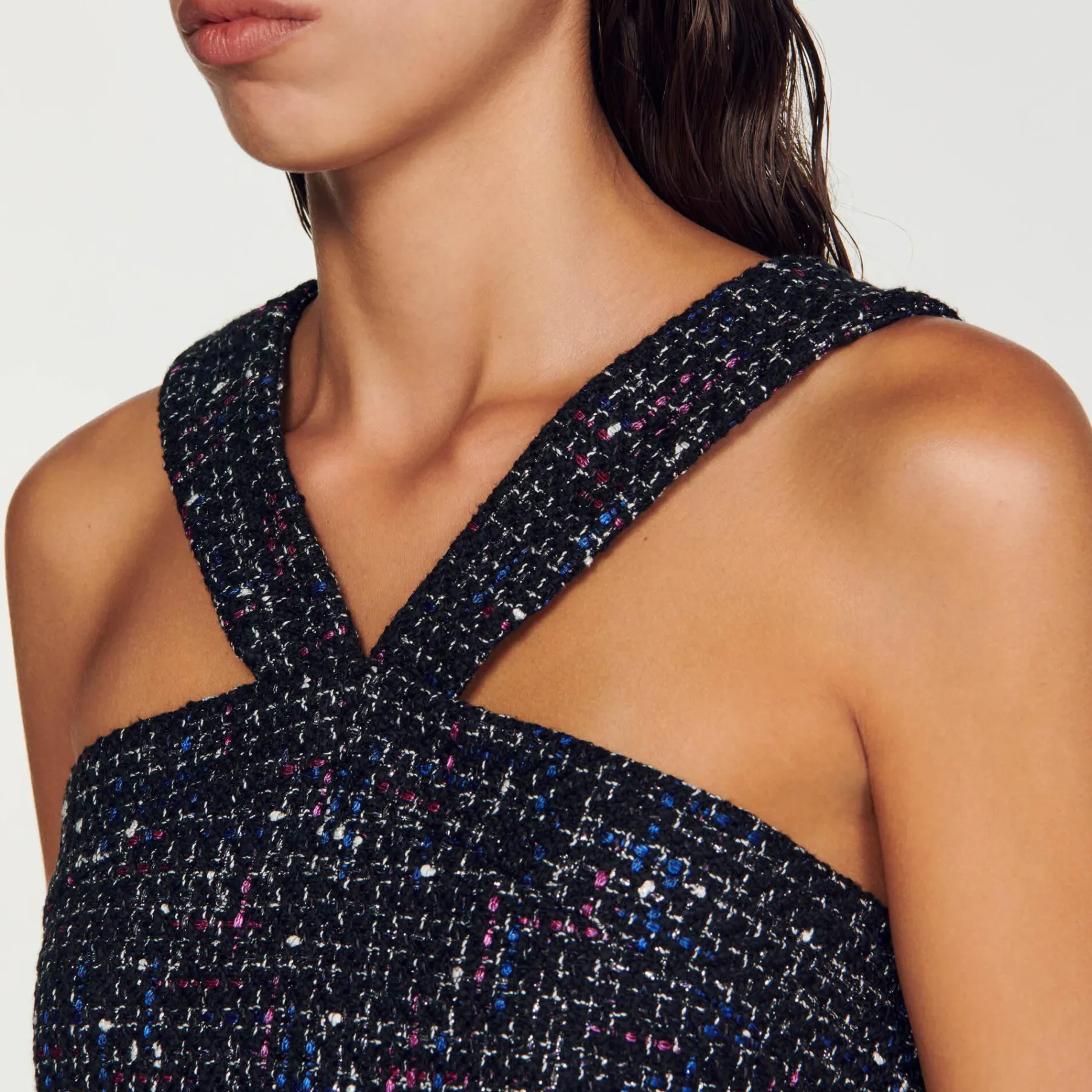 DescriptionSandro Women’s short tweed topFlat V-shaped strapsZip fastening This top matches the skirtand thejacket.Learn…