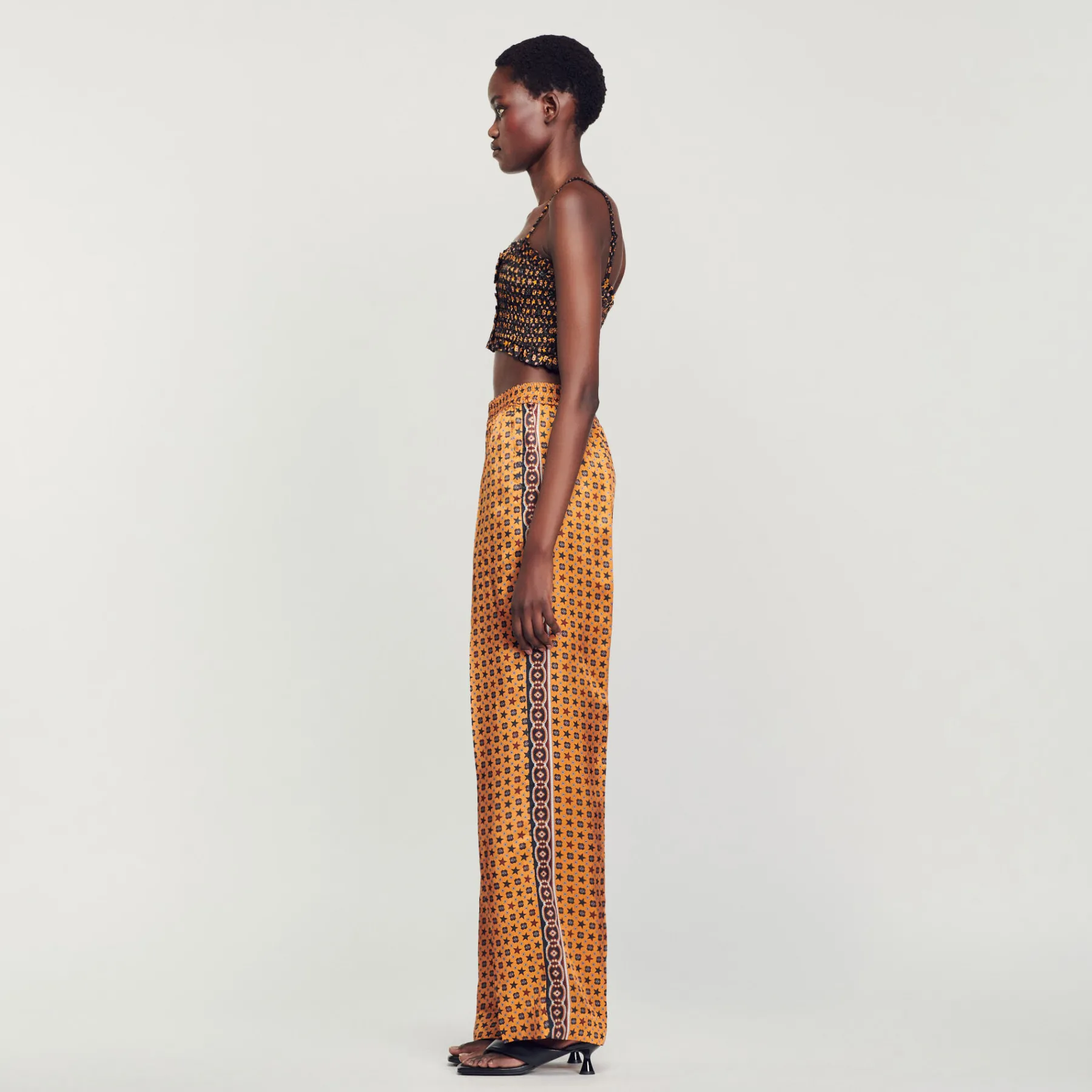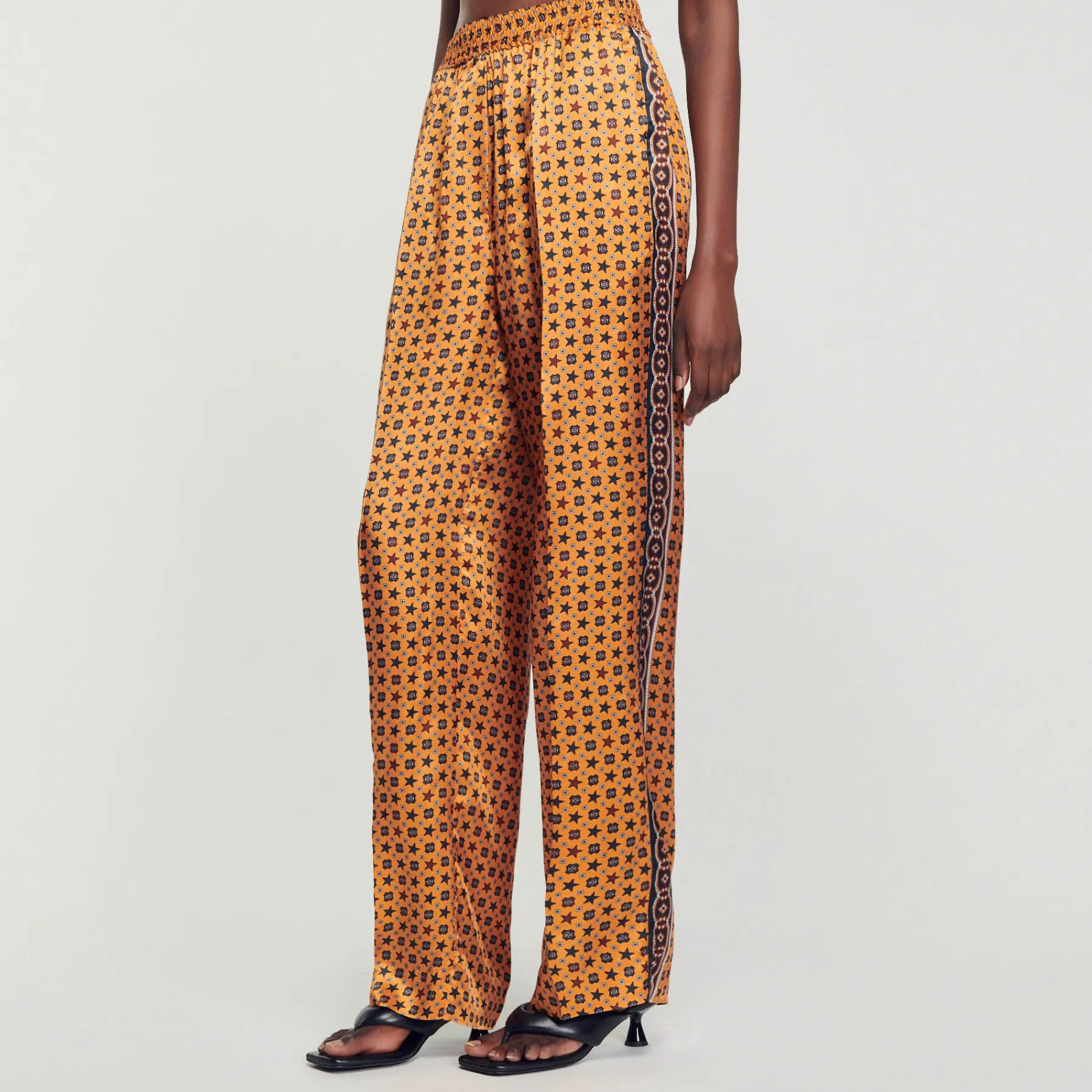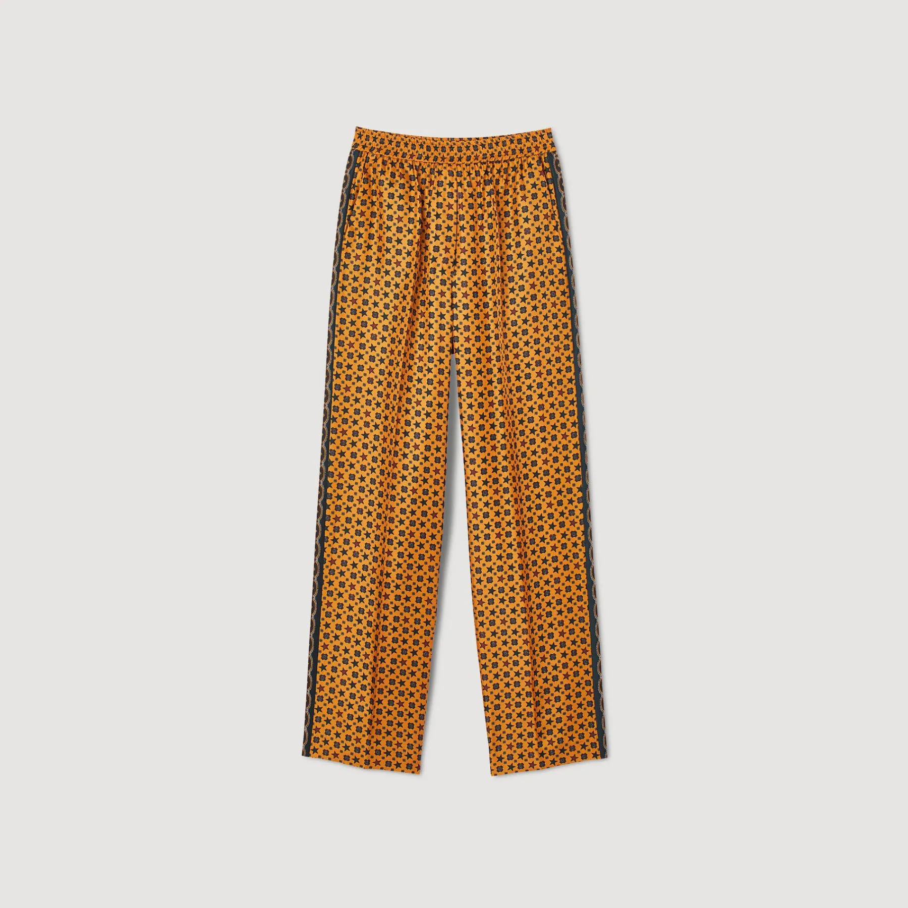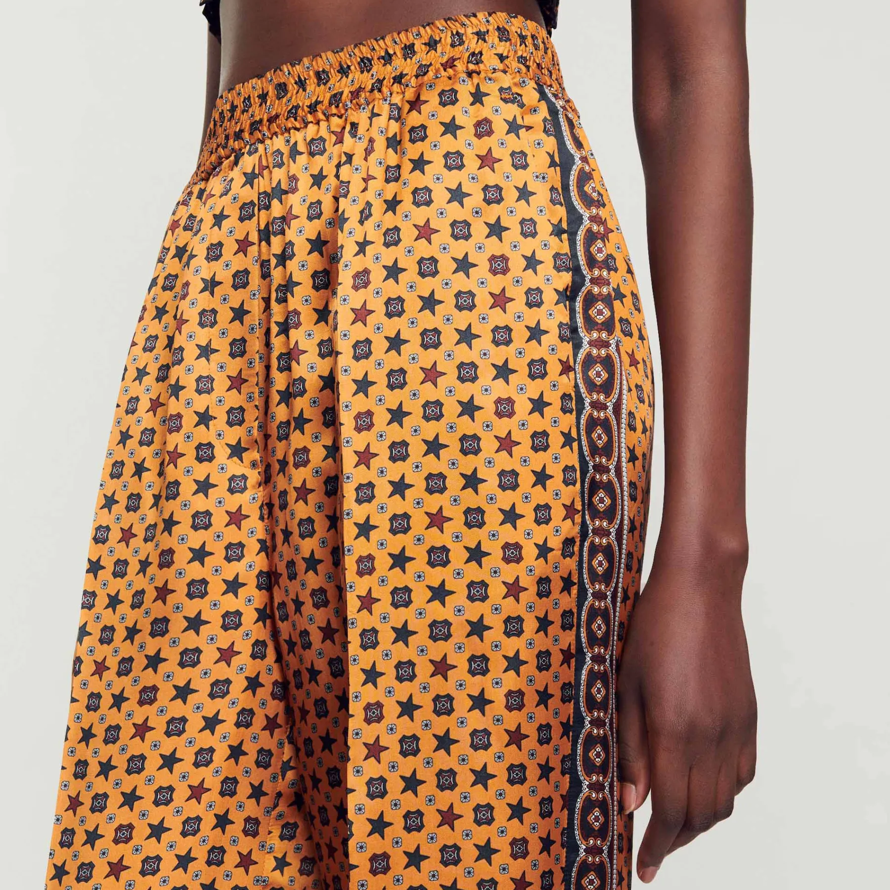 Flowing, loe-fit pants smocked at the waist, embellished with a scarf print and contrasting stripe on the side.