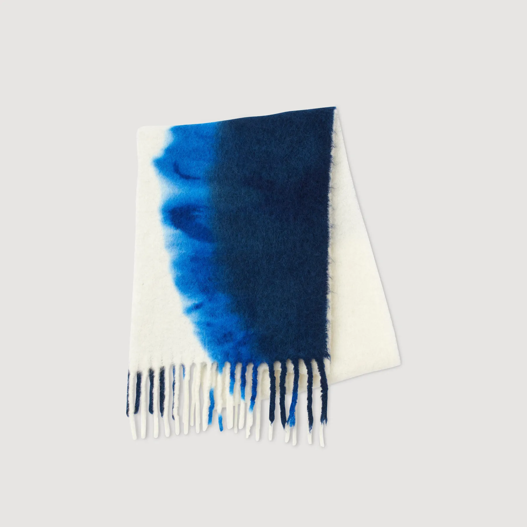 Two-tone dip dye alpaca blend scarf with fringed edges.