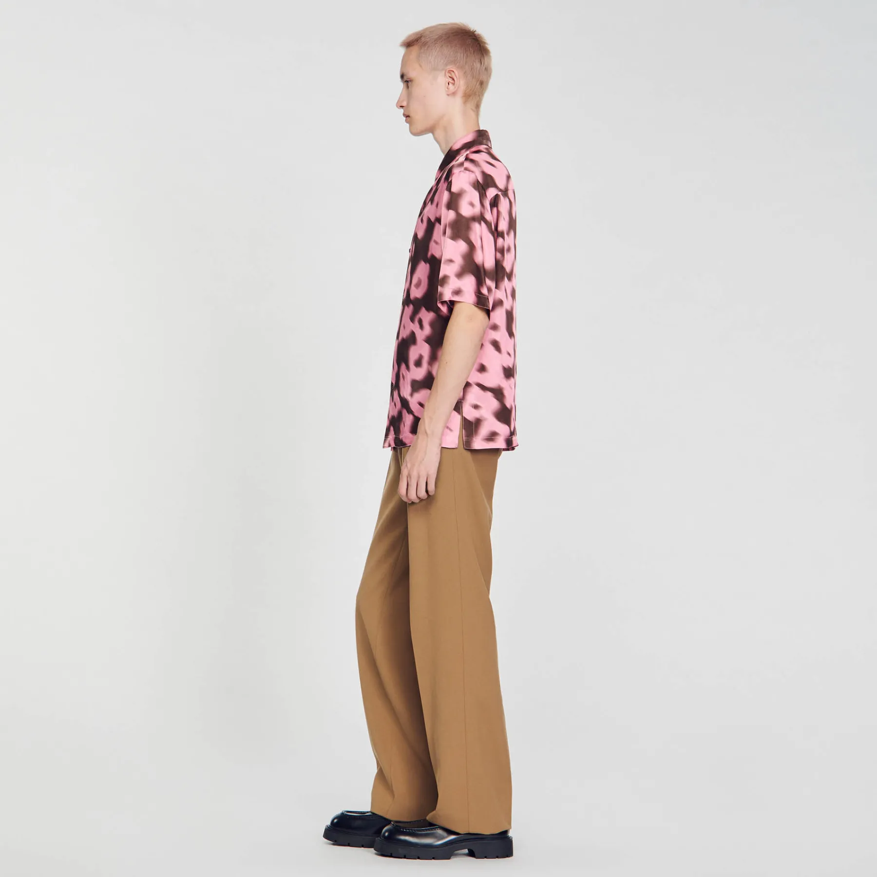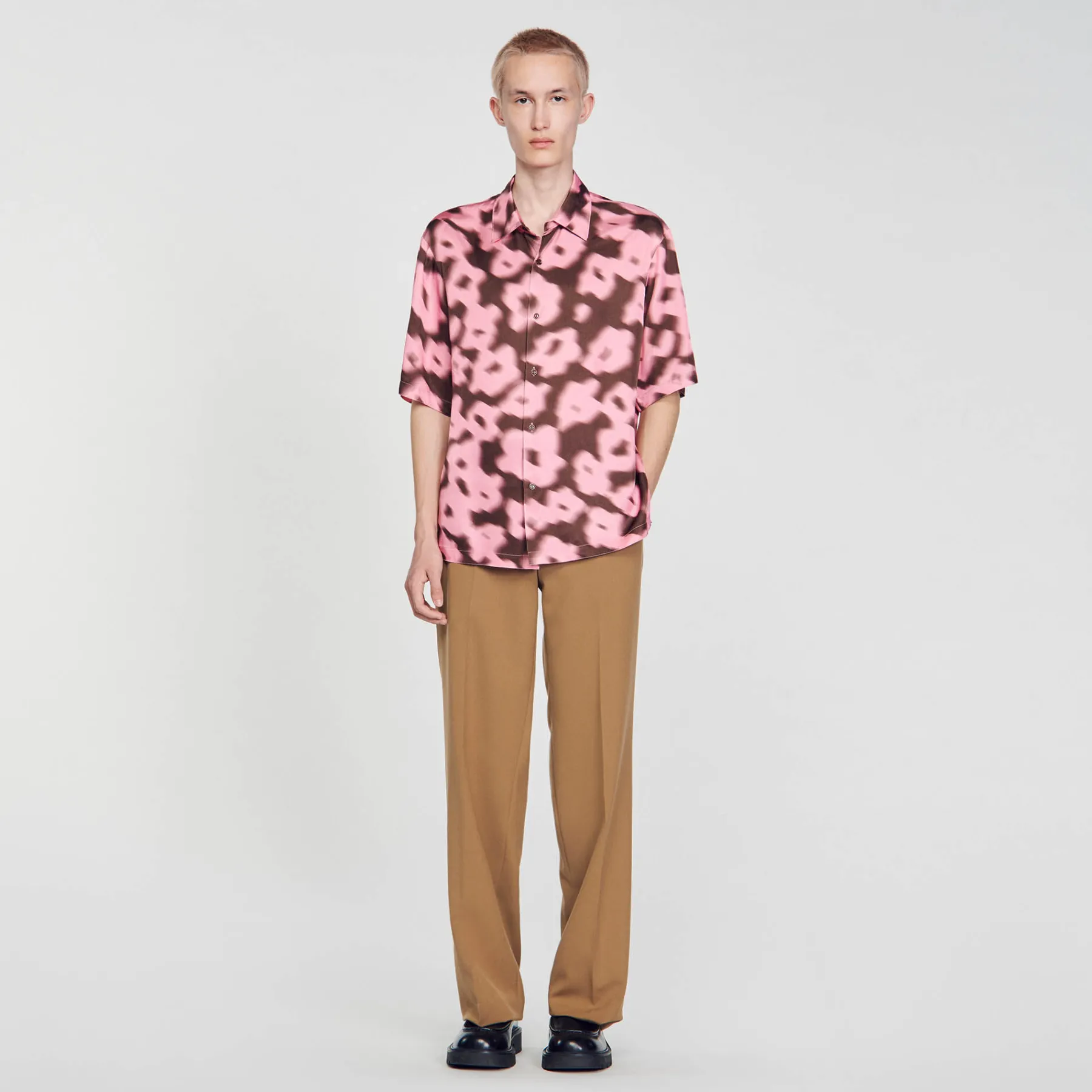 Oversized shirt with a blurred floral print fitted with a collar, button fastening and short sleeves.